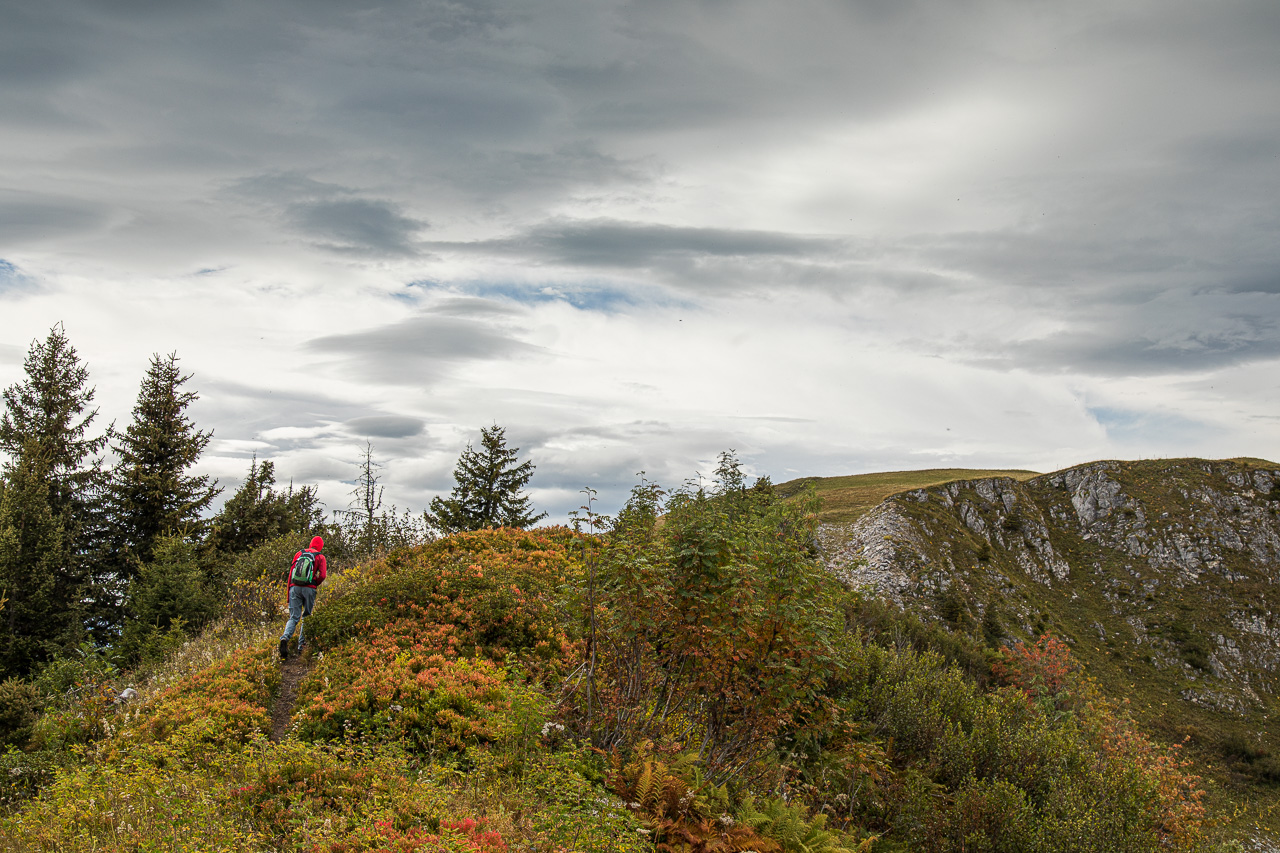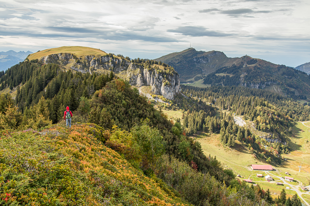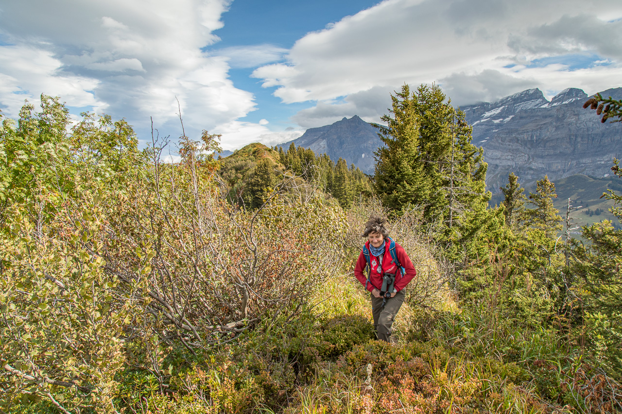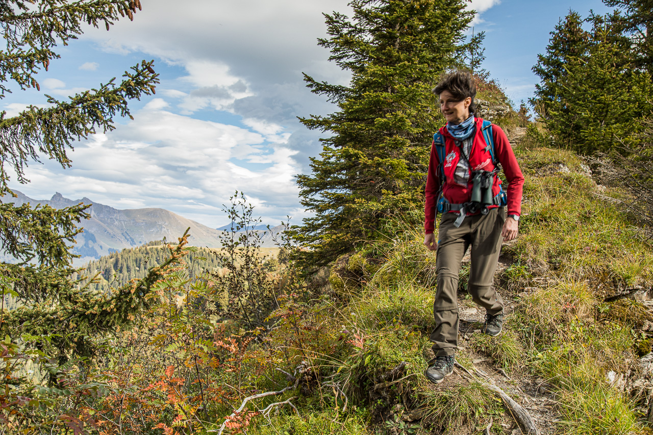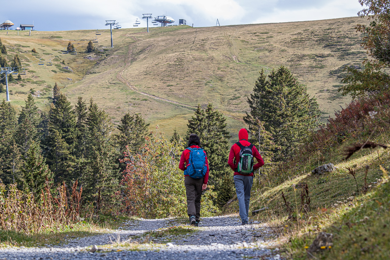 Der Start der Wanderung ist auf dem Col de Bretaye. Aber wie gelangen wir dorthin? Mit der Zahnradbahn! Erst recht natürlich, wenn sie gratis benutzt werden kann mit der „Free Access Card“, der Gästekarte. Wir tuckern und rumpeln hoch bis zur Endstation, der Zug ist gut gefüllt. Das wird wohl eng auf den Wanderwegen, so meine Befürchtungen. Nach der Ankunft drängen die Leute aufs Perron, stieben in alle Himmelsrichtungen davon. Gut, brauche ich jeweils einen Moment, bis ich parat bin. Kamera und Feldstecher hervorholen, Einstellungen überprüfen und angemessen kleiden. Wir gehen abwärts. Wo sind all die anderen Leute? Die sind in alle Richtungen davon, nur nicht in unsere. Sehr gut! Die Gegend ist zwar übersät mit Liftanlagen für den Winter, wenn man diese aber ignoriert, wandern wir in einer wunderschönen Moorlandschaft, die sich bereits ziemlich herbstlich verfärbt hat.