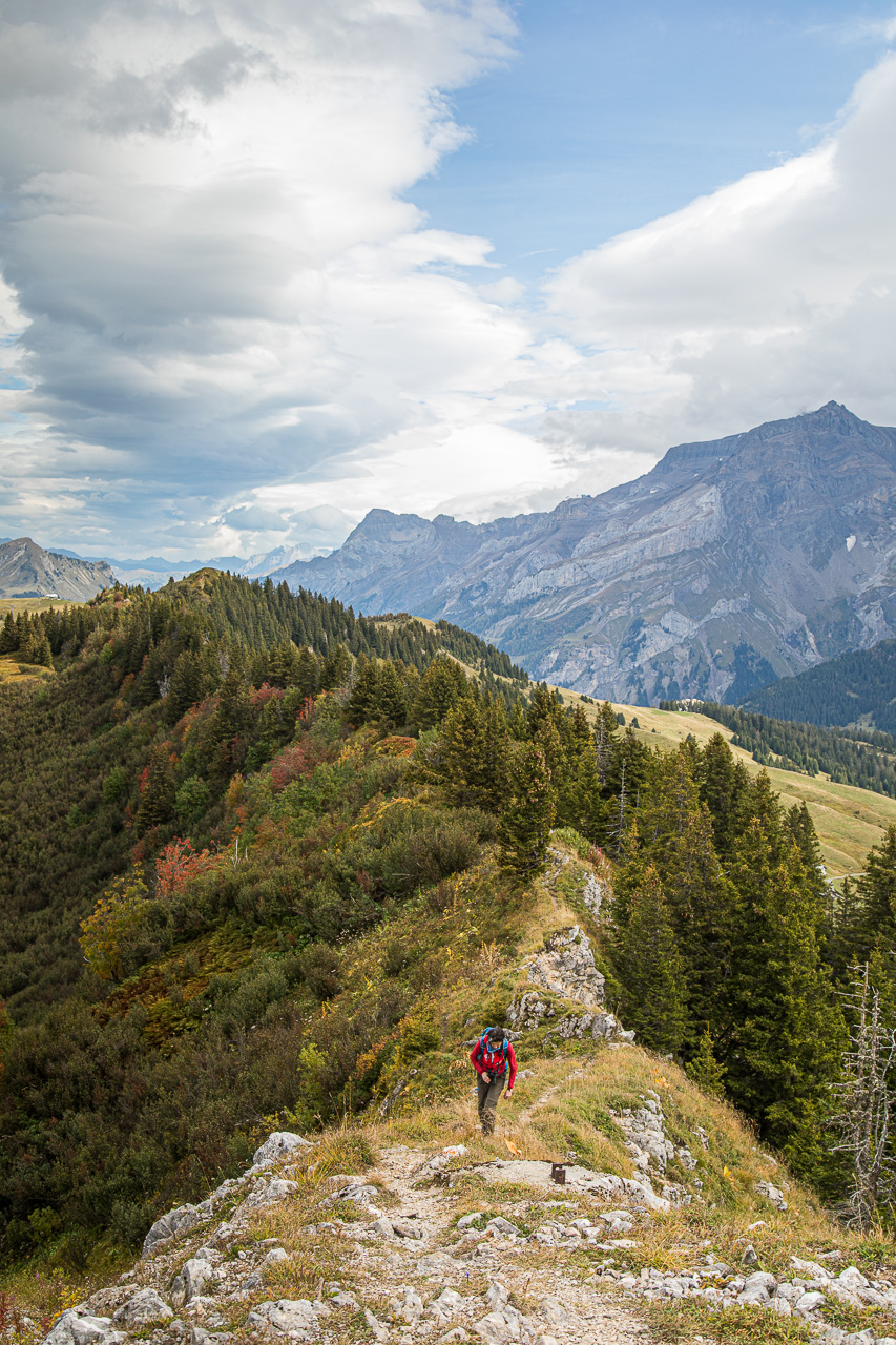 Wir haben die Wahl: Auf dem normalen Wanderweg gemütlich zurück zum Col de Bretaye oder über den Grat, über den Wanderweg führt, der in keiner Karte vermerkt ist? Natürlich entscheiden wir uns für den Grat! Der fängt harmlos an, dafür macht uns der Föhn zu schaffen, der heftig bläst. Bald fallen die Felsen südwärts steil ab. Als nordwärts der Hang auch noch steil und steiler wird, beschleicht mich ein mulmiges Gefühl, da immer wieder starke Böen einen fast aus dem Gleichgewicht bringen. Deshalb gehe ich umso konzentrierter. Die beiden anderen scheinen sich da keine Gedanken zu machen. Fabian sinniert, wie er den Grat mit dem Bike befahren könnte. Zum Glück bleibt es bei den Gedankenspielen.