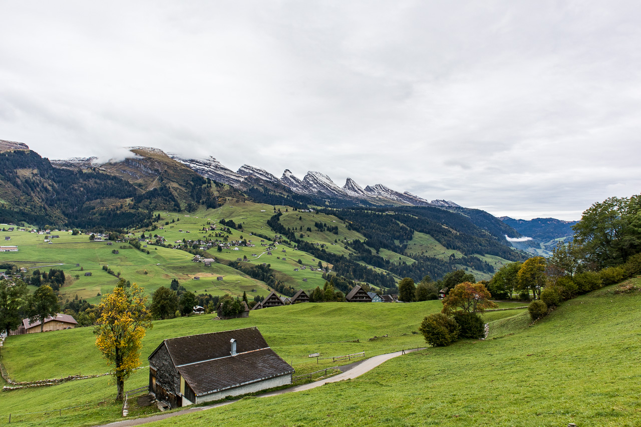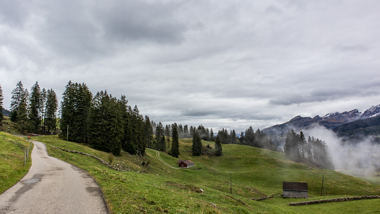 Wir starten direkt vor der Haustüre und kurbeln die Strasse hoch, an der Kirche vorbei. Die Steigung ist angenehm, nicht zu steil, aber man gewinnt doch stetig an Höhe. Das Wetter ist durchzogen, die Strassen sind erst am Abtrocknen. Die Churfirsten vis-à-vis sind noch weiss überzuckert.