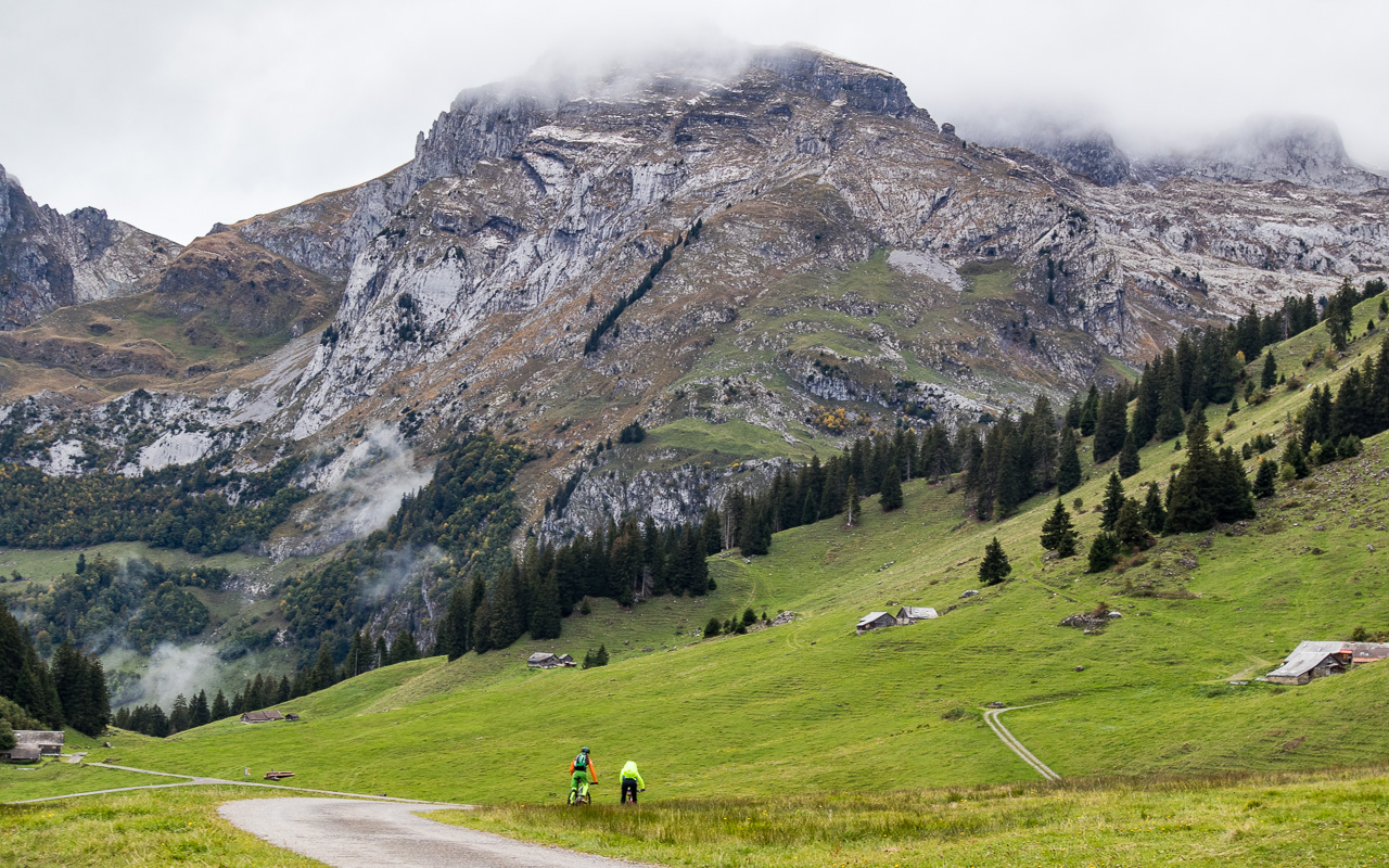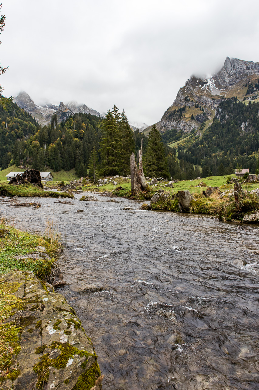 Bald haben wir den höchsten Punkt erreicht, auf einem kurzen Singletrail fahren wir zum Restaurant Gamplüt – und daran vorbei. Denn Silvan wartet weiter unten auf uns, er wollte keinen Meter zusätzlich machen. Wir fahren ab über die Alp Gamplüt, dann steil abwärts durch den Wald, wo wir so richtig verdreckt werden. Durch die Alp Laui fliesst die junge Säntisthur, die Berge sind immer noch teilweise in Wolken verhüllt.