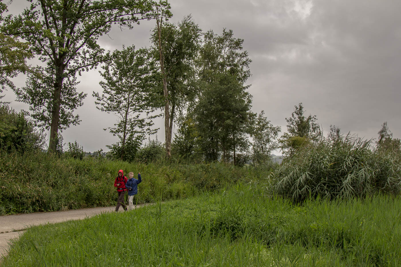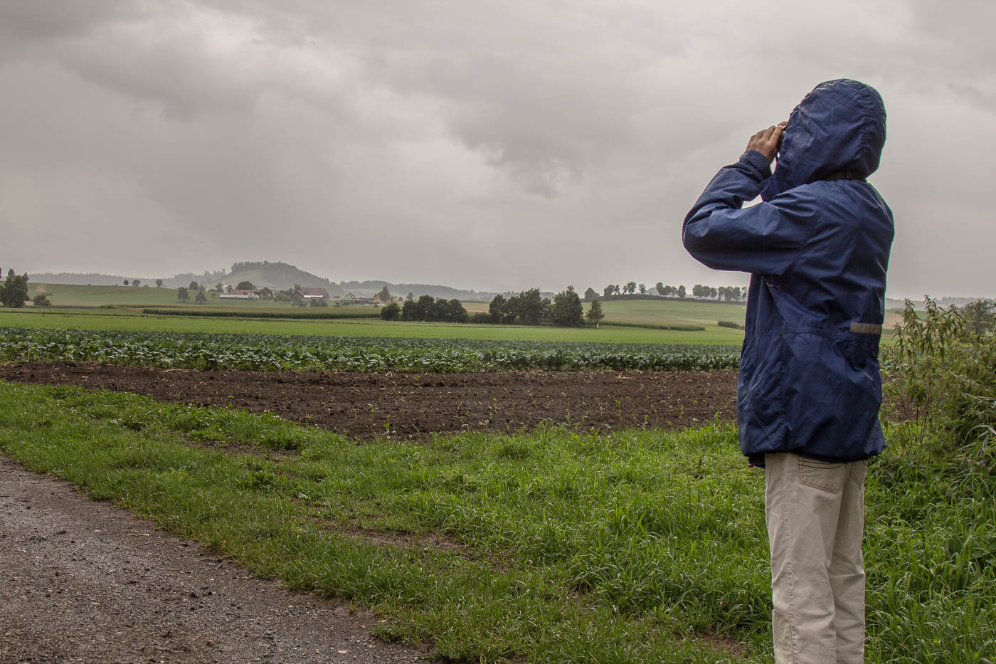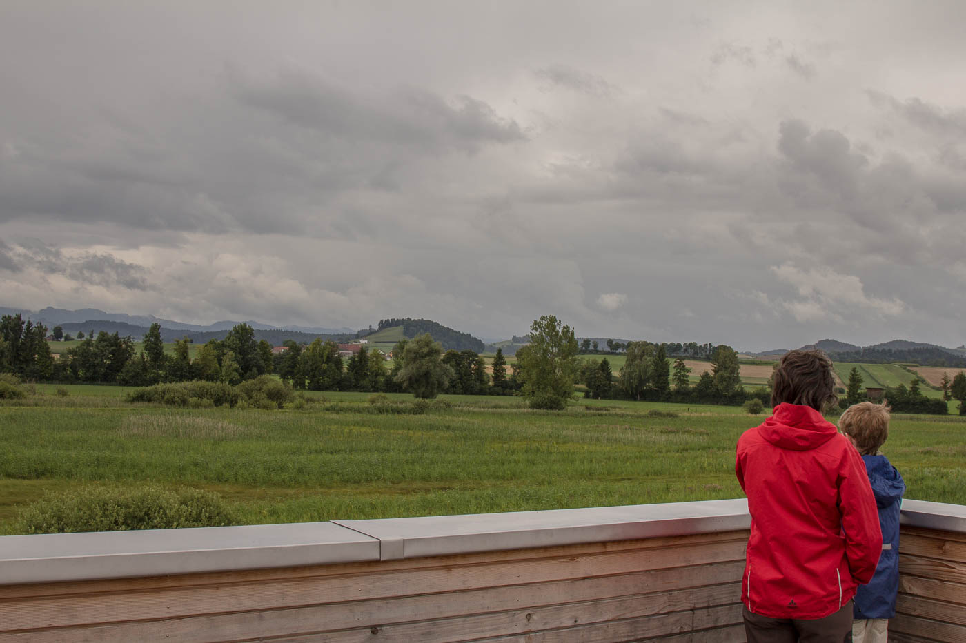 Wenn es zu regnen beginnt, so wie jetzt eben, zieht man sich wieder in den ersten Stock zurück, wo man im Trockenen picknicken kann. Uns zieht es bald wieder nach draussen, Regen hin oder her. Man kann das ganze Naturschutzgebiet gut umrunden, ohne sich die Schuhe allzu schmutzig zu machen. Augenfällig wird beim Rundgang, wie abrupt der Wechsel ist von Natur und intensiver Landwirtschaft.