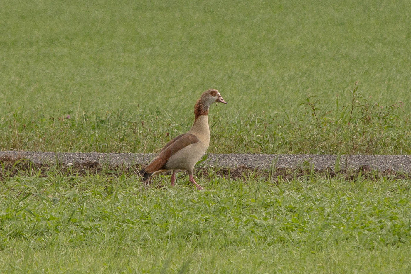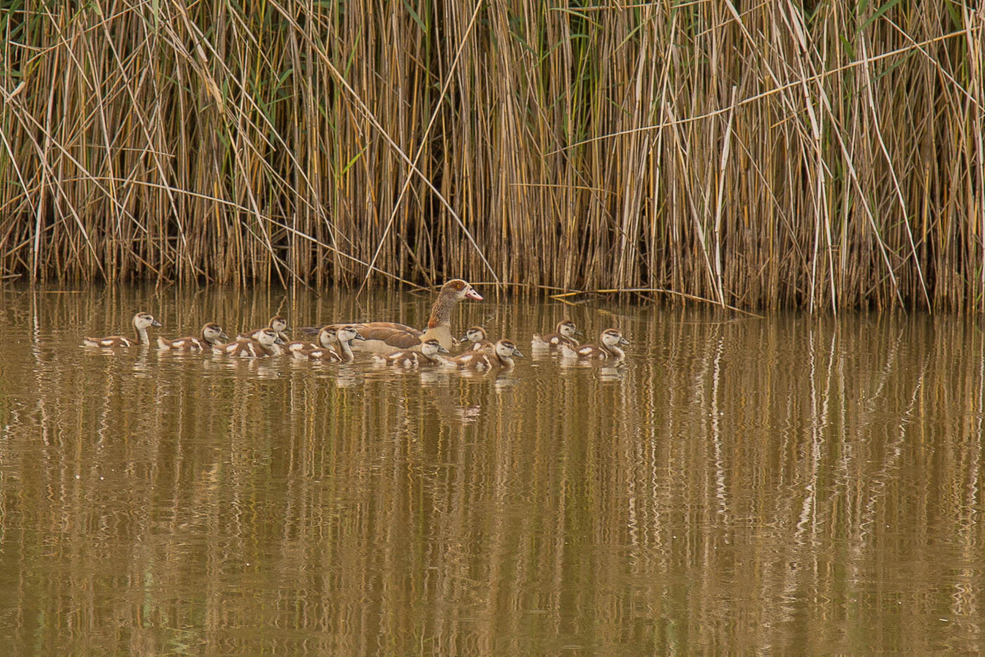 Im Gras entdecken wir eine Gans: Eine Nilgans, eine nicht einheimische Gänseart, die freigesetzt wurde. Kurz darauf kommt auch das Männchen angeflogen. Und nochmals einige Zeit später sehen wir die ganze Familie: Männchen, Weibchen und elf Junge! Das sieht zwar süss aus, ist aber problematisch, da die Nilgans eine invasive Spezie ist, die einheimische Arten verdrängt. Birdlife Schweiz hat dazu ein Positionspapier veröffentlicht.