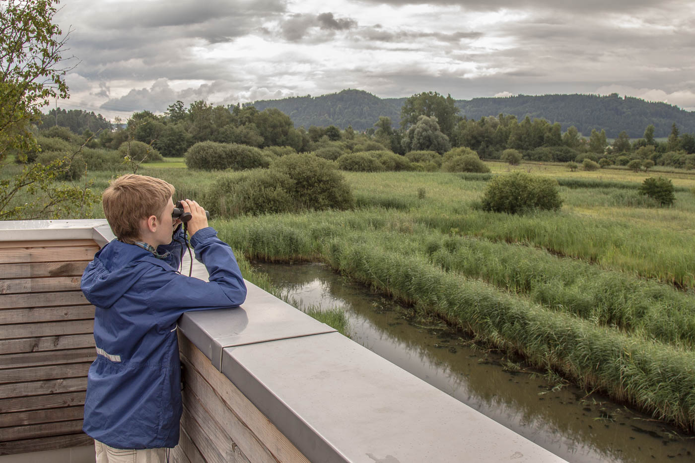 Eigentlich sollten wir ja jetzt auf der Panorama Bike sein. Das Wetter ist aber launisch, so dass wir unsere Ausflüge von zu Hause aus machen. Im Wauwiler Moos gibt es seit diesem Frühling einen neuen Aussichtsturm, der schöne Einblicke in das Feuchtgebiet gewährt. Wir machen uns also auf nach Wauwil und wandern den öden Betonweg zum Turm. Die Landschaft ist wie vielerorts in der Schweiz: Intensiv bewirtschaftet, artenarme Fettwiesen statt wertvolle Blumenwiesen, Monokulturen mit Mais. Da tut es gut, mittendrin eine Naturoase zu wissen. Turmfalken rütteln über uns. Beim Turm wurden frische Tümpel angelegt, Hecken und Schilf bieten Unterschlupf.