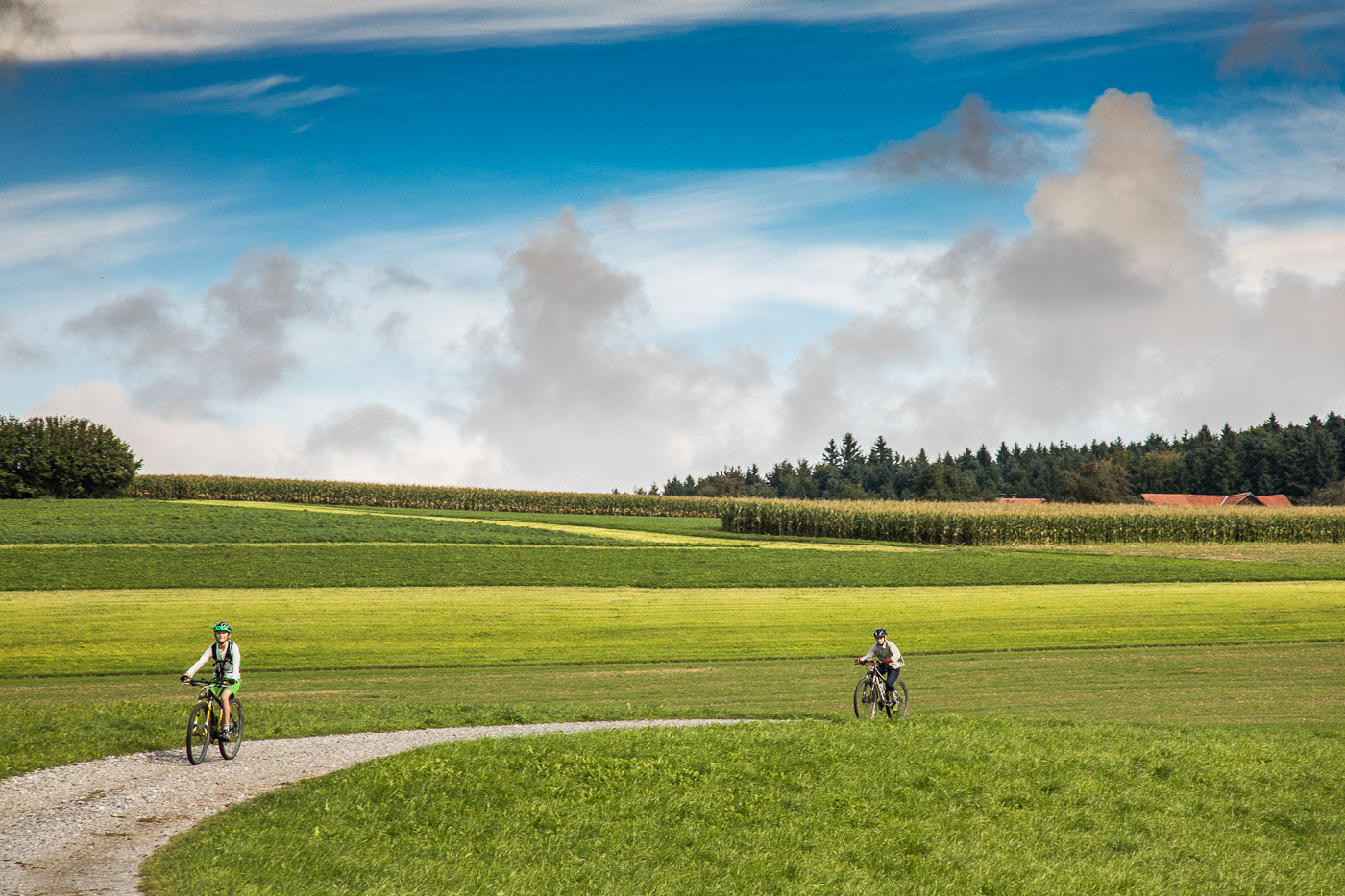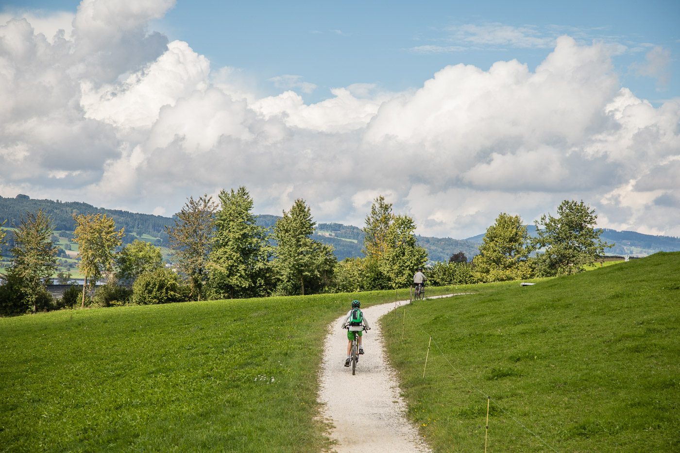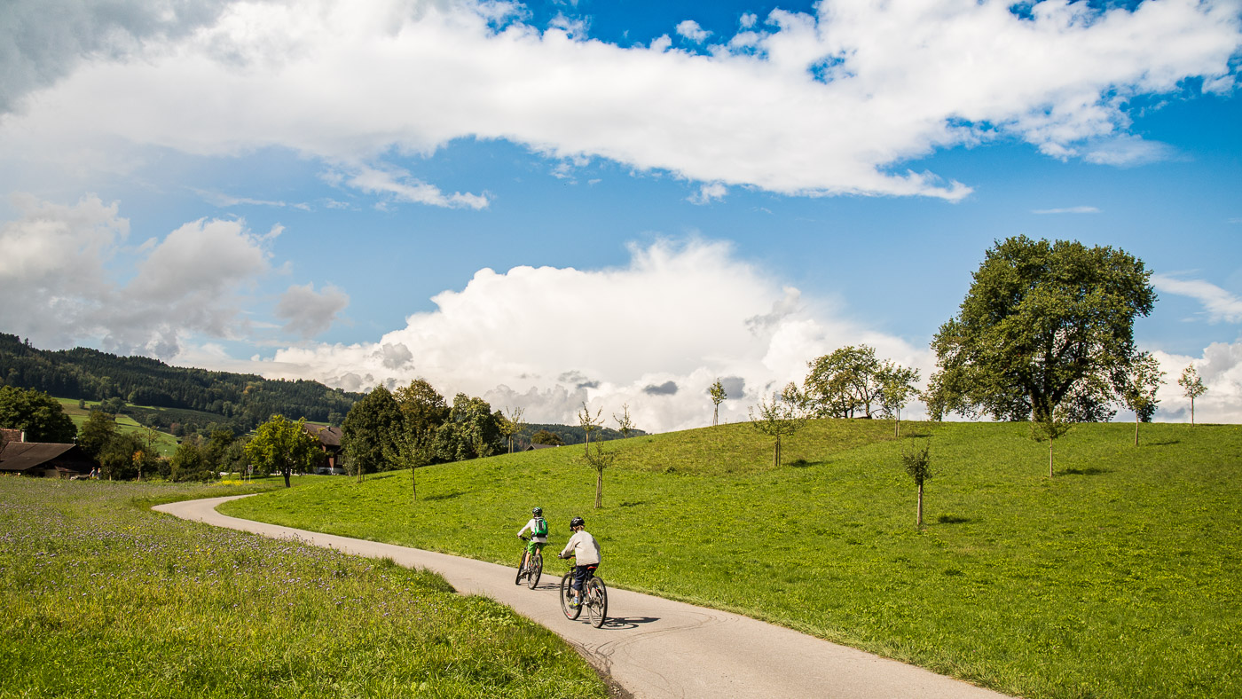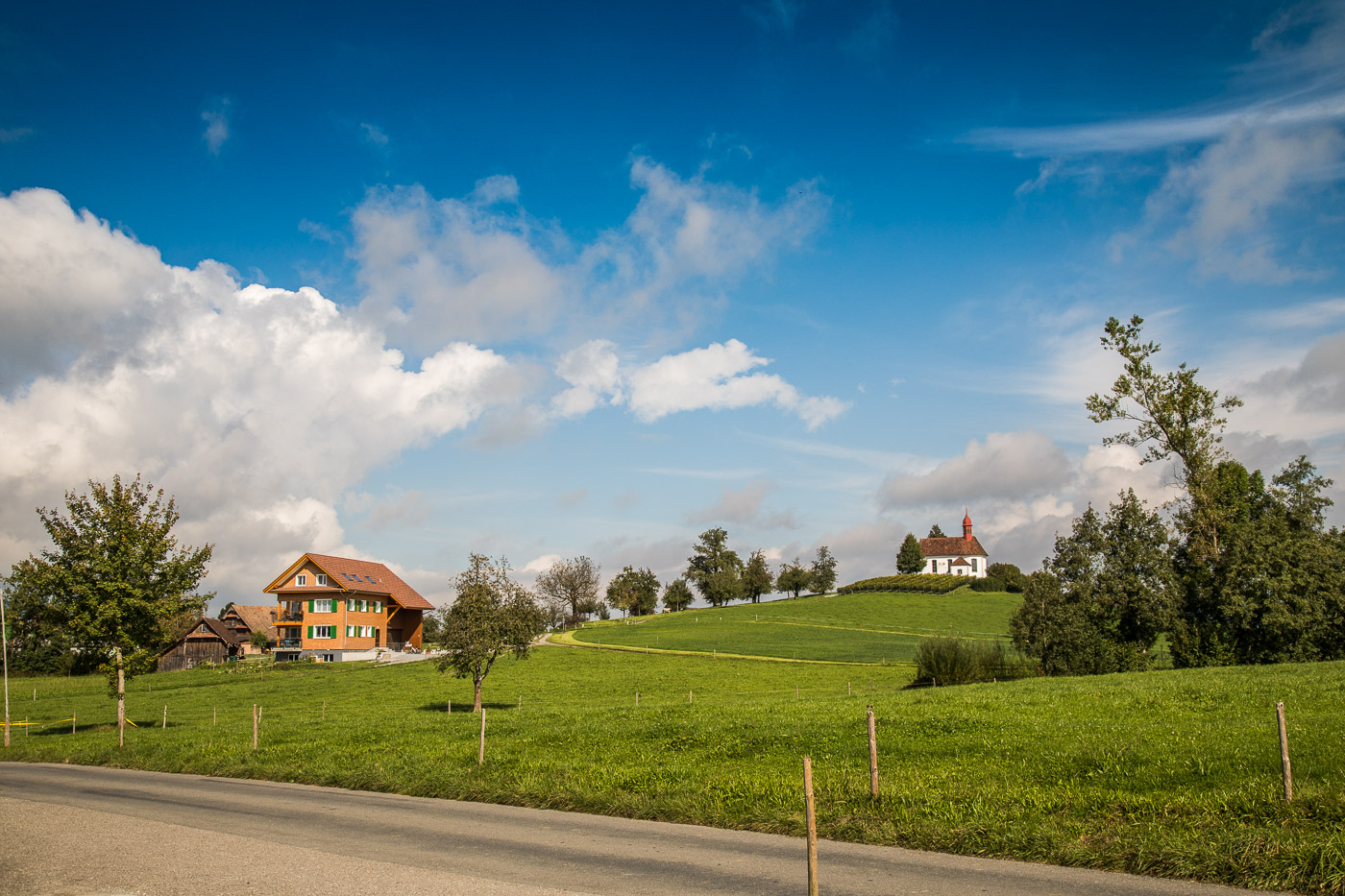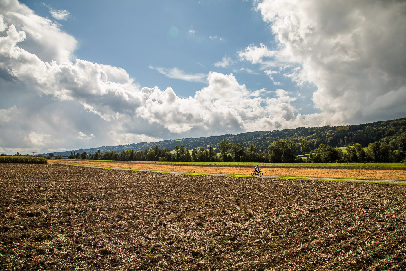 Eigentlich kenne ich die Strecke der Herzschlaufe Seetal ja schon, ich bin sie im letzten November gefahren. Aber gerade den Teil zwischen dem Golfplatz und Ballwil habe ich nicht so richtig mitbekommen – es herrschte dichter Nebel. Dies ist nun anders. Die Septembersonne scheint angenehm vom Himmel, wir fahren ohne Jacke nach Beromünster, dort weiter zum Golfplatz Hildisrieden. Von Älmeringen radeln wir über Felder und durch Wälder, mal auf Asphalt, mal auf Schotterwegen. Wir hätten eine tolle Aussicht in die Innerschweizer Alpen, diese bleibt uns aber heute verwehrt wegen den dicken Wolken, die dort hängen. Na ja, dafür haben wir hier Sonne, während es in den Bergen (mutmasslich) regnet oder zumindest Nebel hat.