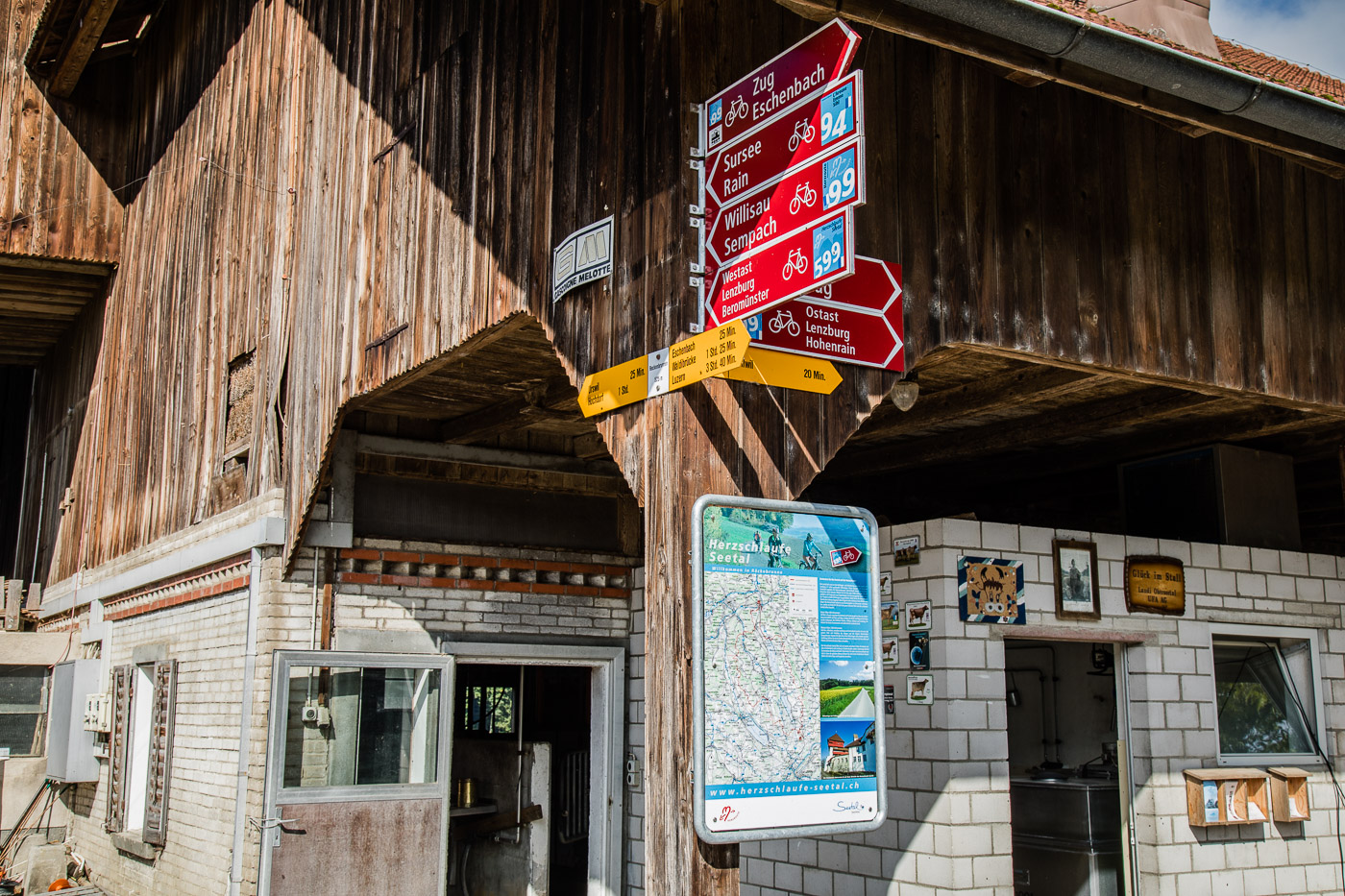 Den grössten Teil der Höhenmeter haben wir bei Gundelinge, nun geht es abwärts ins Seetal nach Urswil und weiter nach Reckenbrunnen. Das scheint so eine Art Verkehrsknotenpunkt zu sein, wenn man die Beschilderung so anschaut.