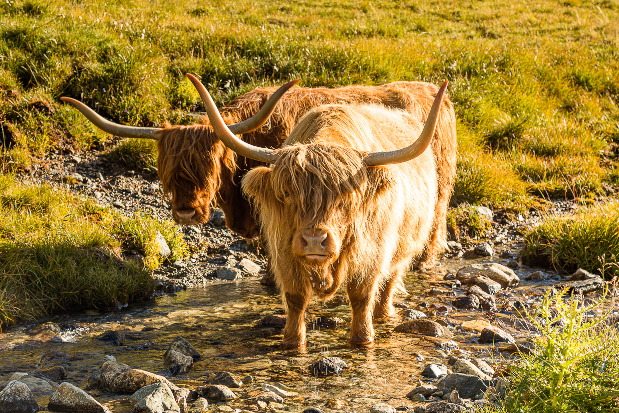 Unter uns liegen die Seen noch im Schatten. Die Vögel machen sich immer noch rar, wir steigen weiter hoch in engen Kehren, bis wir eine Ebene erreichen. Der Bergbach, genauer der Inn, plätschert, eine Gebirgsstelze sucht an dessen Ufer nach Nahrung. Und dann sehen wir die ersten Steinböcke, schottische! Ach nein, es sind Hochlandrinder, die da gemütlich am Wegrand grasen und uns bestenfalls desinteressiert anschauen.
