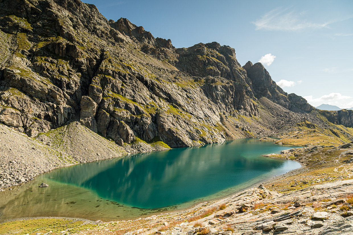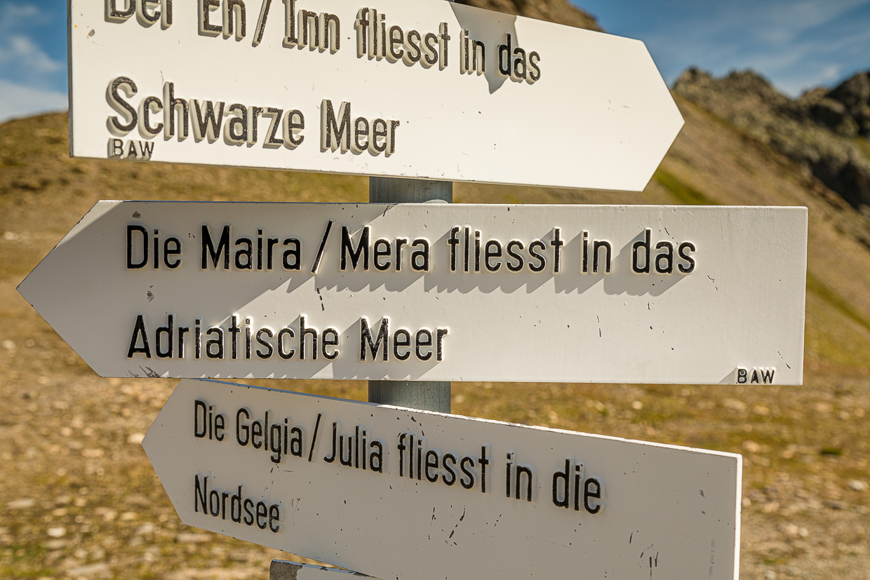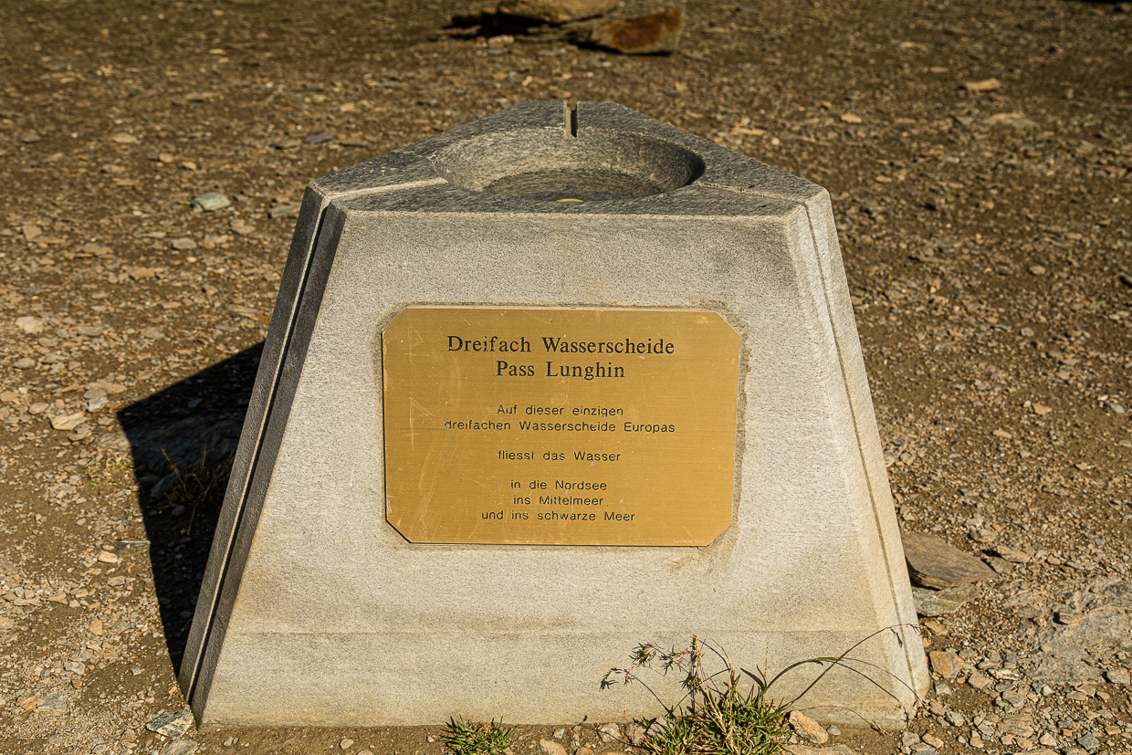 Jetzt geht es ziemlich steil aufwärts zum Lägh dal Lunghin, der in einer Senke liegt. Smaragdgrün leuchtet das Wasser. Wir halten uns nicht auf dort, steigen hoch zum Pass dal Lughin. Der beherbergt etwas Besonderes: Die einzige Dreifachwasserscheide in Europa. Ein Regentropfen, der hier fällt, fliesst entweder via Inn und Donau ins Schwarze Meer, via Julia und Rhein in die Nordsee oder via Mera und Po in die Adria. Faszinierend.