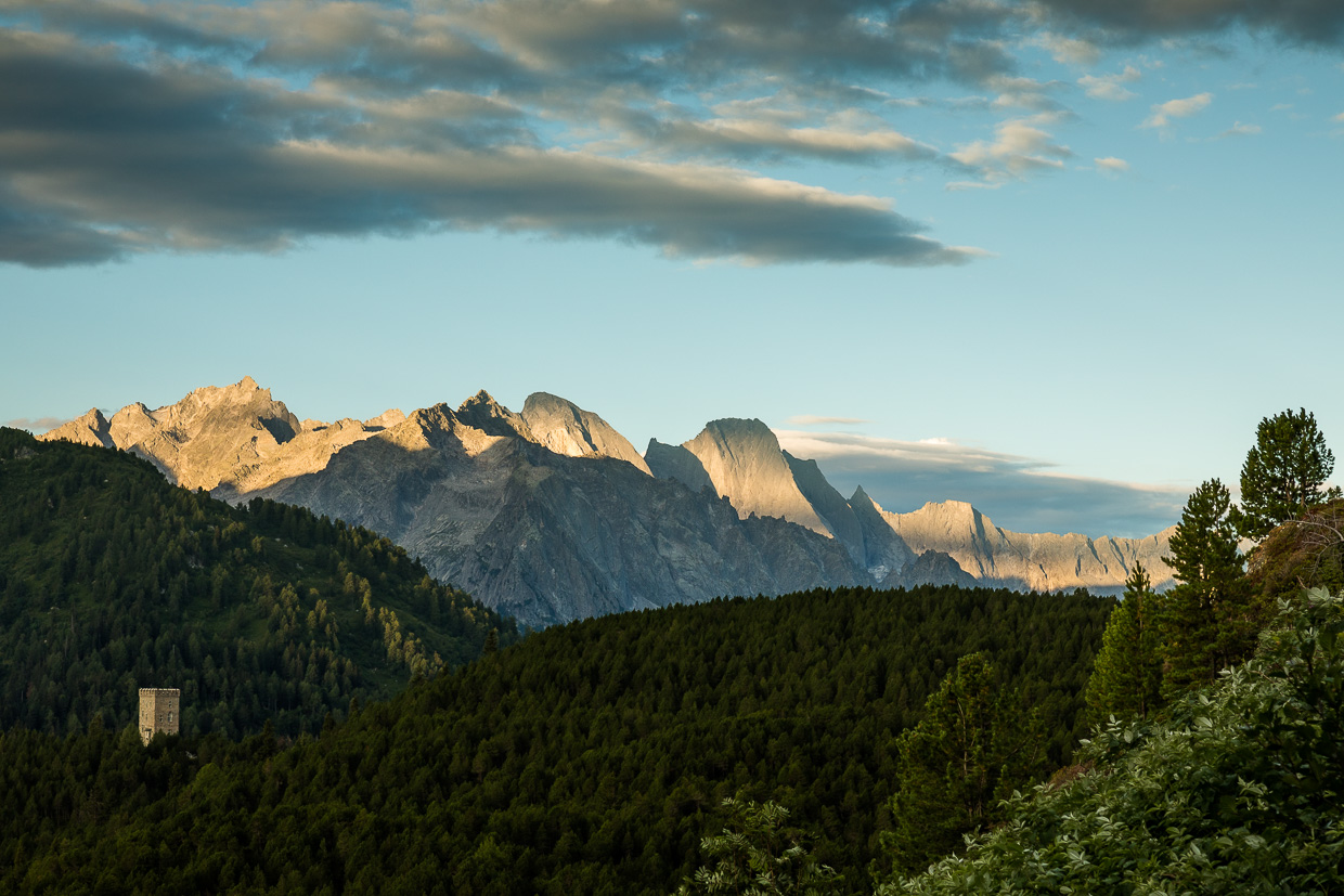 Noch früher als sonst, nämlich um sechs Uhr, starten wir vor der Haustüre. Wir hoffen, scheue Vögel zu sehen, die eher am frühen Morgen unterwegs sind. Wir durchqueren das Dorf und steigen beim letzten Restaurant Richtung St. Moritz hoch durch den Wald. Es ist noch still, die erhofften Vögel machen sich noch nicht bemerkbar. Weiter geht der Weg hoch über Alpwiesen, immer noch im Schatten. Erst als wir schon ziemlich Höhe gewonnen haben, steigt die Sonne hinter den Bergen empor.