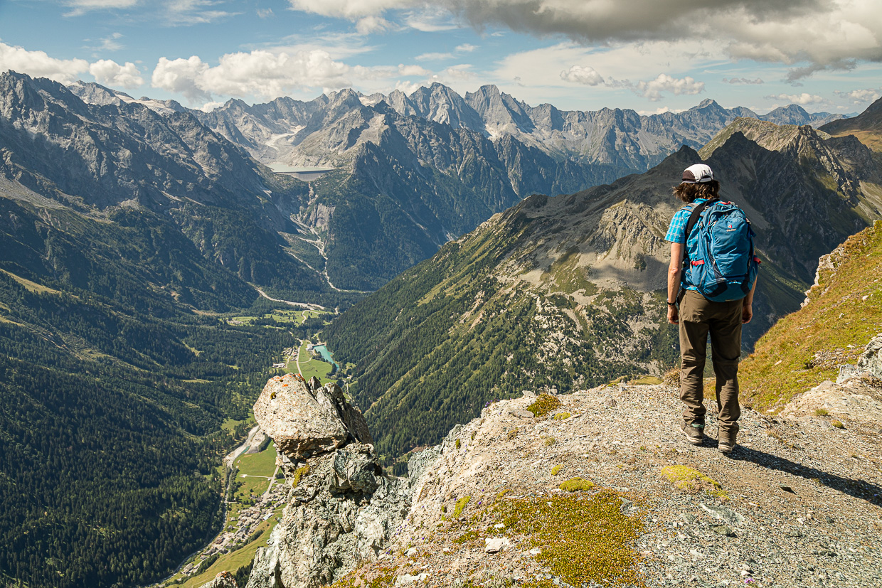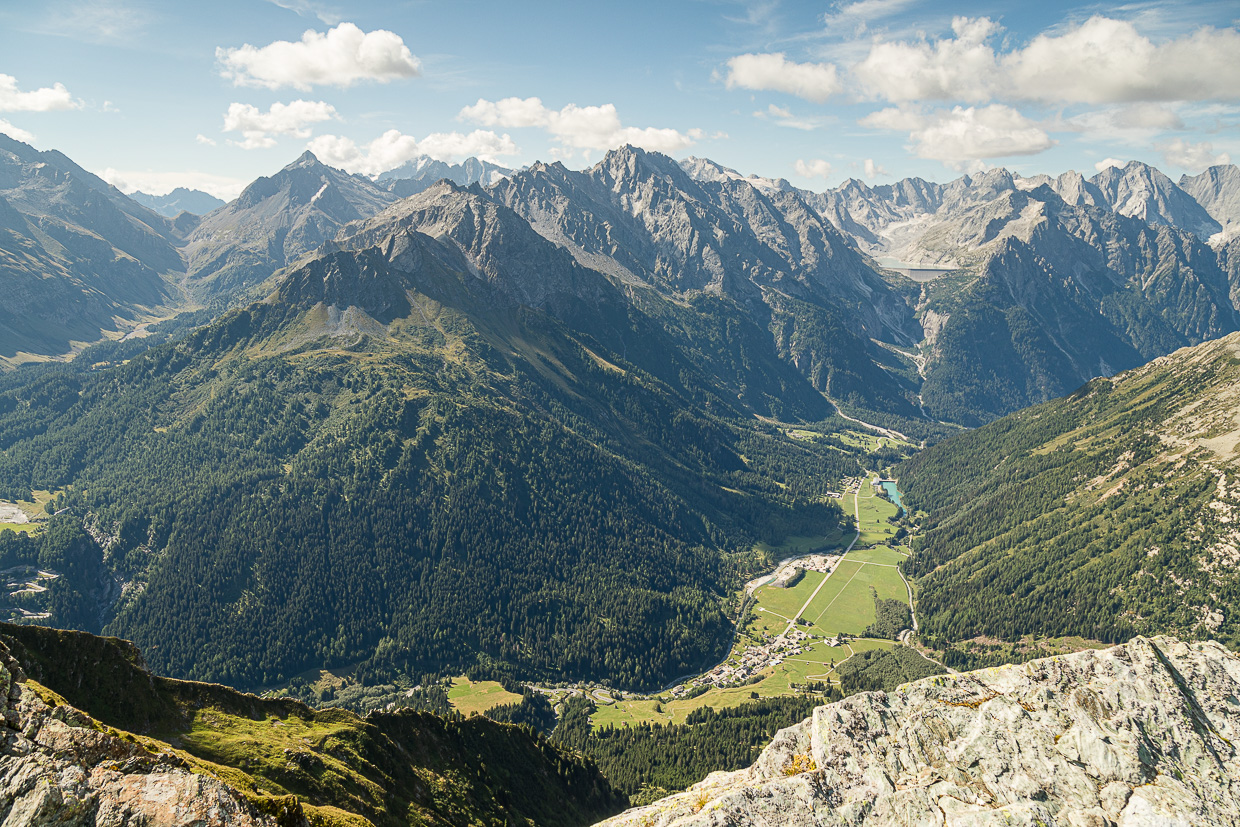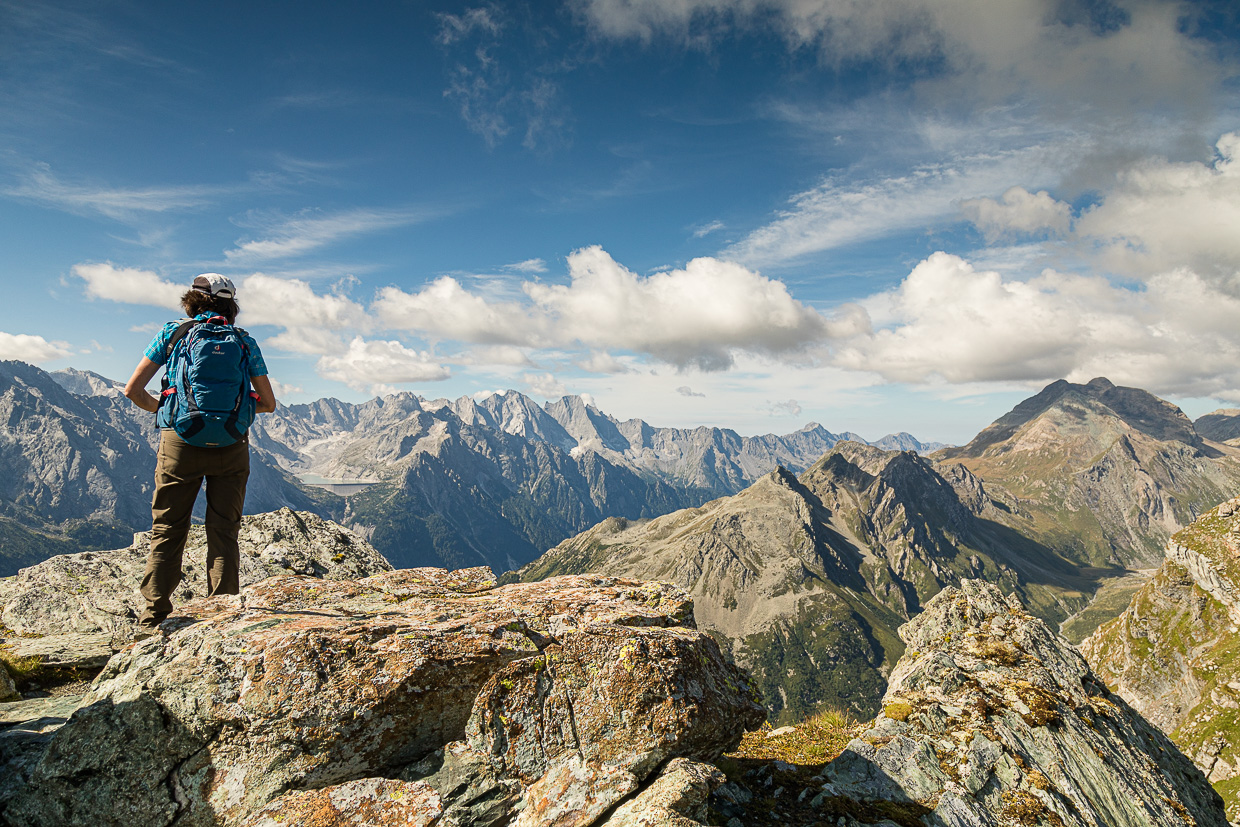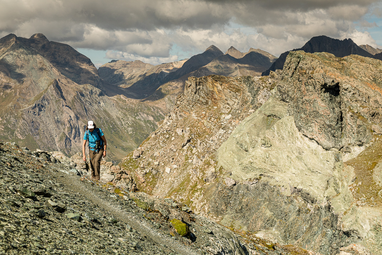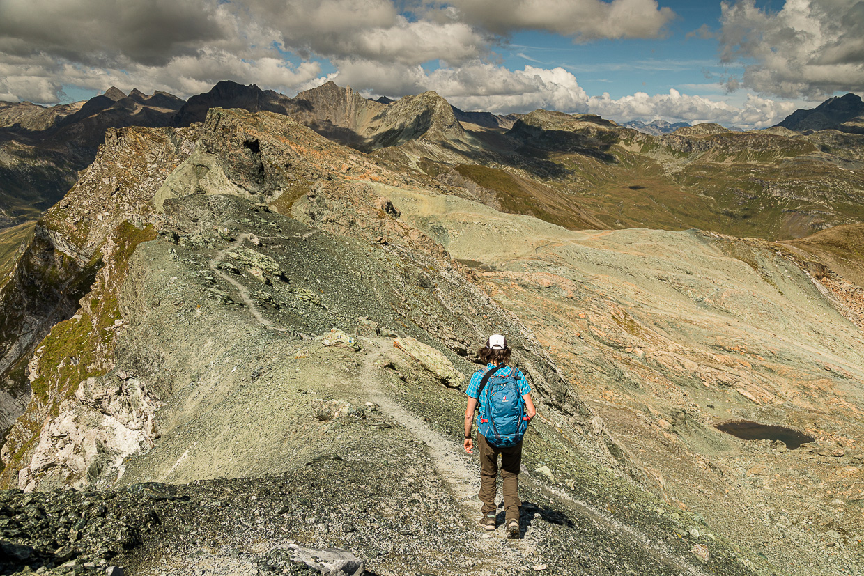 Es ist nicht mehr weit zum Gipfel, die Landschaft wird karger, steiniger. Auch rundum ist das Grün der Bergwiesen, dem Grau-Braun der Felsen gewichen. Wir erreichen einen Grat und blicken fast senkrecht ins Bergell hinunter. Kurz vor dem Gipfel kommen wir an eine kleine Felswand mit dem blau-weiss-blauen Wegzeichen drauf. Ob wir jetzt links oder rechts gehen müssen, wird aber nicht klar. Wir versuchen es rechts und klettern eine Platte hoch, kurz darauf stehen wir auf dem Gipfel.