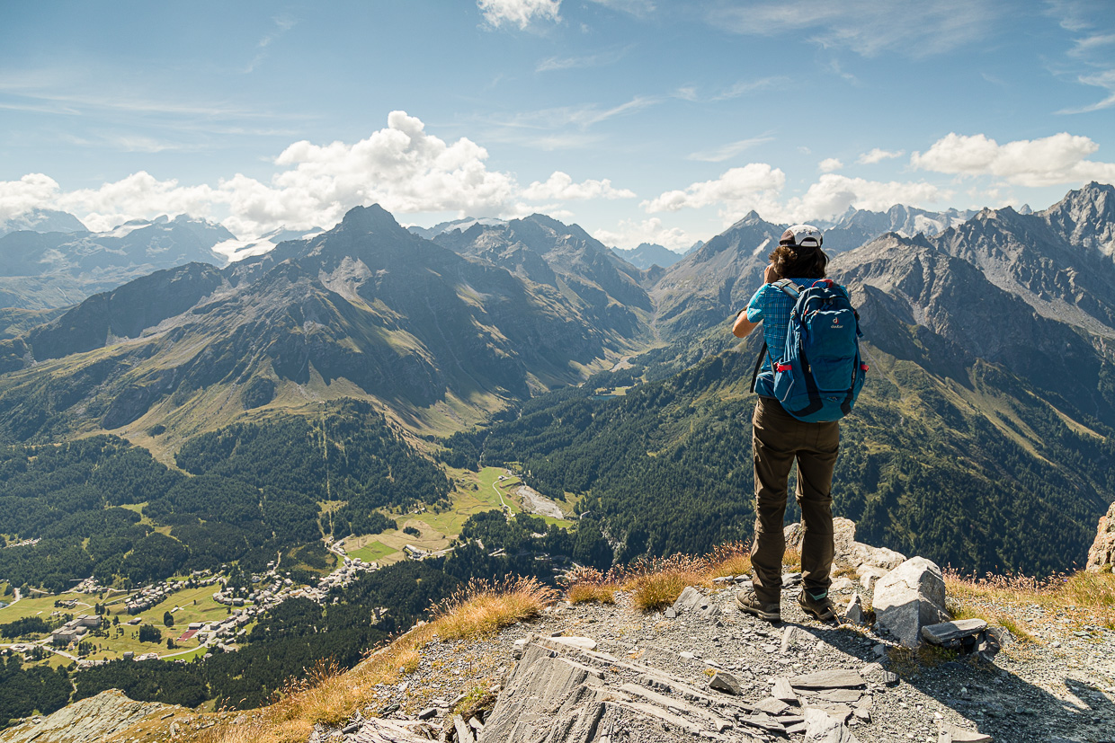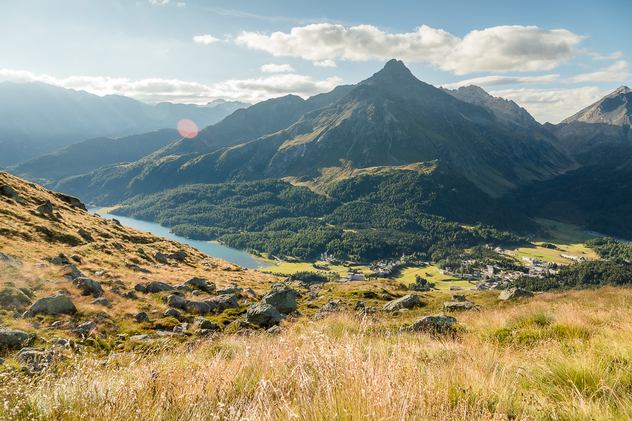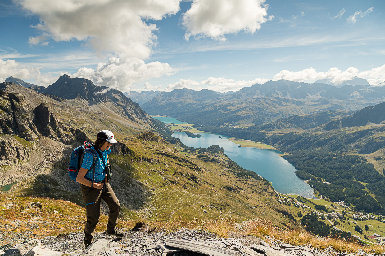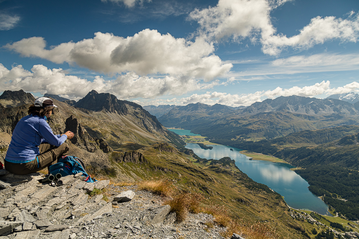 Was für eine Aussicht! Weit unten glitzern Silvaplaner- und Silsersee, hunderte Gipfel erheben sich rundherum. Wir blicken rüber ins Albignagebiet, wo unsere Jungs in einer Kletterwoche sind. Ob man sie wohl sehen kann? Ich nehme das Fernglas, kann aber niemanden entdecken, ist wohl doch zu weit weg.