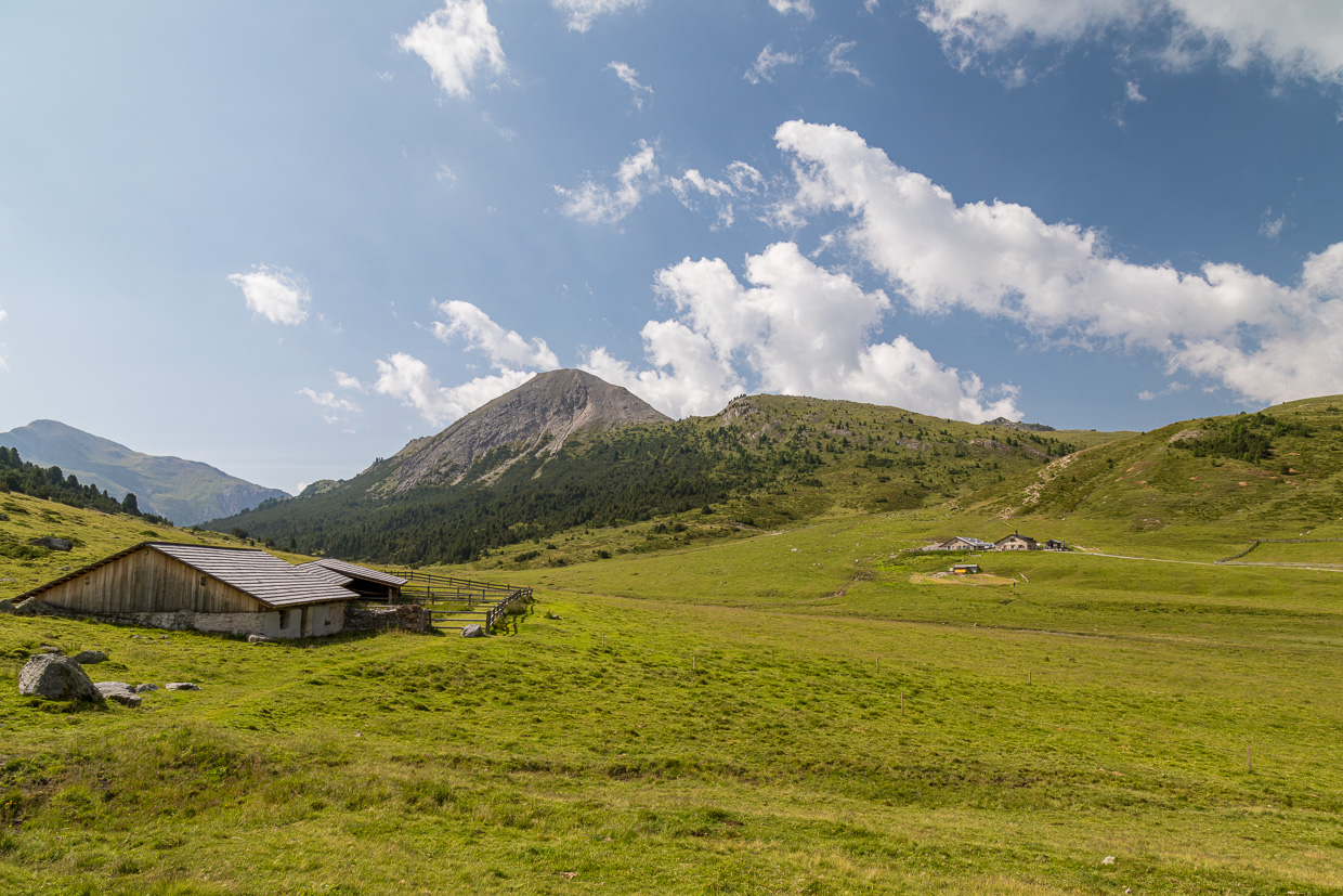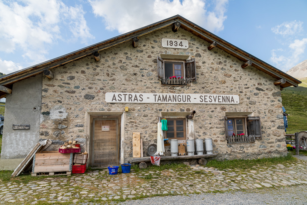 Wir blicken in das weite Tal hinein, Wolken ziehen über die grauen Berge. Ein Karrweg leitet uns durch die locker stehenden Bergkiefern. Bei der Alp Astras gibt es einen Kaffee, frisch gebraut. Ein älteres Ehepaar, elegant angezogen, in weissen Kleidern, ohne Rucksack, will so gar nicht in die Gegend passen. Aber sie seien schon öfters hier gewesen, es sei wunderschön hier. Dem können wir bedingungslos beipflichten.