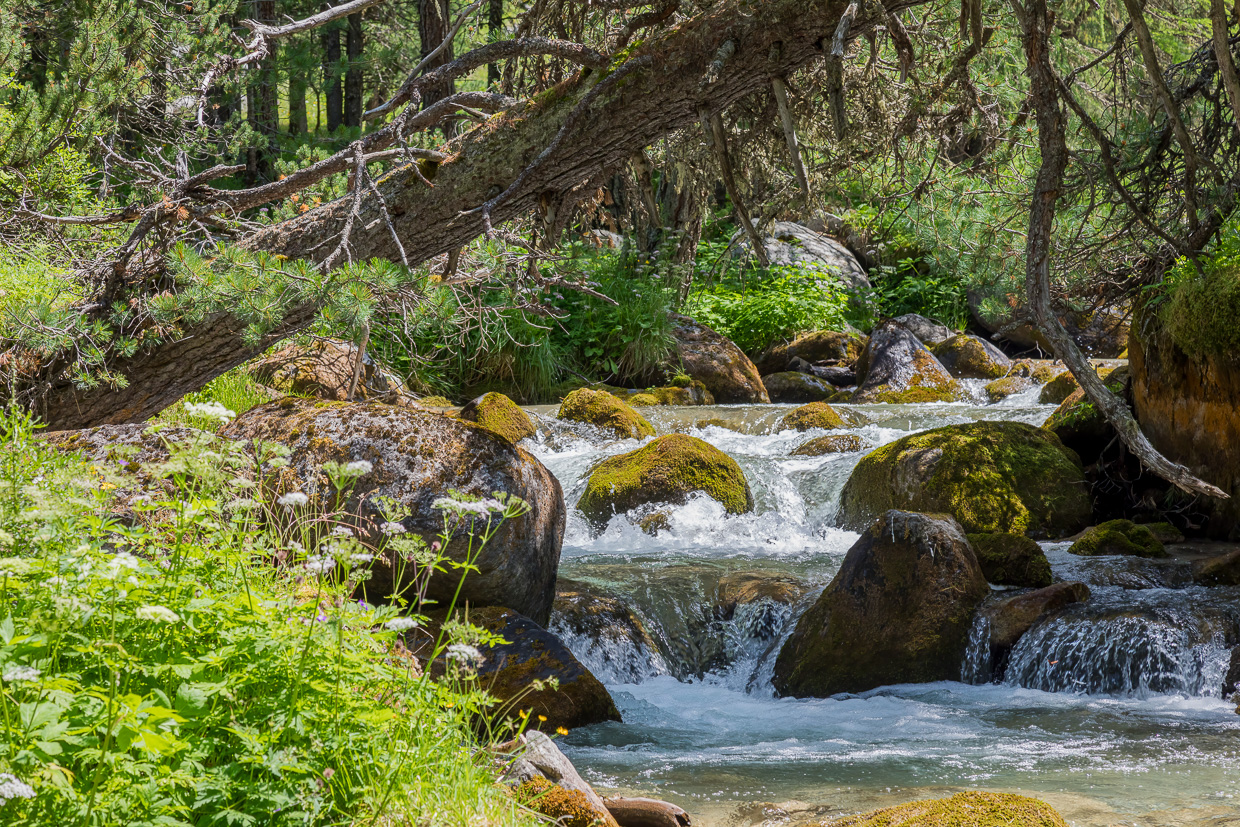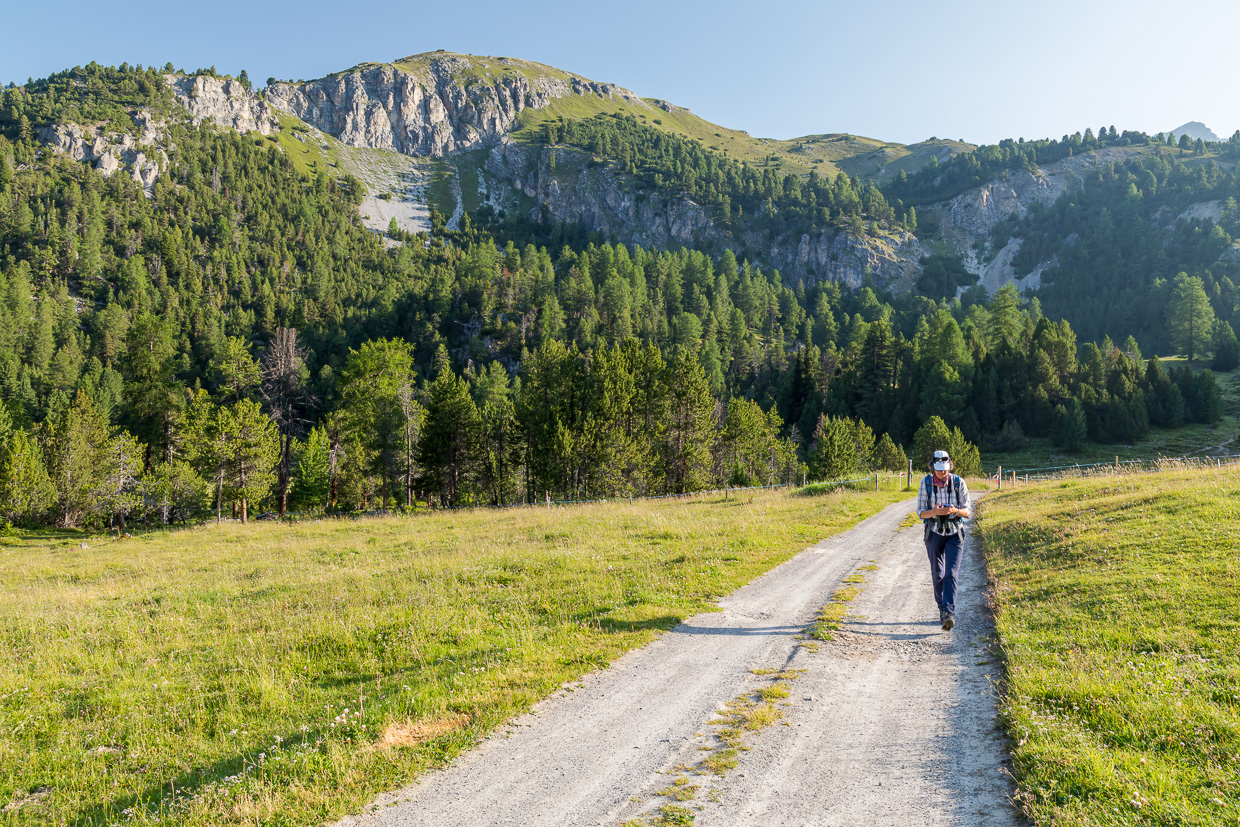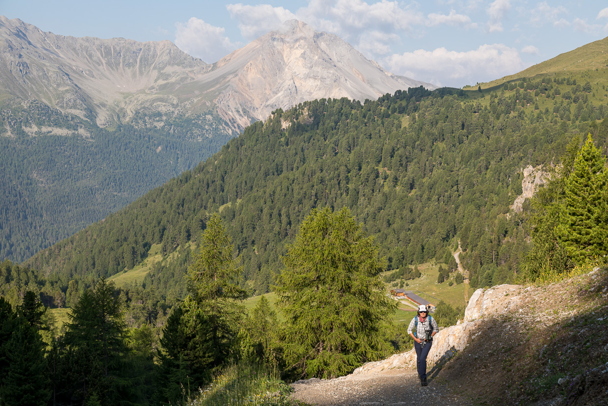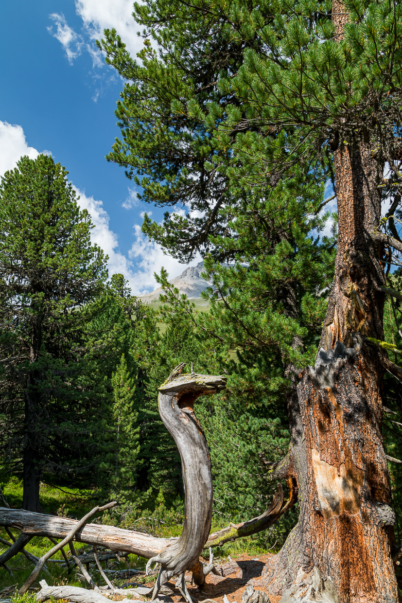 Über die weite Hochebene erreichen wir den höchstgelegenen Arvenwald Europas. Wo er genau beginnt, ist nicht so klar, aber ebenso unwichtig. Es werden einfach immer mehr Bäume. Aber sie stehen nie so dicht, wie wir es vom Unterland kennen. Ein natürlich gewachsener Wald eben. Die Arven (einige nennen sie ja Zirben) wachsen in allen Formen, verdreht, schräg, geknickt. Totholz liegt herum, aus dem neues Leben spriesst. Wir sind fasziniert. Wir begegnen kaum Leuten, die meisten gehen auf der bequemen Alpstrasse auf der anderen Talseite, für uns keine Alternative. Da müssten wir schon mit dem Mountainbikes unterwegs sein, was hier sehr beliebt ist.
