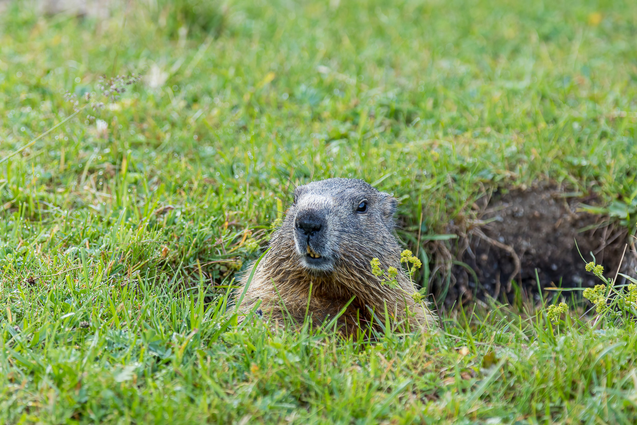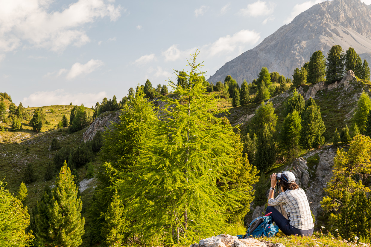Wieder starten wir um sechs Uhr wie auf den Piz Dora, denn es ist wieder ein heisser Tag angesagt. Im Schatten steigen wir durch den Wald hinter Tschierv hoch. Es ist noch ganz ruhig, wir geniessen die Kühle. Auf der Alp Champatsch erreichen uns die ersten Sonnenstrahlen. Nicht jedoch das Murmeltier, das just neben dem Weg aus seiner Höhle kriechen will, als es uns sieht und wieder verschwindet. Zu gross ist aber die Neugier, es steckt seine Schnauze wieder hervor, nur zwei Meter neben uns. Wir verhalten uns ganz still, es kriecht noch etwas weiter hervor. Eine kleine Bewegung von uns, schon ist es wieder verschwunden. Wir gehen weiter, schliesslich wollen wir es nicht stressen.