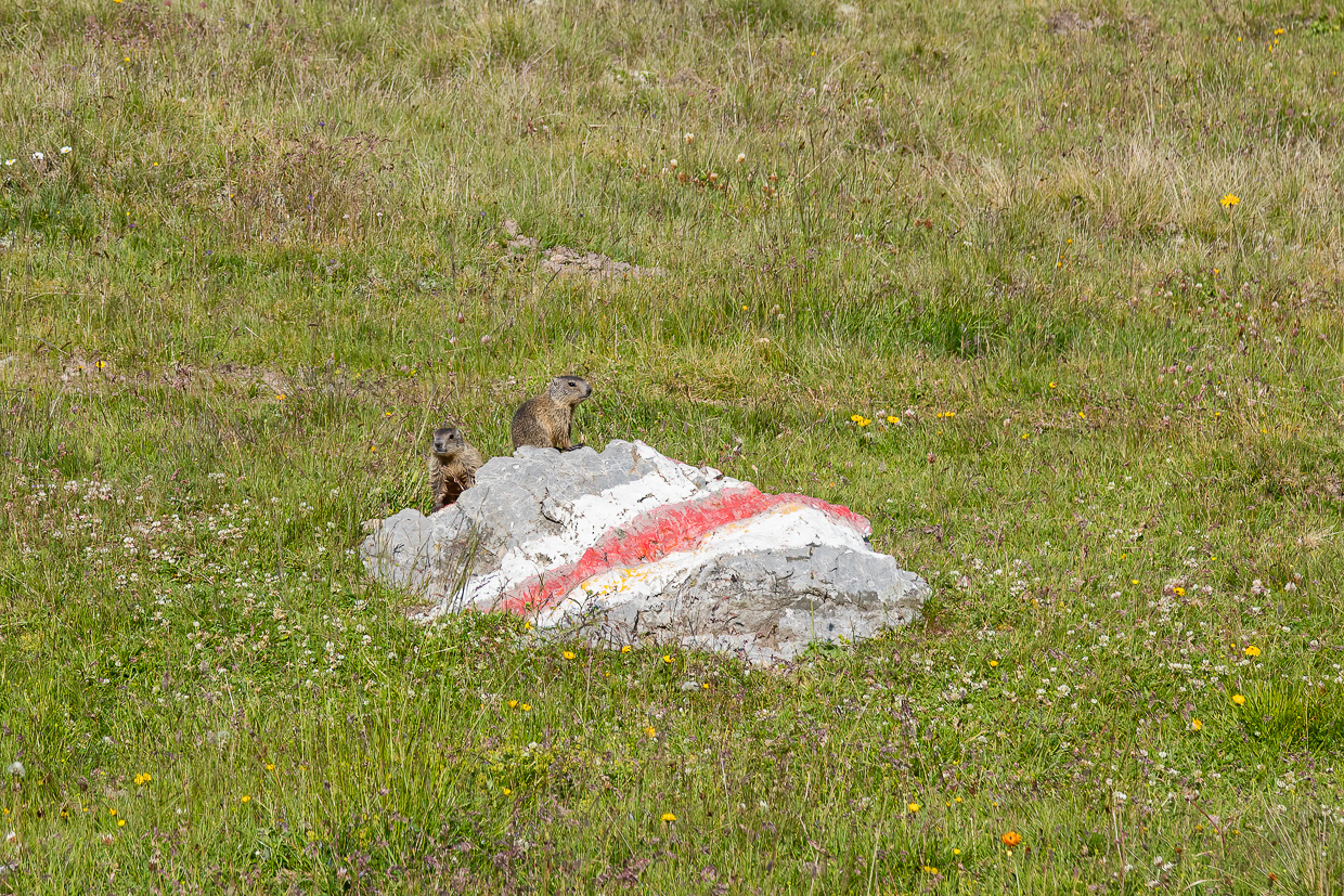 Wir gehen weiter, der Weg steigt kaum noch an. Am Wegrand beäugt uns wieder ein Murmeltier misstrauisch, etwas weiter weg tummeln sich zwei kleine auf einem Stein. Und schon erreichen wir den Pass, der wie üblich durch einen Wegweiser markiert ist.