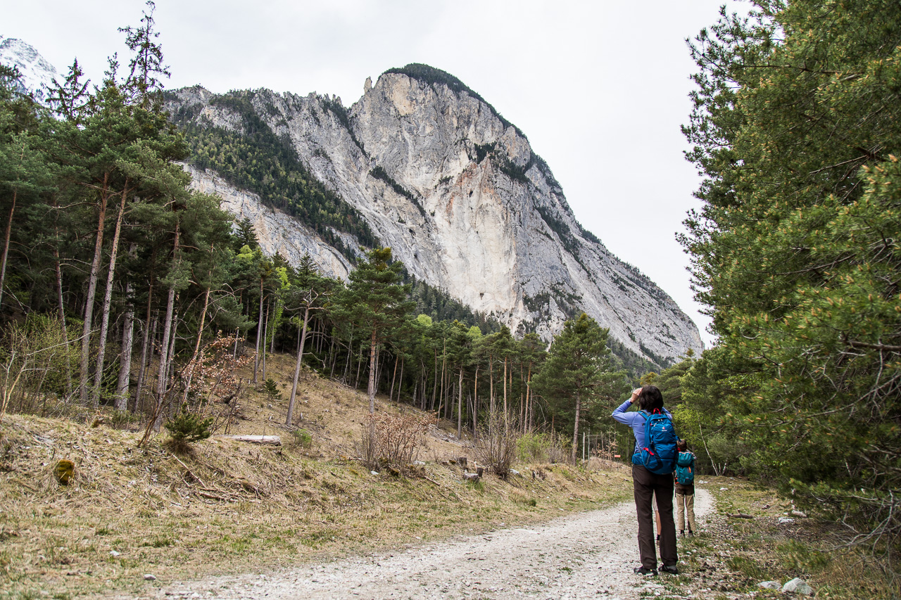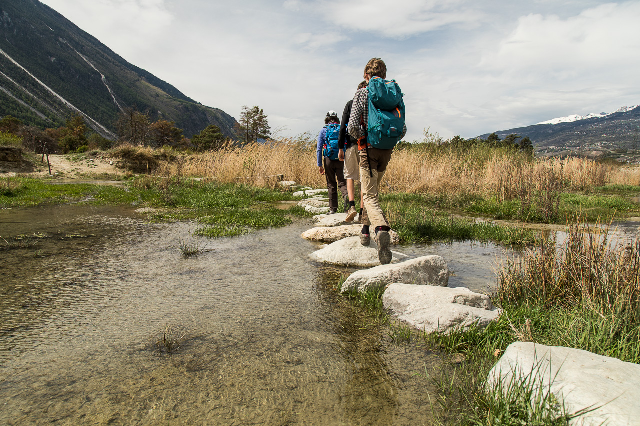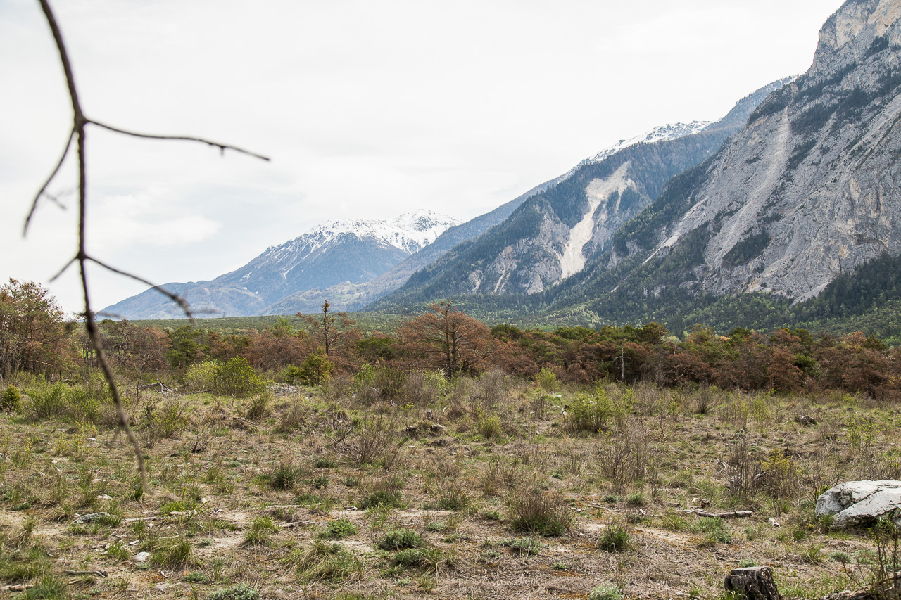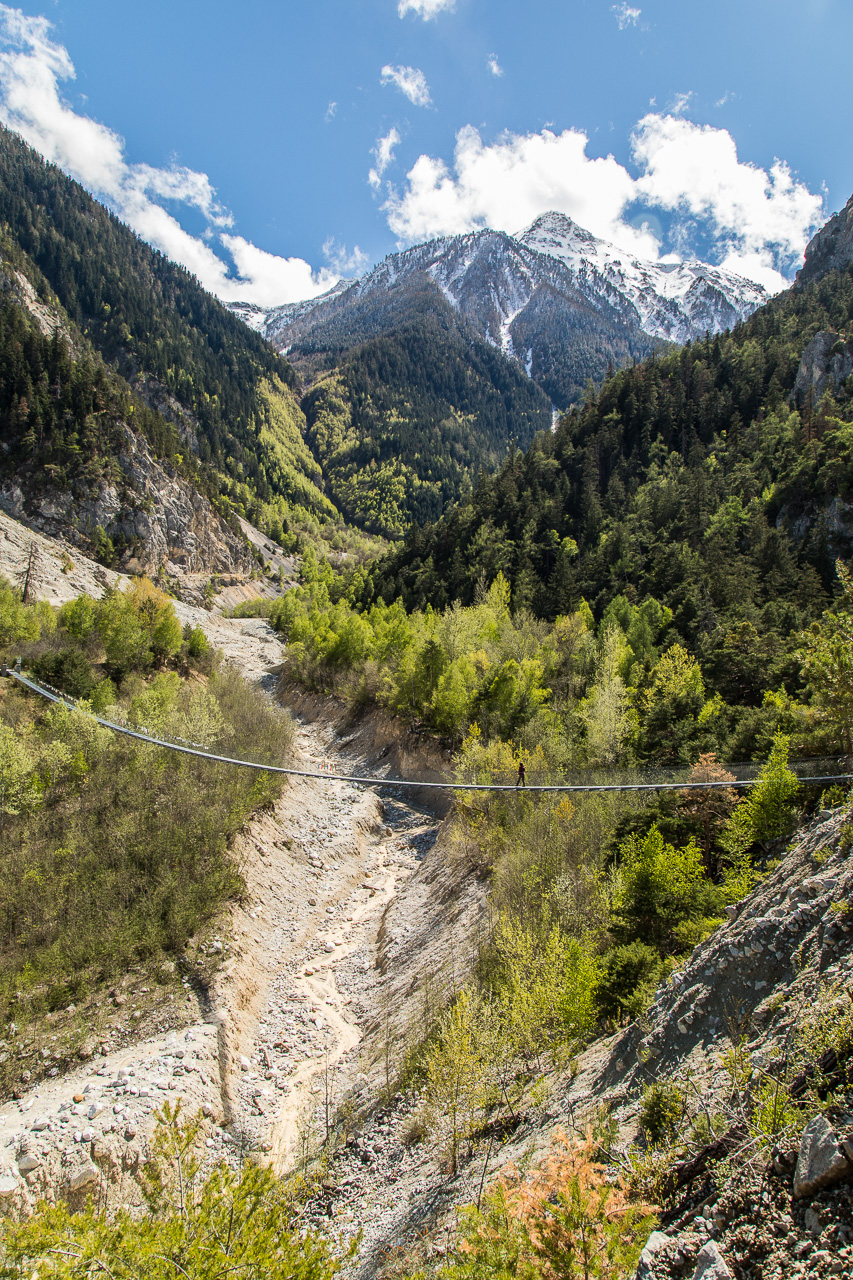 Von unserer Wohnung her ist es nicht weit zur Buthanbrücke, einer Hängebrücke, die den Illgraben überspannt. Sie wurde erst gerade zwei Tage zuvor nach einer Revision wiedereröffnet. Der Illgraben ist ein sehr aktives Murganggebiet, immer wieder kommt es in dem Gebiet zu grossen Murgängen, die eine Vegetation verhindern. Wir überqueren also diese 134 Meter lange Brücke und gelangen damit in den Pfynwald. In der Nähe ruft der Kuckuck, der erste in diesem Jahr. Wir steigen nun durch den Föhrenwald ab. Fabian und Silvan diskutieren, wie sie den Weg fahren würden mit ihren Bikes. Wir sind aber nun zu Fuss und können so in Ruhe die Umgebung studieren. Die Vegetation spriesst überall, es ist schön, der Natur beim Erwachen zuzusehen. Und wir geniessen die Ruhe, keine anderen Menschen sind hier unterwegs. Bis wir die Strasse erreichen, wo uns der Verkehrslärm richtiggehend anbrüllt.