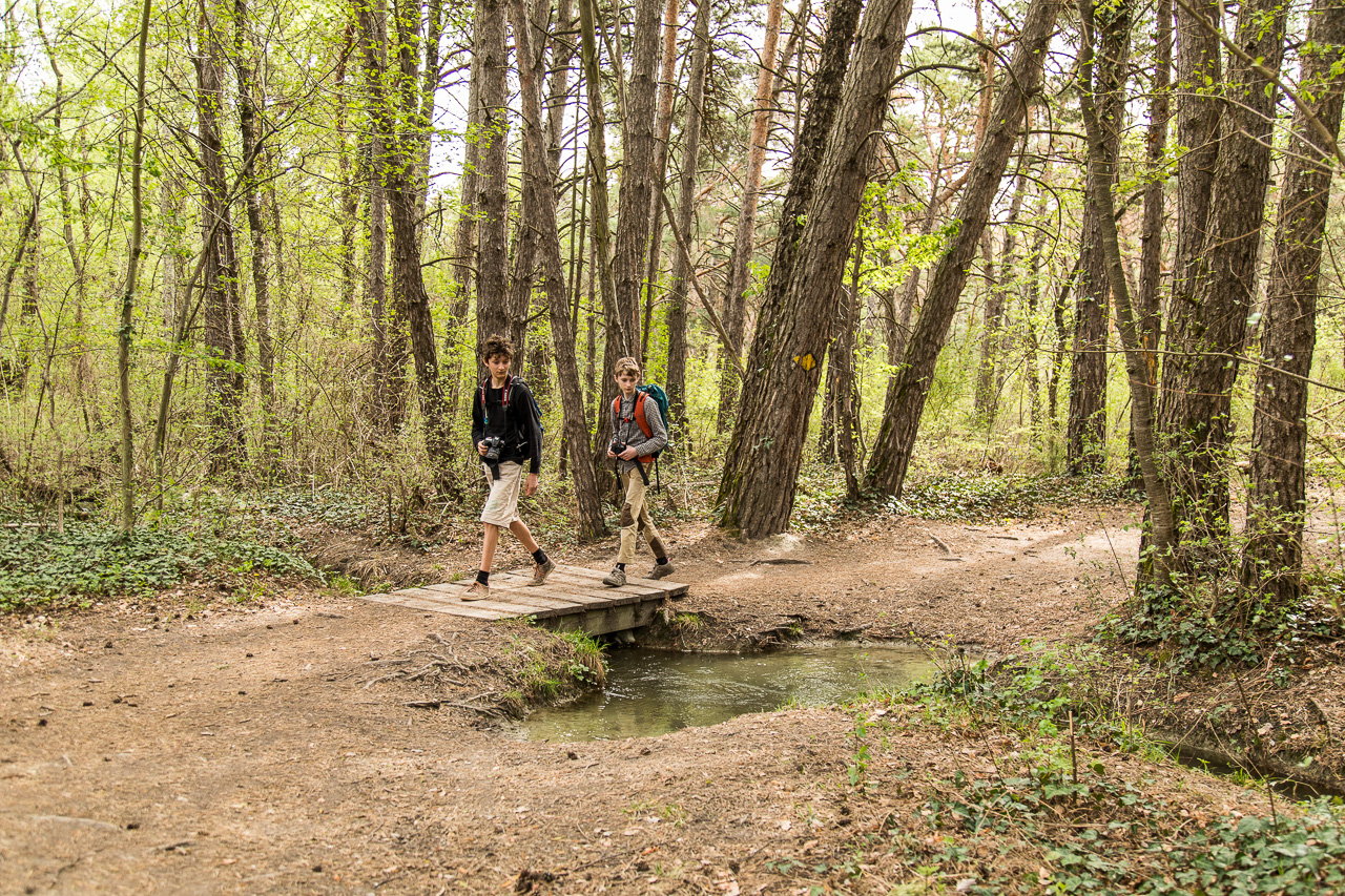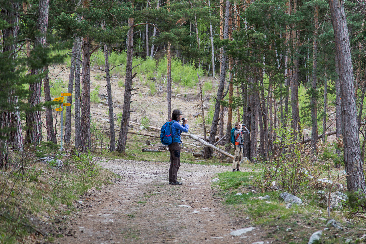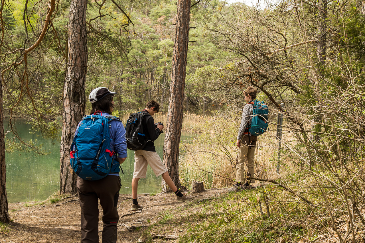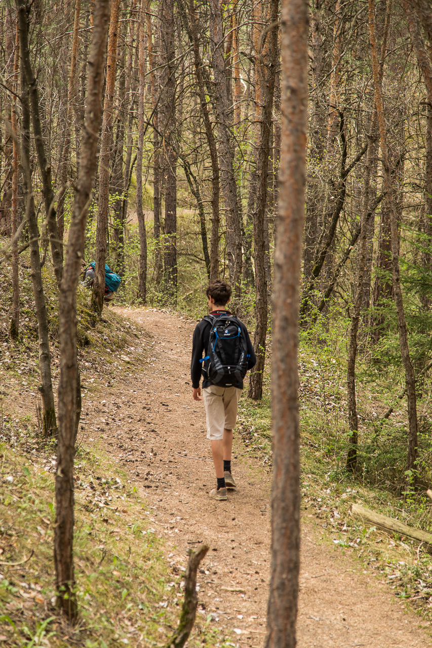 Wir unterqueren die Strasse und tauchen nun in den flachen Teil des Föhrenwaldes ein. Bald ist es wieder ruhiger. Blumen erfreuen uns am Wegesrand, Silvan bestimmt sie alle. Idyllisch plätschert ein Bächlein durch den Wald, ein Holzsteg ermöglicht die Überquerung. Beim Zeltplatz zweigen wir vom offiziellen Wanderweg ab in die Steppe. Am Boden kriechen überall schwarze Käfer umher, es scheint Paarungszeit zu sein. Büsche und niedere Bäume wachsen auf dem kargen, sandigen Boden. Es wäre eine spannende Gegend, um Tiere zu beobachten, aber der Föhn weht heftig, er wird uns fast die ganze Woche begleiten. Ist der Weg anfangs noch breit, verengt er sich plötzlich, wir kämpfen uns durchs Unterholz. Ein Bach muss überquert werden, was mit Trittsteinen einfach ist, bevor wir wieder den offiziellen Wanderweg erreichen. Wir müssen uns diese Steppe mal bei weniger Wind und etwas später im Jahr anschauen.