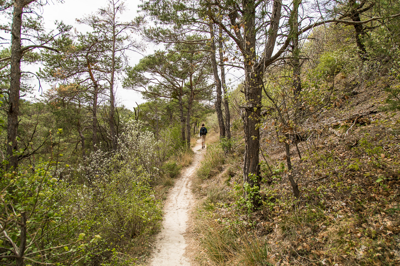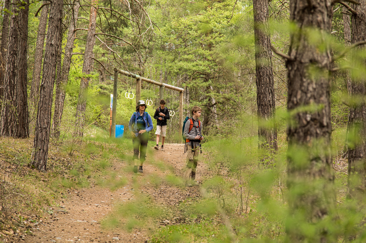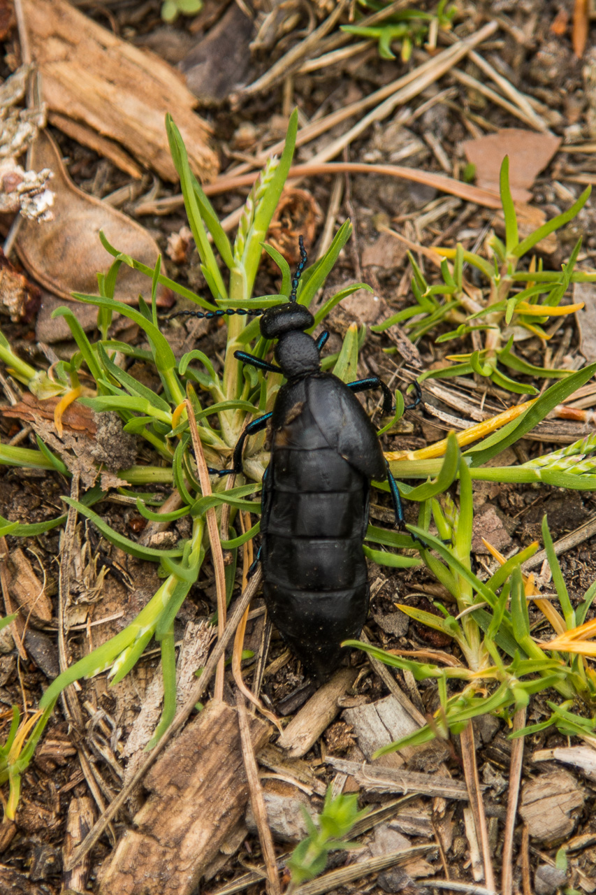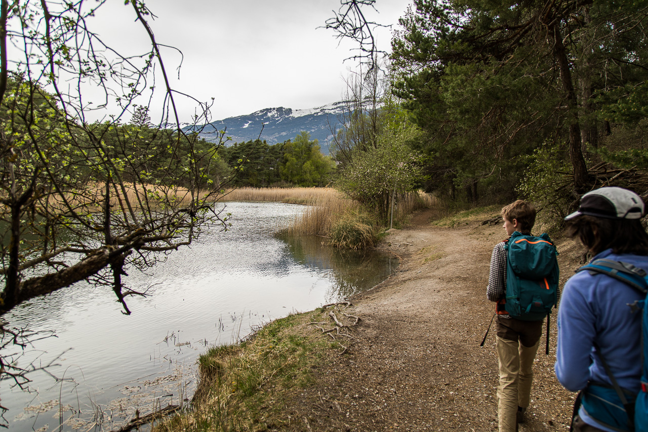 Wir unterqueren die Strasse und tauchen nun in den flachen Teil des Föhrenwaldes ein. Bald ist es wieder ruhiger. Blumen erfreuen uns am Wegesrand, Silvan bestimmt sie alle. Idyllisch plätschert ein Bächlein durch den Wald, ein Holzsteg ermöglicht die Überquerung. Beim Zeltplatz zweigen wir vom offiziellen Wanderweg ab in die Steppe. Am Boden kriechen überall schwarze Käfer umher, es scheint Paarungszeit zu sein. Büsche und niedere Bäume wachsen auf dem kargen, sandigen Boden. Es wäre eine spannende Gegend, um Tiere zu beobachten, aber der Föhn weht heftig, er wird uns fast die ganze Woche begleiten. Ist der Weg anfangs noch breit, verengt er sich plötzlich, wir kämpfen uns durchs Unterholz. Ein Bach muss überquert werden, was mit Trittsteinen einfach ist, bevor wir wieder den offiziellen Wanderweg erreichen. Wir müssen uns diese Steppe mal bei weniger Wind und etwas später im Jahr anschauen.
