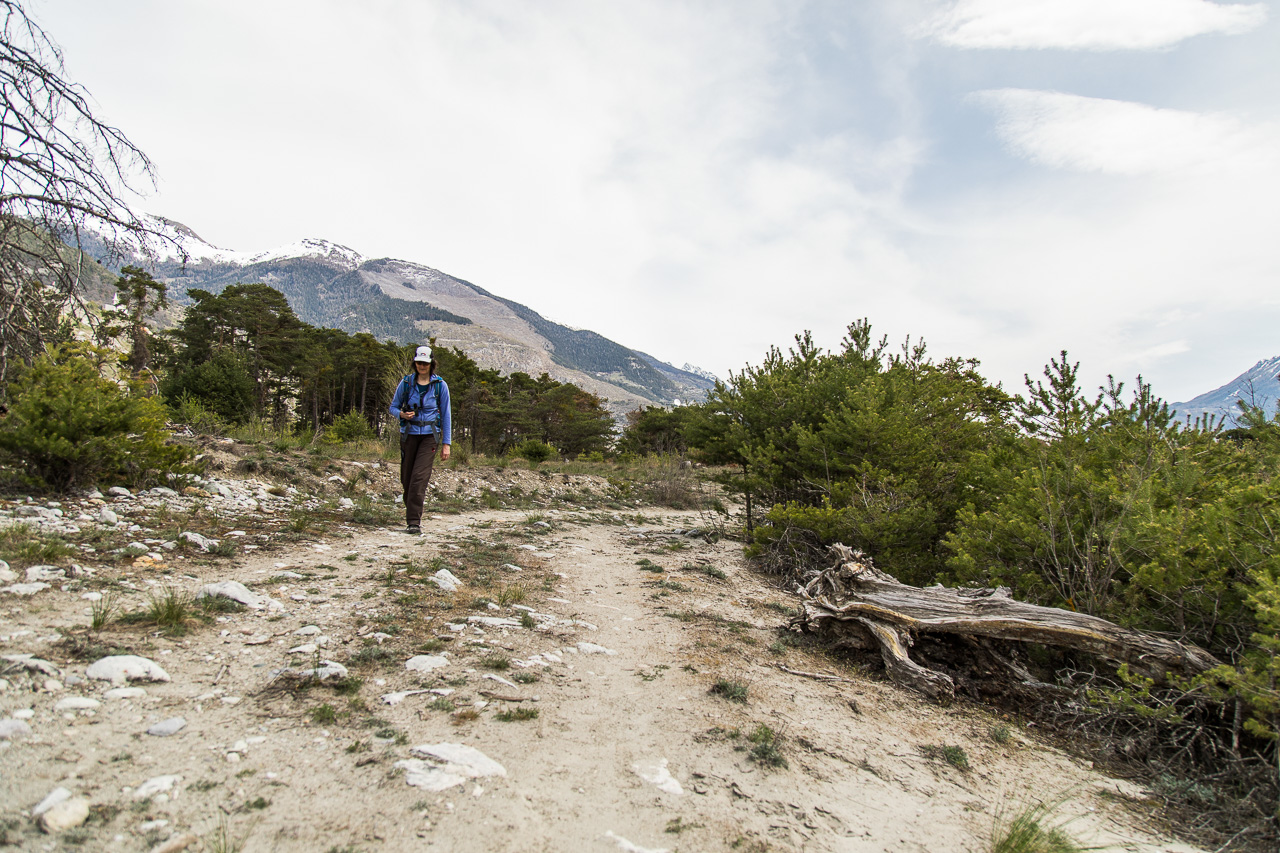 Wir gehen am Rosensee vorbei, die Vögel zwitschern überall. Es kommen Erinnerungen an 2012 auf, als wir auf dem Zeltplatz ‚Monument‘ ein paar Mal übernachtet hatten und die Gegend schon mal erkundet hatten. Diesmal gehen wir aber weiter, entdecken neue Gebiete. Der Weg steigt an, der Bewuchs wird karger und die Bäume niedriger, ein wunderschöner Segelfalter gaukelt vorbei. Es ist sehr trocken hier, weshalb sich hauptsächlich Pflanzen ausbreiten, die sich Trockenheit gewohnt sind. In engen Kehren geht es dann wieder abwärts, Fabian wünscht sich wieder sein Bike herbei. Mir wären die Kurven zu eng. Wir erreichen die Strasse, wo auch gleich eine Bushaltestelle steht. Der Bus fährt aber erst in zwei Stunden, so dass wir den Rest nach Sierre auch noch zu Fuss gehen. Es ist aber nur noch ein Die-Strecke-hinter-sich-bringen, die Beschreibung schenke ich mir.