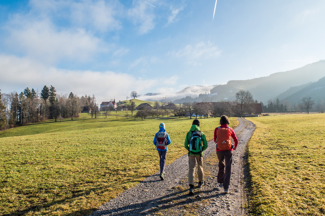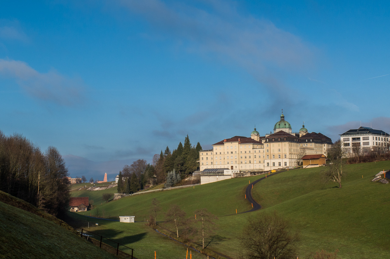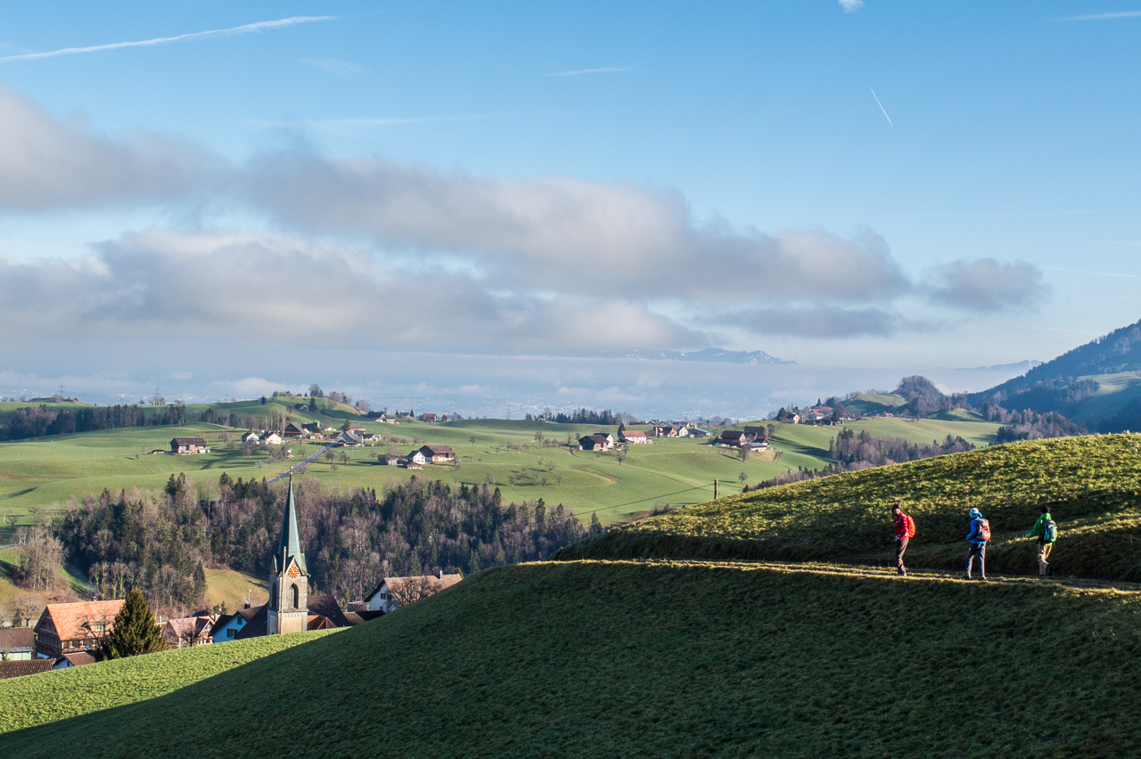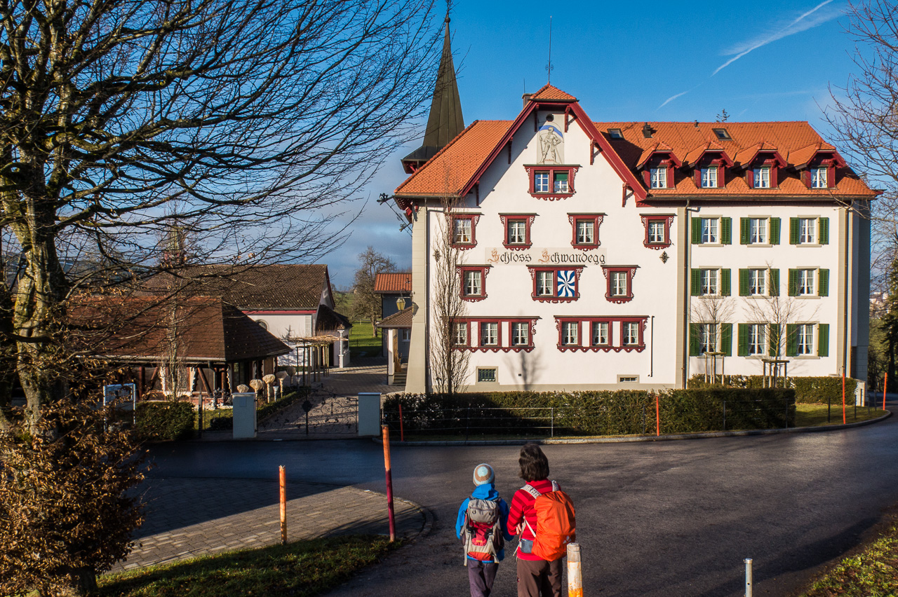 Wir begeben uns also nach Menzingen, wo unsere Wanderung startet. Das Dorf wird von einem riesigen Klosterkomplex dominiert, dem Institut der Schwestern vom Heiligen Kreuz. Es ist noch frisch, aber das ist ja für einen Januarmorgen nicht ungewöhnlich. Wir lassen das Dorf hinter uns, wandern vorbei an Obstbaumgärten zum Schloss Schwandegg, das von der Piusbruderschaft geführt wird. Die Gegend ist doch sehr katholisch geprägt.