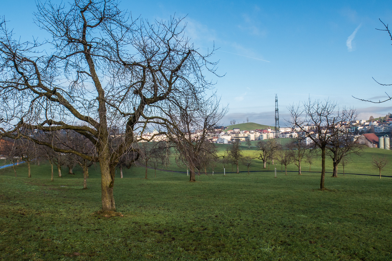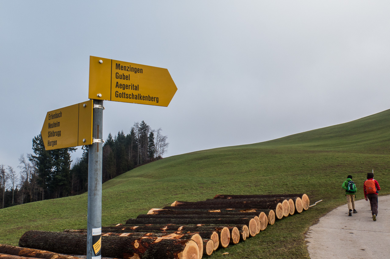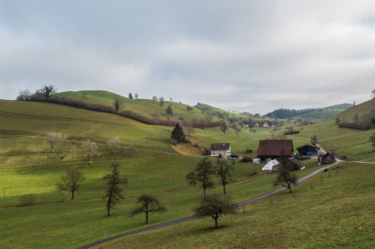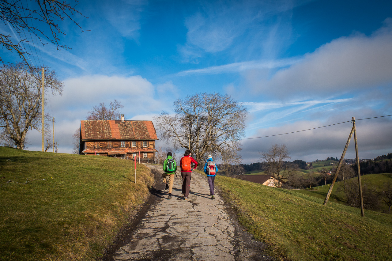 Wir begeben uns also nach Menzingen, wo unsere Wanderung startet. Das Dorf wird von einem riesigen Klosterkomplex dominiert, dem Institut der Schwestern vom Heiligen Kreuz. Es ist noch frisch, aber das ist ja für einen Januarmorgen nicht ungewöhnlich. Wir lassen das Dorf hinter uns, wandern vorbei an Obstbaumgärten zum Schloss Schwandegg, das von der Piusbruderschaft geführt wird. Die Gegend ist doch sehr katholisch geprägt.
