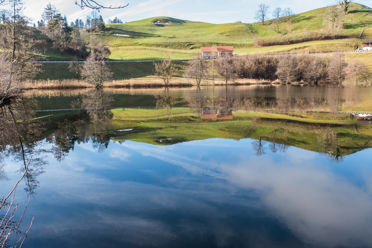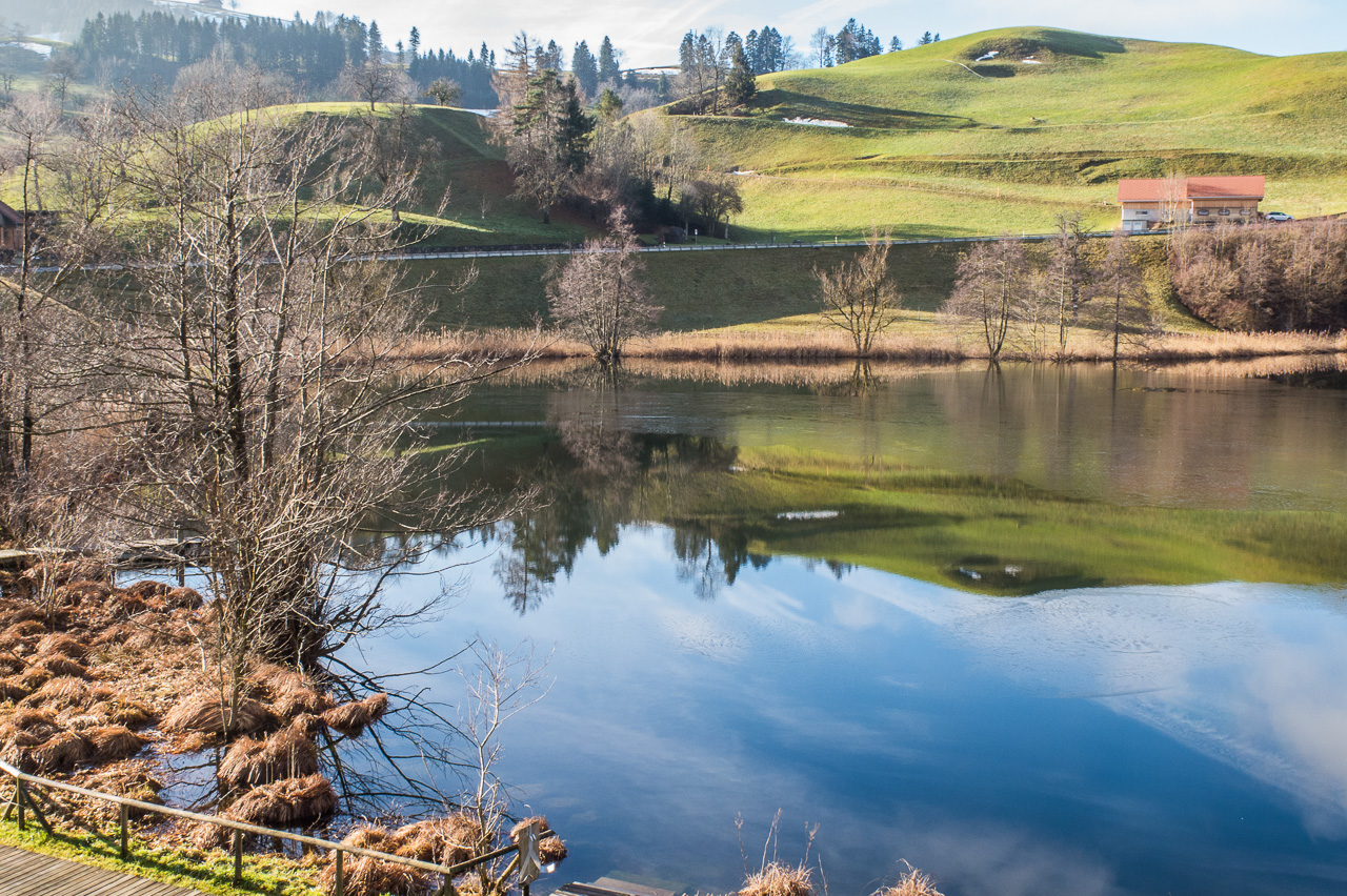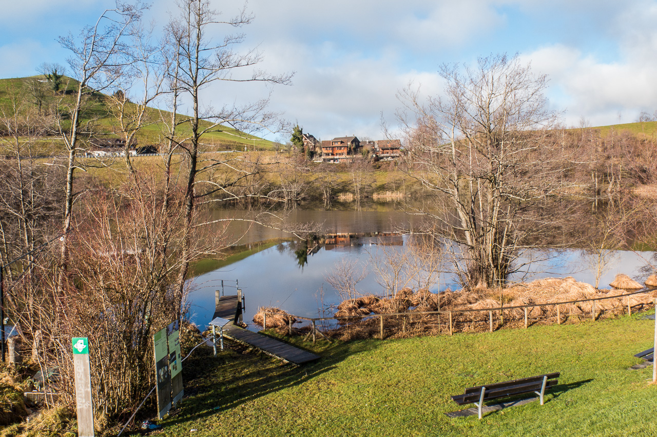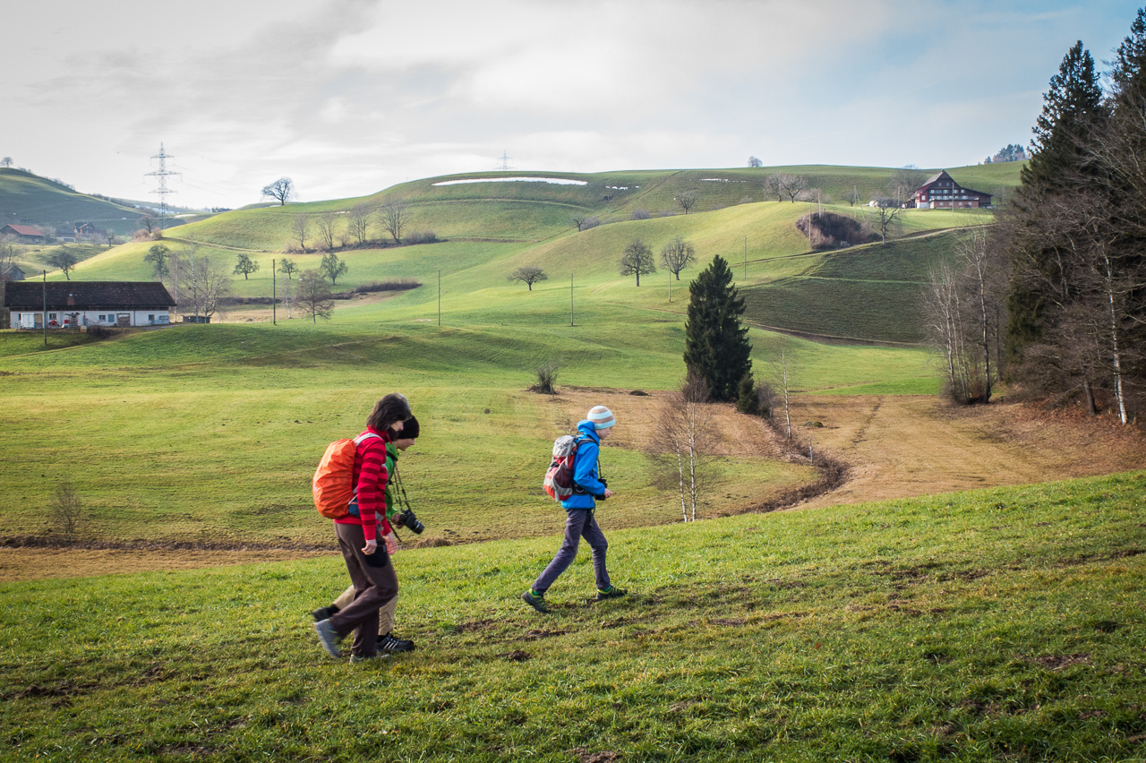 Wir begeben uns also nach Menzingen, wo unsere Wanderung startet. Das Dorf wird von einem riesigen Klosterkomplex dominiert, dem Institut der Schwestern vom Heiligen Kreuz. Es ist noch frisch, aber das ist ja für einen Januarmorgen nicht ungewöhnlich. Wir lassen das Dorf hinter uns, wandern vorbei an Obstbaumgärten zum Schloss Schwandegg, das von der Piusbruderschaft geführt wird. Die Gegend ist doch sehr katholisch geprägt.