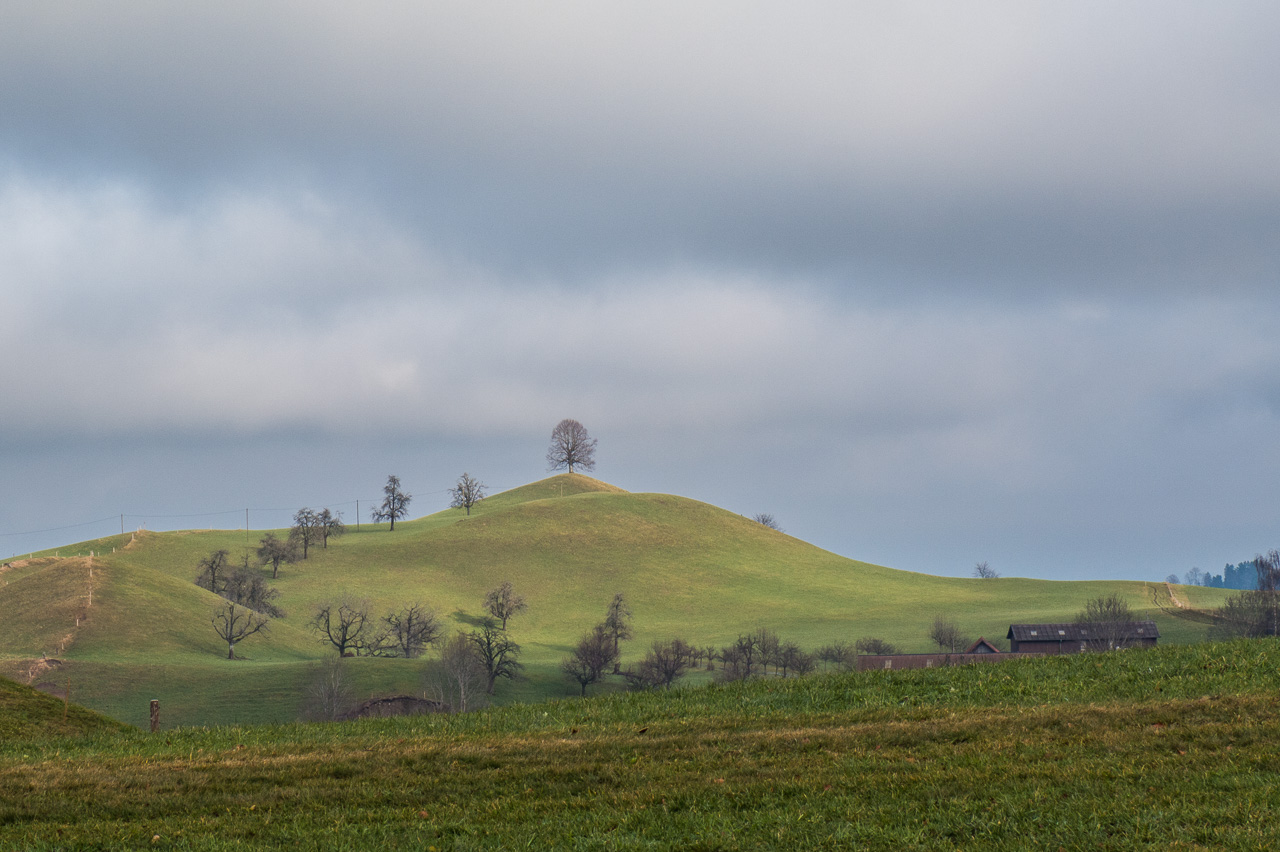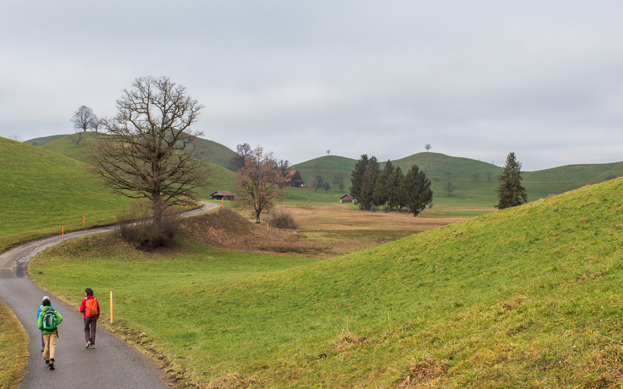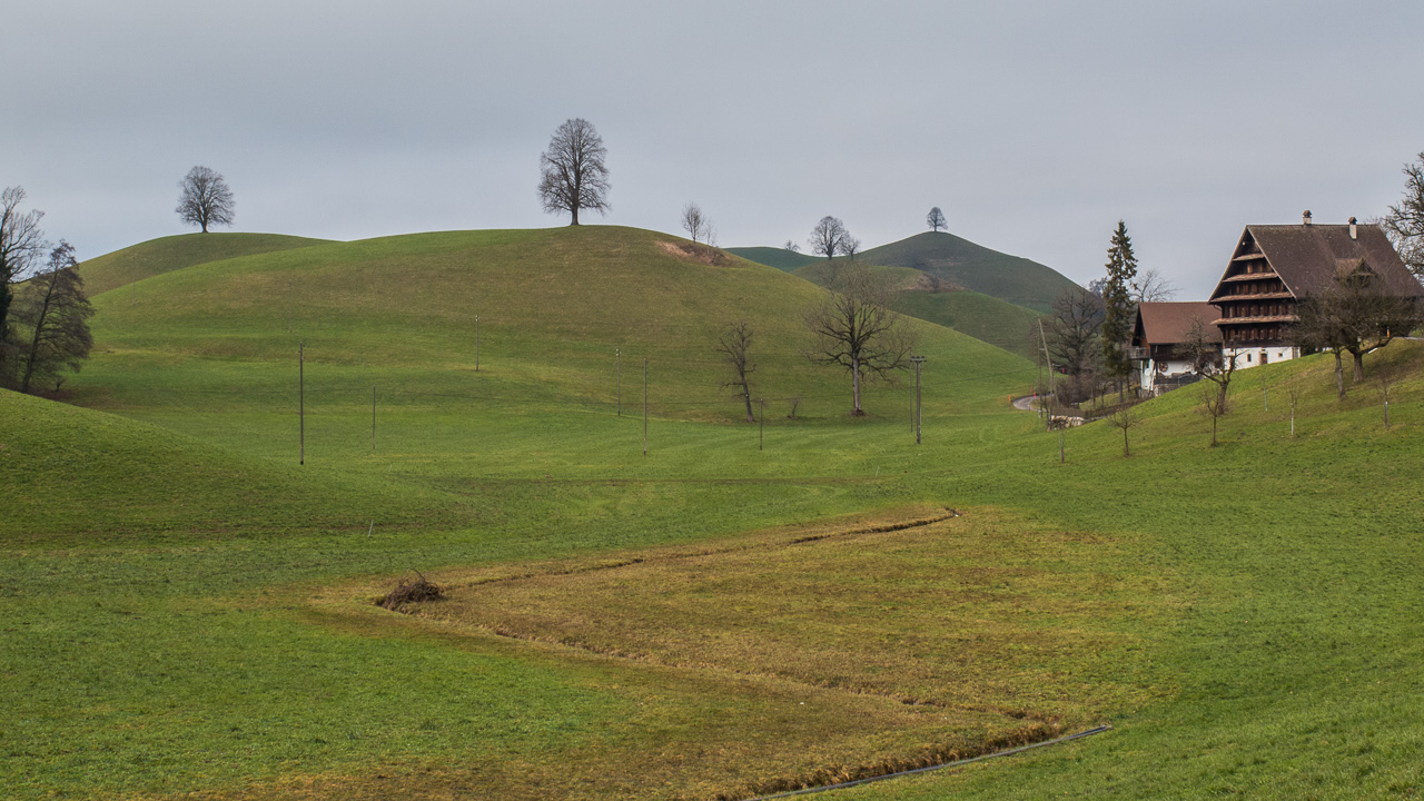 Bei der Planung der Wanderung stellte ich fest: Es gibt im Internet keine dokumentierte Wanderung. Eigenartig. Ob das Gebiet doch nicht so geeignet ist zum Wandern? Dafür fand ich anderes heraus: Die Hügel werden Drumlin genannt. Die Bezeichnung stammt vom Irischen „droimnin“ ab, was „kleiner Rücken“ oder „Höhenrücken“ bedeutet. Die Drumlin entstanden zur Eiszeit, als die Gletscher bis ins Mittelland vorstiessen. Sie werden zwischen 10 und 40 Meter hoch und mehrere 100 bis 1000 Meter lang. Sie entstehen, vereinfacht gesagt, dadurch, dass Geschiebe auf einen Felshöcker trifft und sich hinter diesem ablagert.