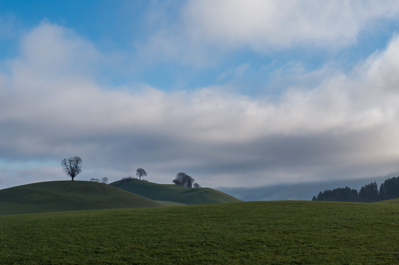 Jedesmal, wenn wir über den Hirzel fuhren, bestaunte ich die sanft gerundeten Hügel mit den Bäumen oben drauf. Wie die wohl entstanden? Einmal musste ich diese Landschaft zu Fuss erkunden und mich schlau machen über die Entstehung.