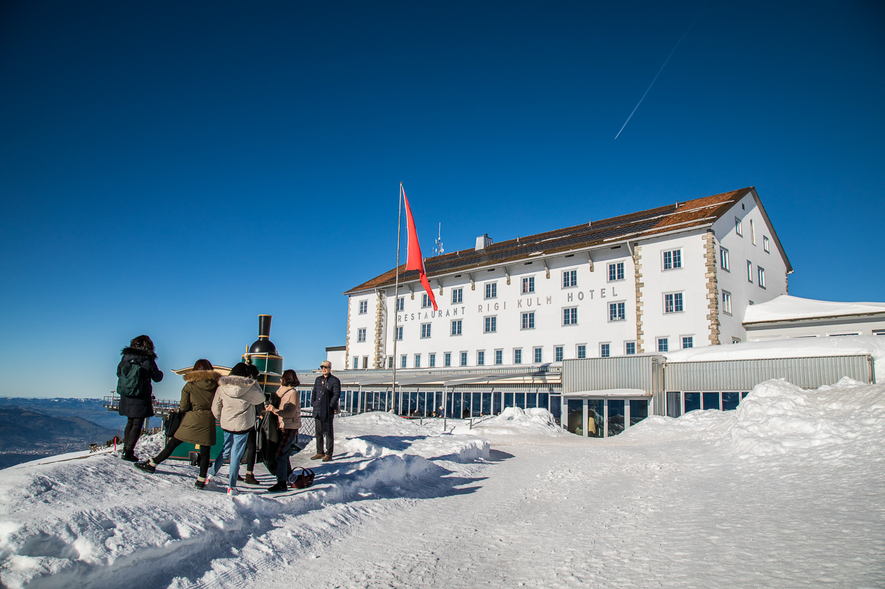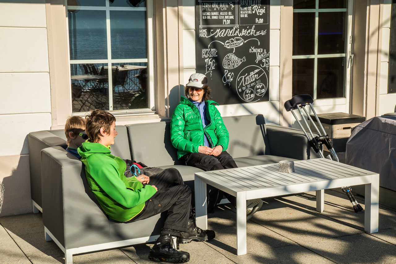 Wir kehren zurück und im Berghotel Rigi-Kulm ein. Auf der Terrasse ist es angenehm, wir geniessen die Wärme und einen Kaffee und betrachten amüsiert das Geschehen.