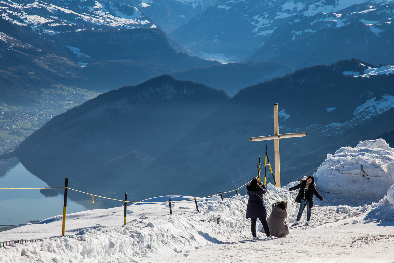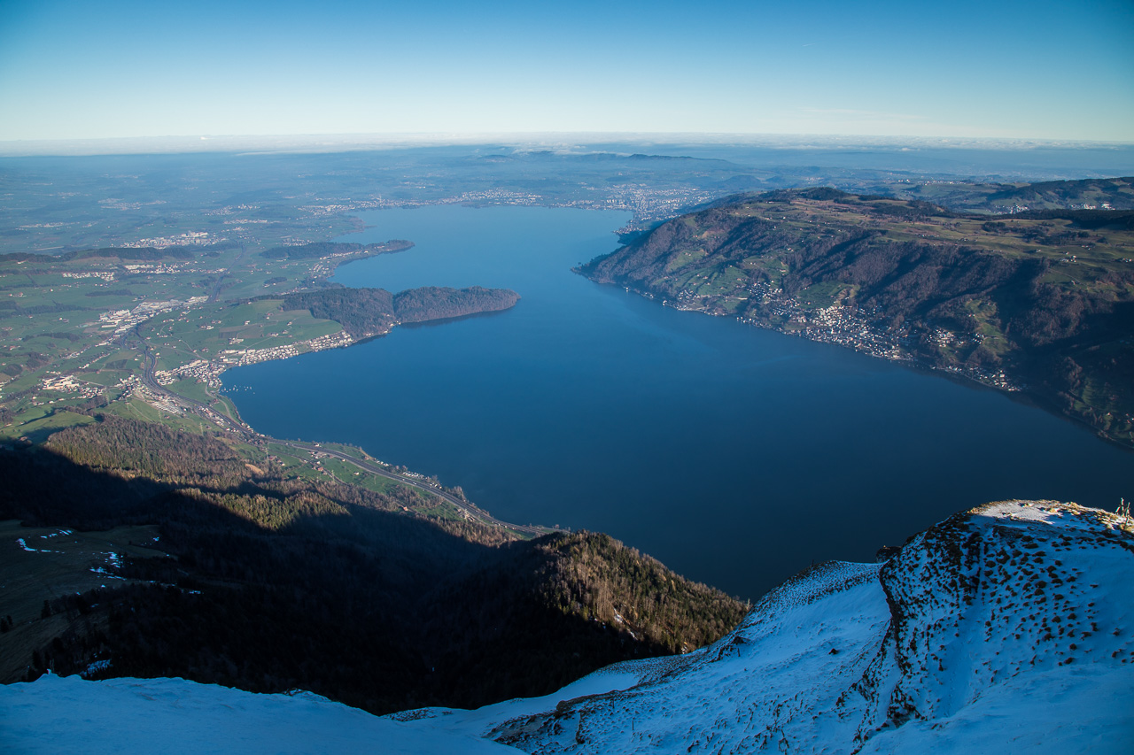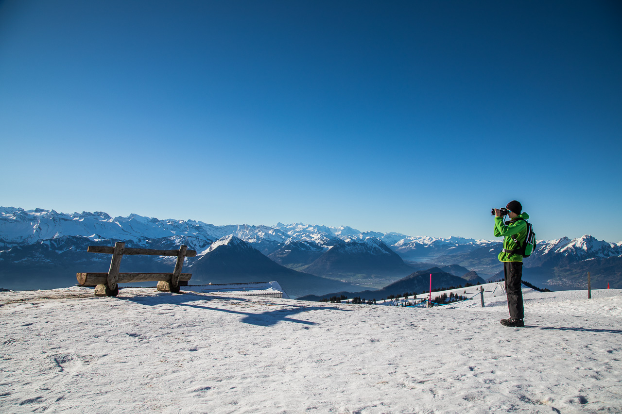 Wir fahren weiter an Rigi-Staffel vorbei zur Endstation auf Rigi-Kulm. Gleissend steht die Sonne am Himmel, wir haben einen Prachtstag erwischt. Im Schnee wandern wir zum höchsten Punkt, Silvan wählt mit seinen Krücken den weiteren, aber flacheren Weg. Zuoberst bietet sich uns eine fantastische Rundsicht, 13 Seen soll man von hier aus erkennen können bei guten Sichtverhältnissen. Mit Bestimmtheit können wir den Vierwaldstätter-, den Zuger-, Lauerzer- und Ägerisee sehen. Der rund 1500 Meter hohe Wildspitz weist nur vereinzelte Schneeflecken auf, der Winter lässt also immer noch auf sich warten in tieferen Gefilden.