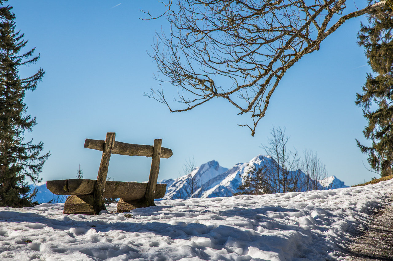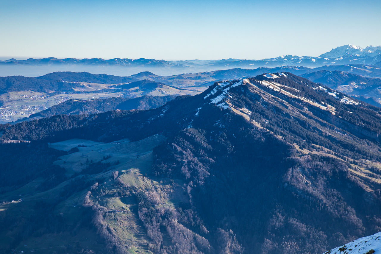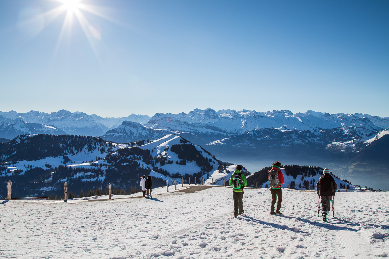Wir fahren weiter an Rigi-Staffel vorbei zur Endstation auf Rigi-Kulm. Gleissend steht die Sonne am Himmel, wir haben einen Prachtstag erwischt. Im Schnee wandern wir zum höchsten Punkt, Silvan wählt mit seinen Krücken den weiteren, aber flacheren Weg. Zuoberst bietet sich uns eine fantastische Rundsicht, 13 Seen soll man von hier aus erkennen können bei guten Sichtverhältnissen. Mit Bestimmtheit können wir den Vierwaldstätter-, den Zuger-, Lauerzer- und Ägerisee sehen. Der rund 1500 Meter hohe Wildspitz weist nur vereinzelte Schneeflecken auf, der Winter lässt also immer noch auf sich warten in tieferen Gefilden.