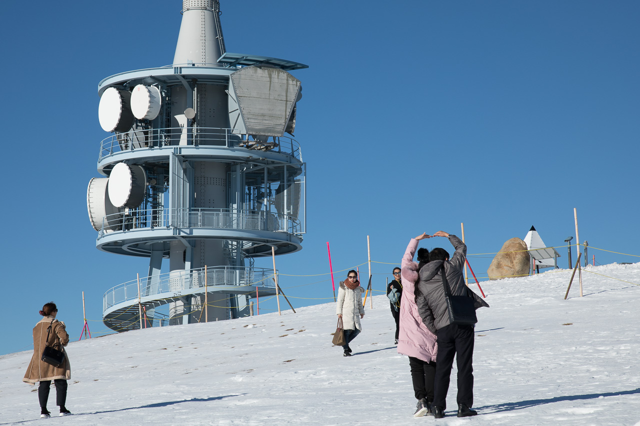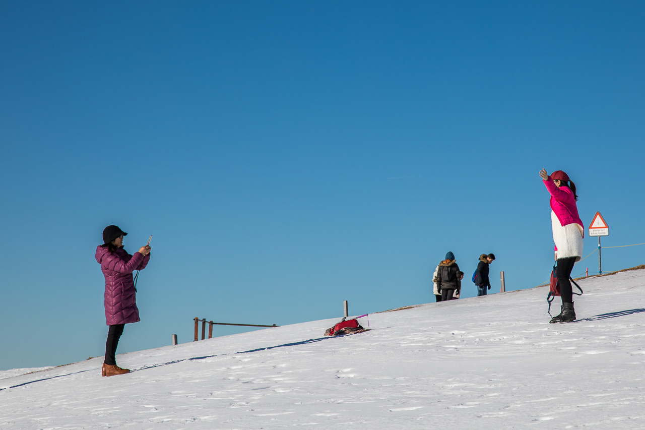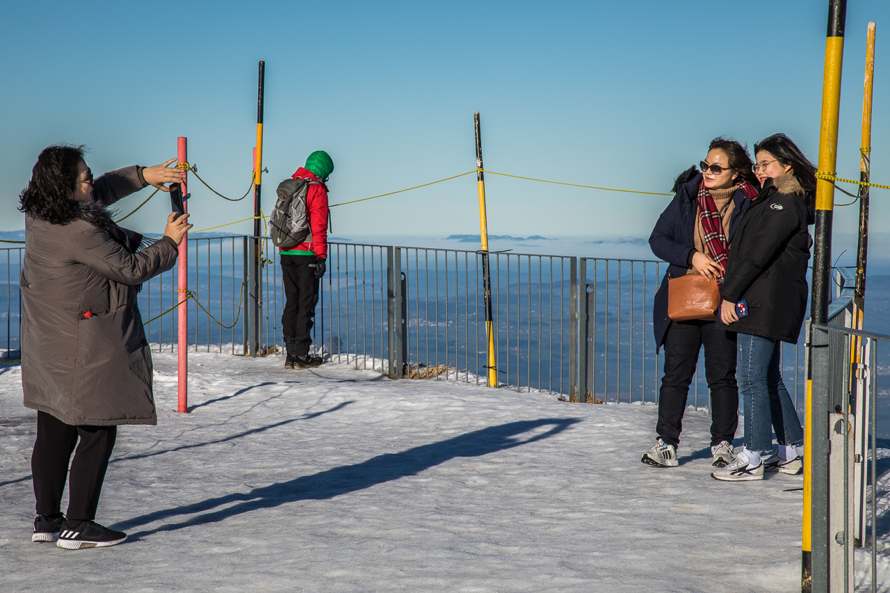 Wir sind beileibe nicht die einzigen auf dem Gipfel, viele Chinesen tummeln sich hier oben. Teilweise sind sie wohl zum ersten Mal im Schnee. Für die Aussicht haben sie nicht viel übrig, zu sehr sind sie beschäftigt mit Selfies vor selbiger.