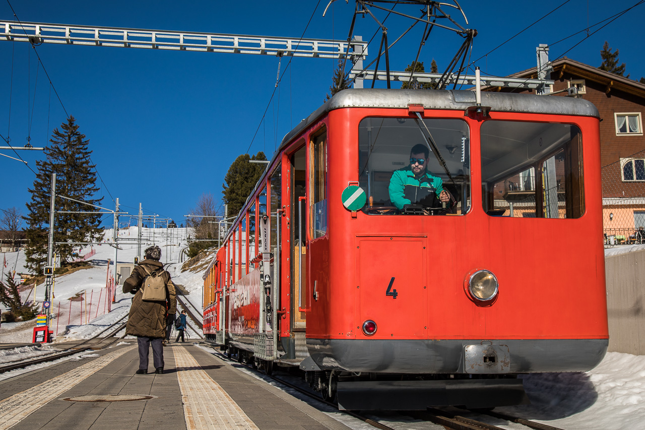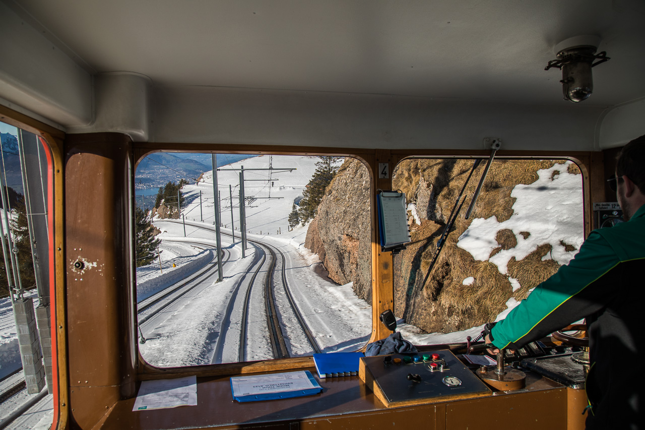 Weil es gerade passt, eilen wir nach Konsultation des Fahrplans auf den nächsten Zug und tuckern mit der Nummer 4, einem Triebwagen aus dem Jahre 1953, hinunter nach Rigi Kaltbad. In diesen Zügen kann man eine echte Führerstandfahrt erleben: