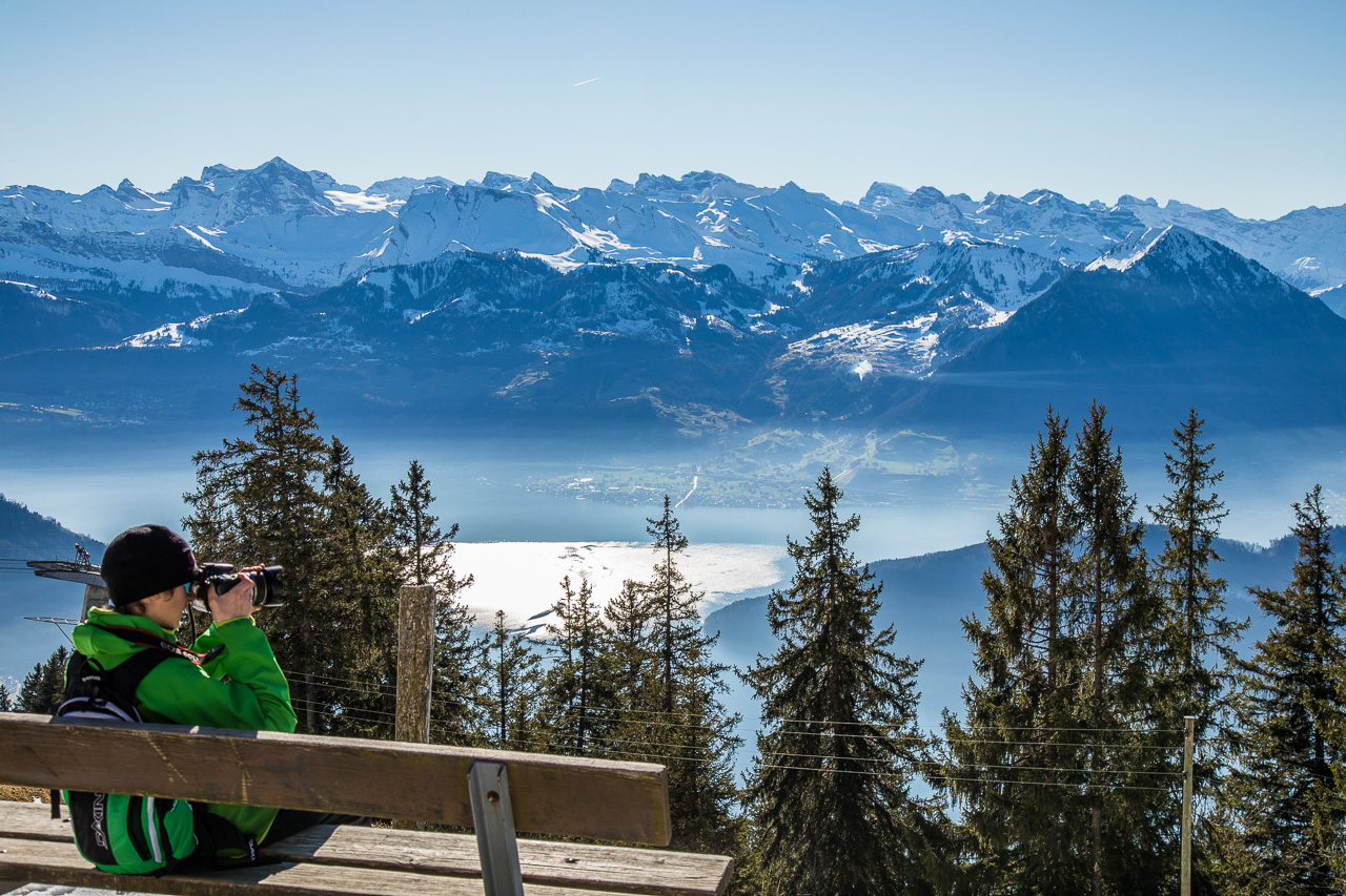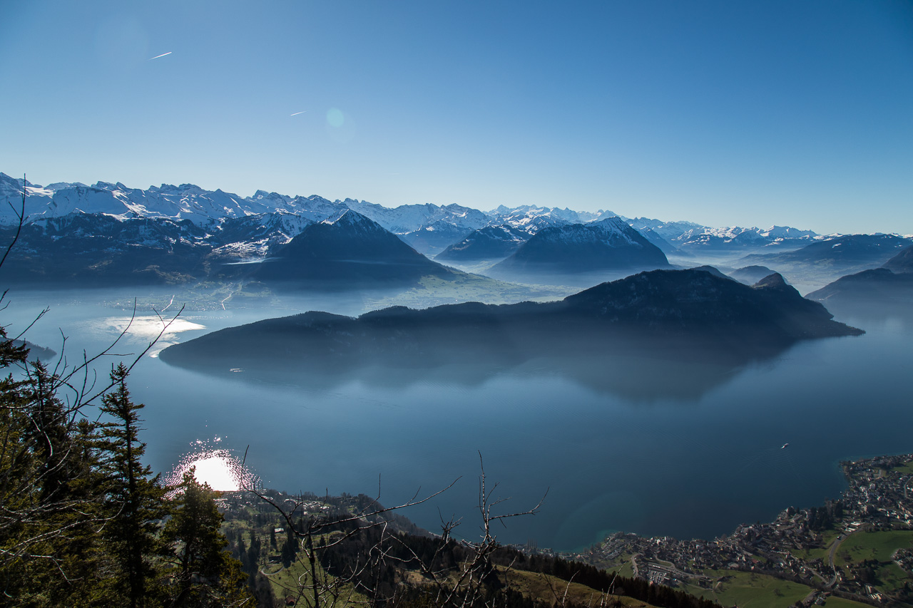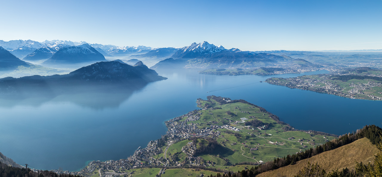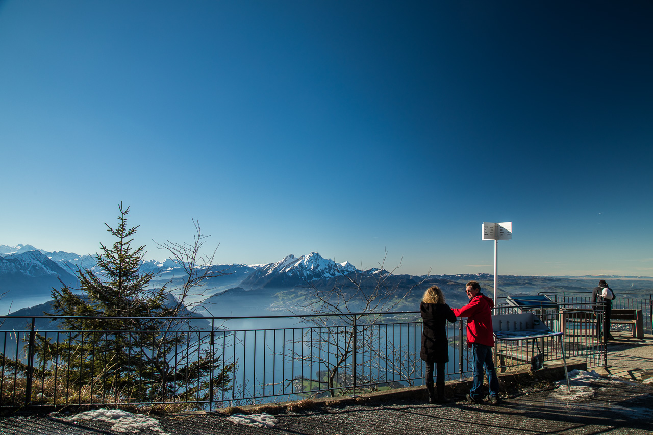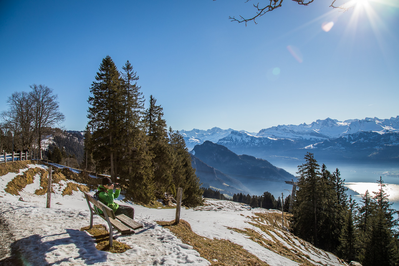 Mit gemütlichen 12 km/h tuckern wir also nach Rigi Kaltbad und steigen dort aus. Entgegen dem Namen bietet das Wasser im von Mario Botta gebauten Spa eine angenehme Temperatur von 35°C. Uns zieht es jedoch zum Känzeli, dem Aussichtspunkt bei Kaltbad. Ein Spazierweg, nicht mal ein Kilometer lang, führt uns zu einer sensationellen Aussicht. Die halbe Innerschweiz liegt uns zu Füssen: Der Pilatus, das Stanserhorn, der Bürgenstock, der Vierwaldstättersee, das Buochserhorn, Luzern und das halbe Mittelland. Im Hintergrund erhebt sich die Jurakette mit der schneebedeckten Kuppe des Chasseral.