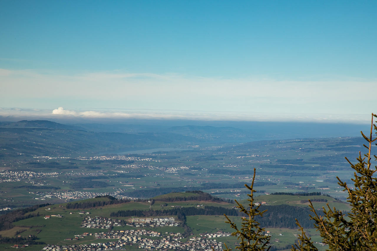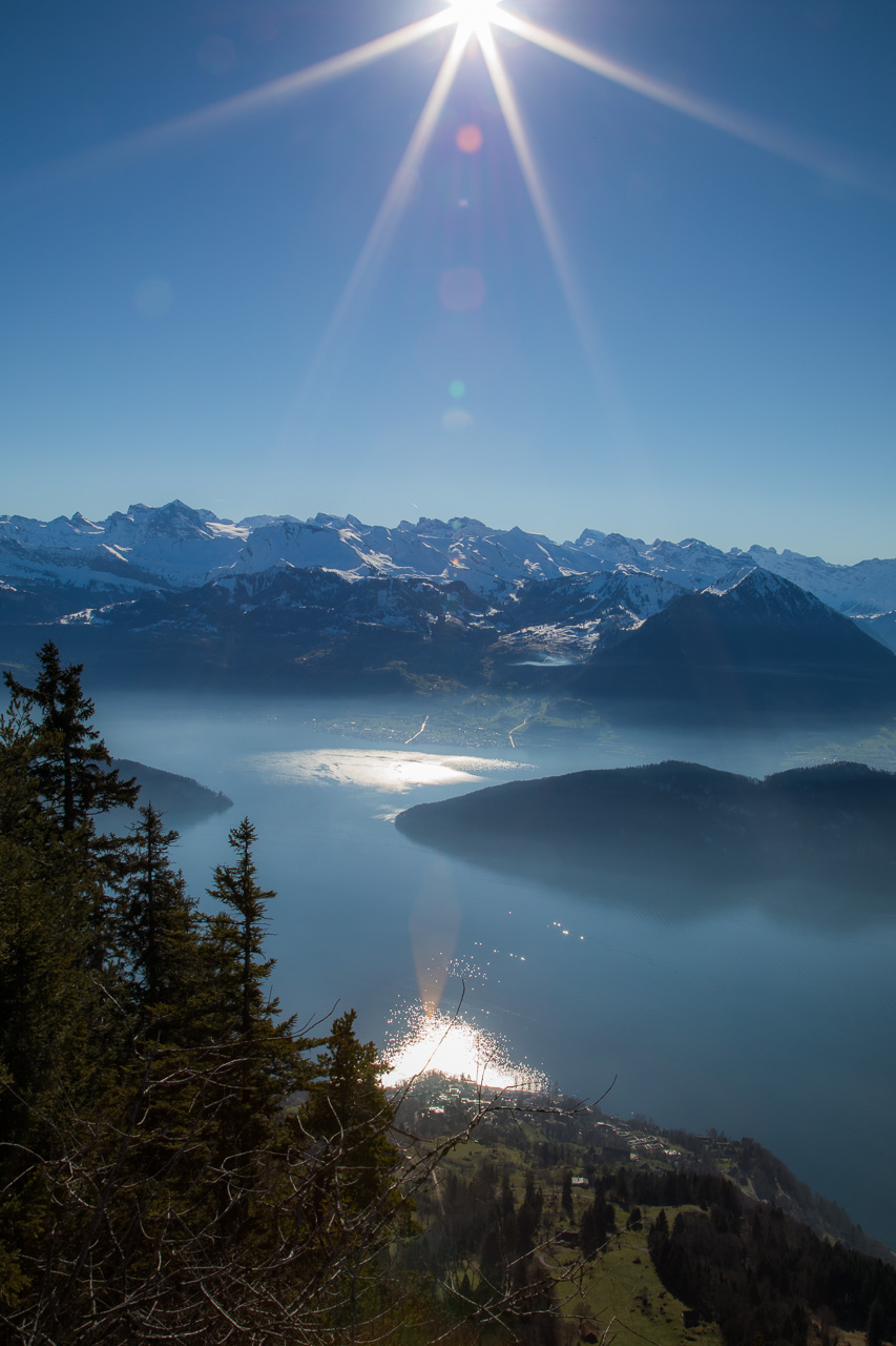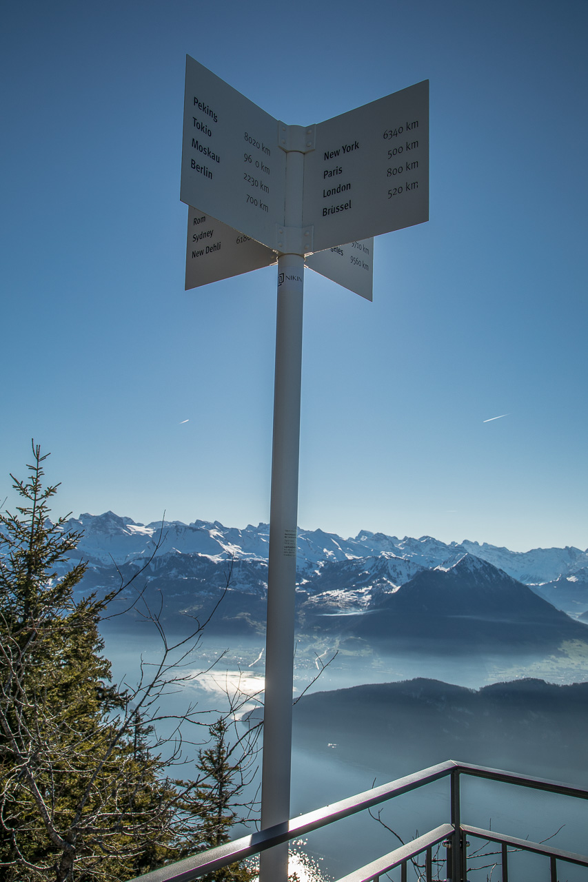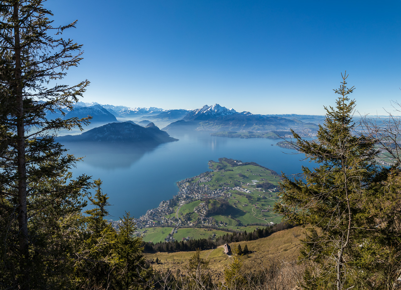 Mit gemütlichen 12 km/h tuckern wir also nach Rigi Kaltbad und steigen dort aus. Entgegen dem Namen bietet das Wasser im von Mario Botta gebauten Spa eine angenehme Temperatur von 35°C. Uns zieht es jedoch zum Känzeli, dem Aussichtspunkt bei Kaltbad. Ein Spazierweg, nicht mal ein Kilometer lang, führt uns zu einer sensationellen Aussicht. Die halbe Innerschweiz liegt uns zu Füssen: Der Pilatus, das Stanserhorn, der Bürgenstock, der Vierwaldstättersee, das Buochserhorn, Luzern und das halbe Mittelland. Im Hintergrund erhebt sich die Jurakette mit der schneebedeckten Kuppe des Chasseral.