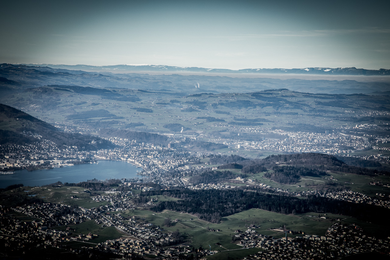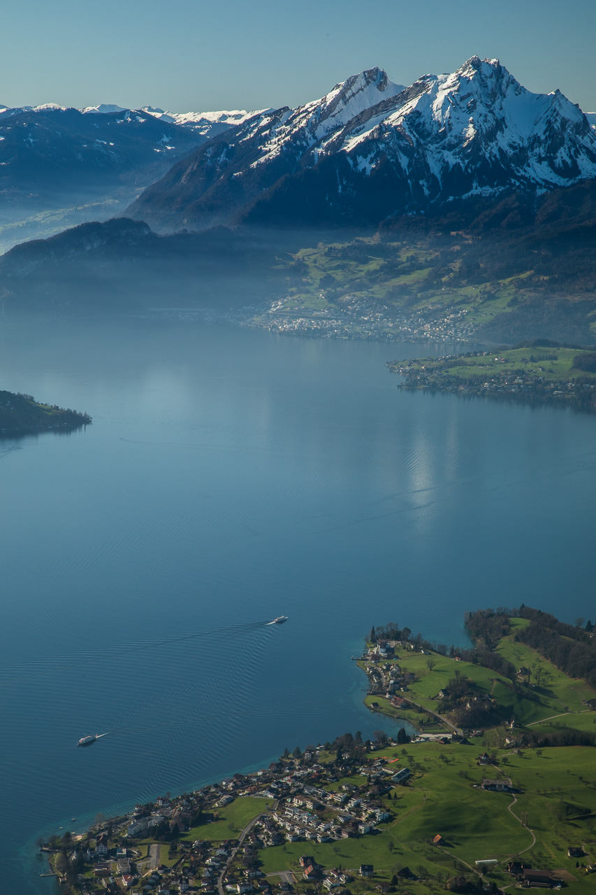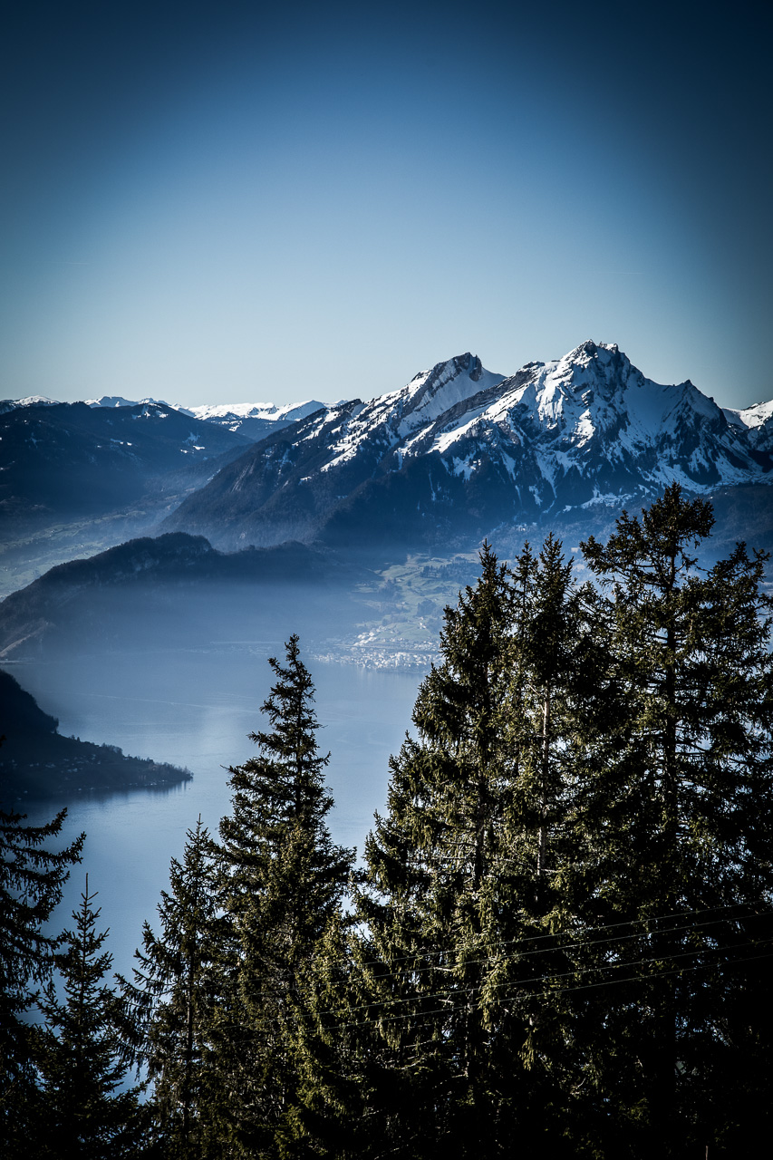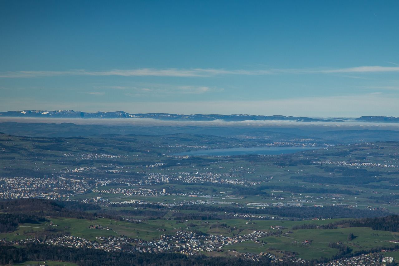 Mit gemütlichen 12 km/h tuckern wir also nach Rigi Kaltbad und steigen dort aus. Entgegen dem Namen bietet das Wasser im von Mario Botta gebauten Spa eine angenehme Temperatur von 35°C. Uns zieht es jedoch zum Känzeli, dem Aussichtspunkt bei Kaltbad. Ein Spazierweg, nicht mal ein Kilometer lang, führt uns zu einer sensationellen Aussicht. Die halbe Innerschweiz liegt uns zu Füssen: Der Pilatus, das Stanserhorn, der Bürgenstock, der Vierwaldstättersee, das Buochserhorn, Luzern und das halbe Mittelland. Im Hintergrund erhebt sich die Jurakette mit der schneebedeckten Kuppe des Chasseral.