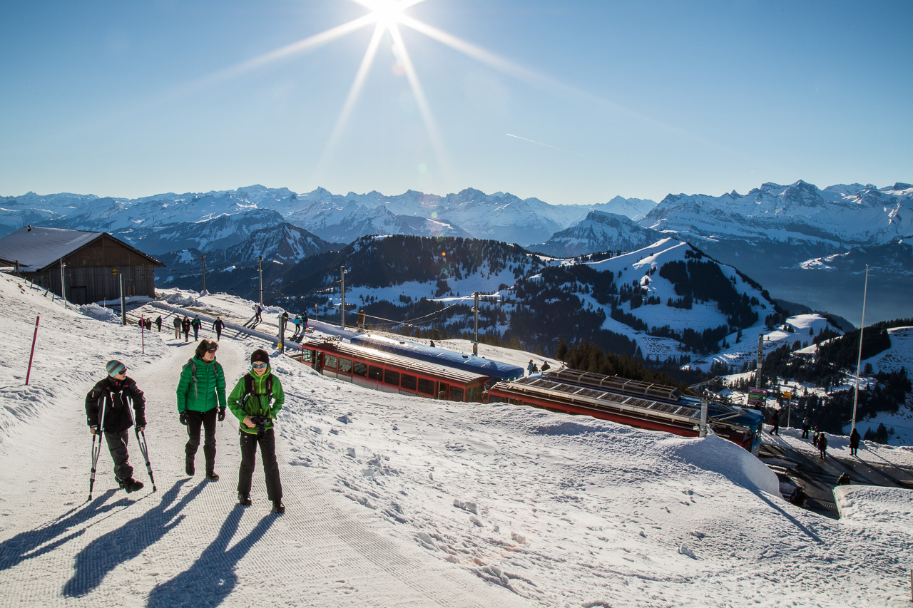 Gemütlich tuckern wir im Zug hoch. Dank der Zahnradtechnik gewinnen wir schnell an Höhe. Die Vitznau-Rigi-Bahn war die erste Zahnradbahn in Europa und wurde 1871 eröffnet. Unterwegs hält der Zug immer wieder einen kurzen Moment. Was ist da los? Eine Zugbegleiterin wirft jeweils die Post in die Briefkästen, die gegen die Bahnstrecke gerichtet sind. Amüsiert verfolgen wir das Schauspiel. Unterhalb Rigi-Kaltbad liegt allmählich eine geschlossene Schneedecke.