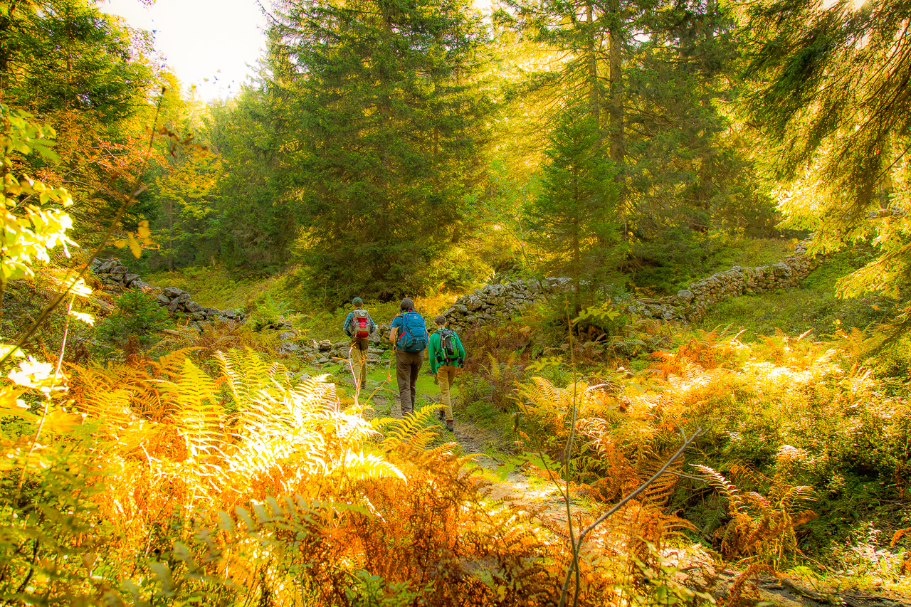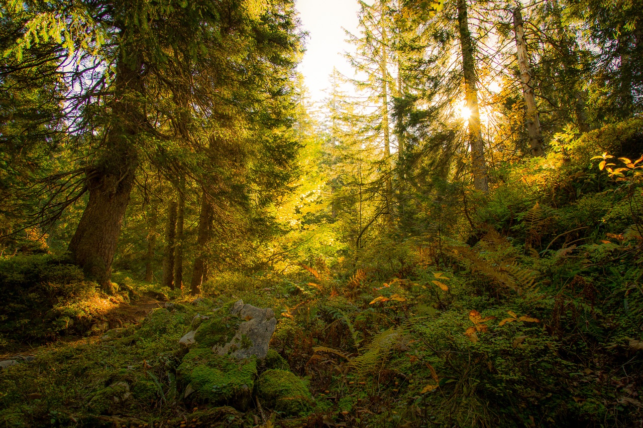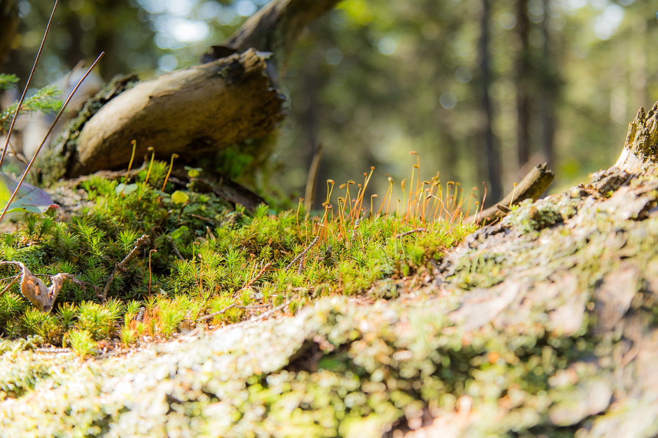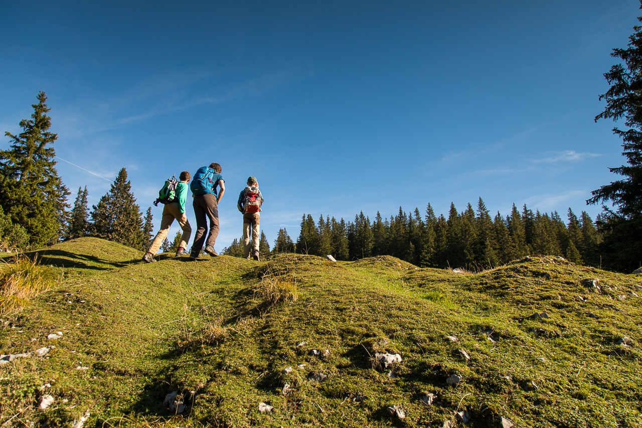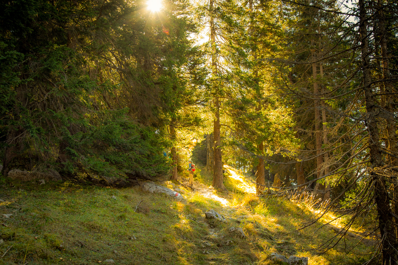 Bei der Talstation der Gamplüt-Seilbahn steigen wir ein Tobel hoch. Die Temperatur ist angenehm, weder schwitzt man noch friert man. Irgendwo lacht ein Grünspecht. Wir queren eine Weide und steigen weiter hoch durch den Wald. Wir sind alleine unterwegs und geniessen die schöne Stimmung. Plötzlich hören wir ein Gurren. Da müssen wieder irgendwo Birkhühner sein! Wir verstummen, schauen angestrengt, horchen. Leider sehen wir sie auch diesmal nicht.