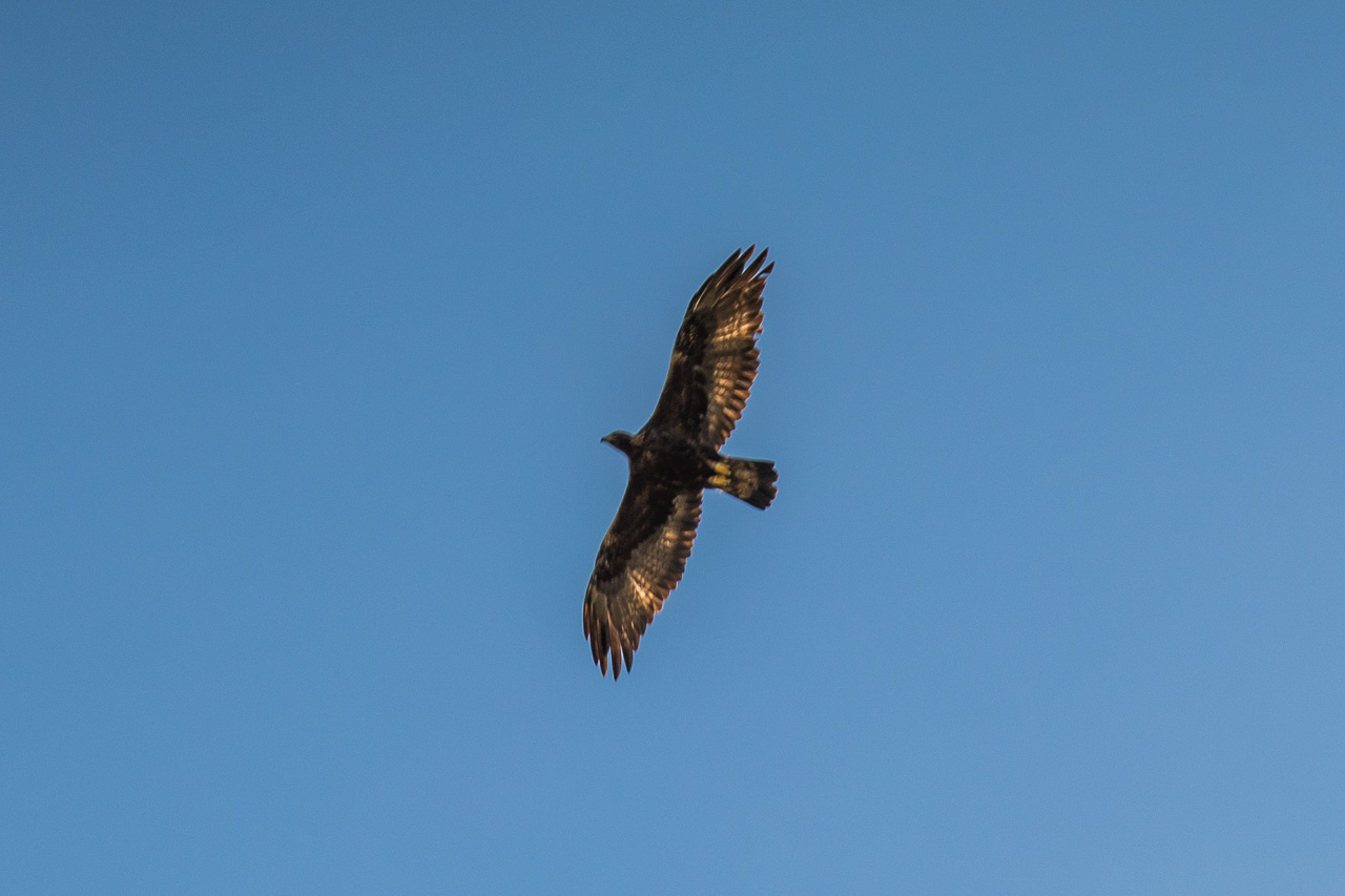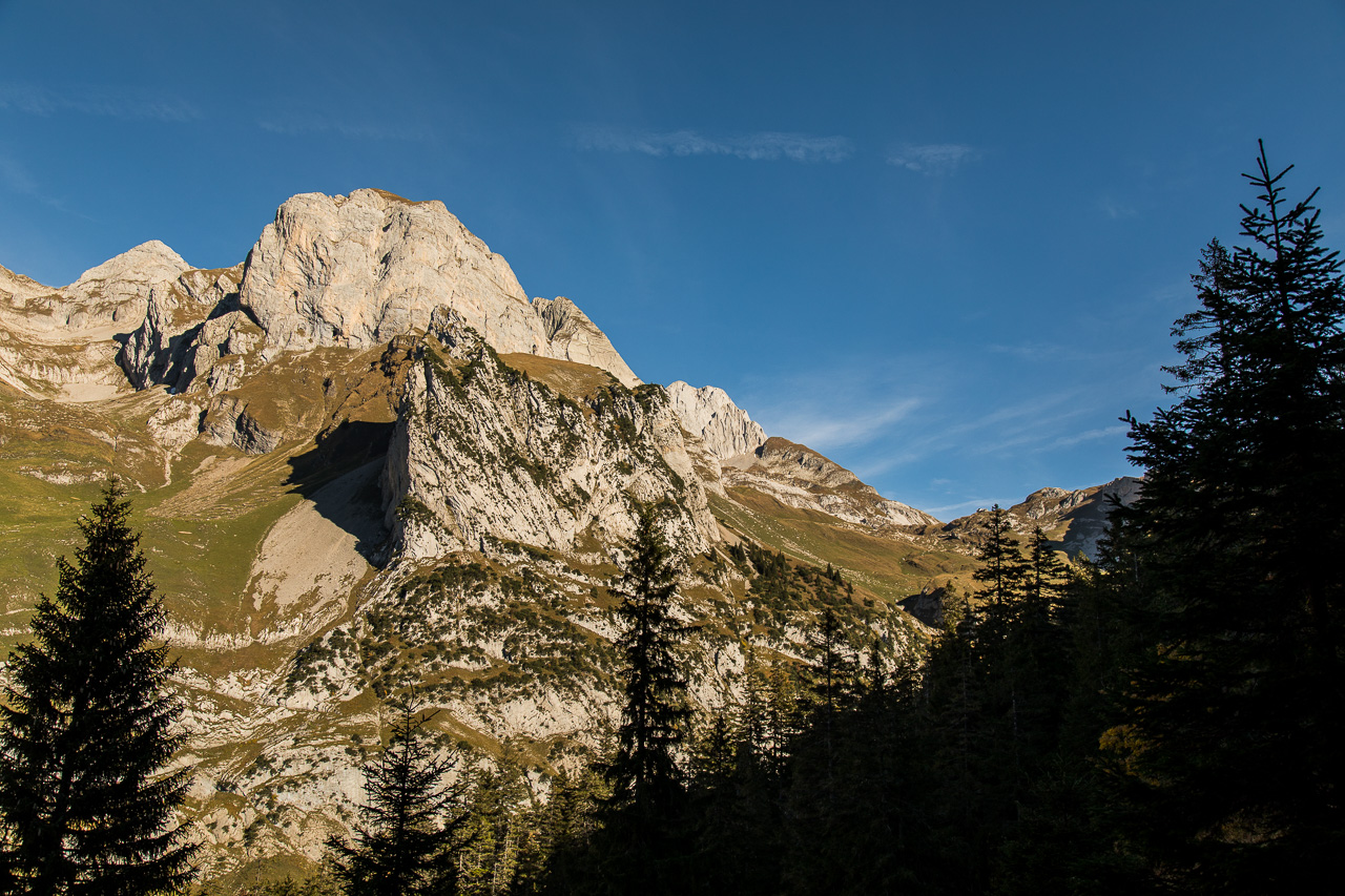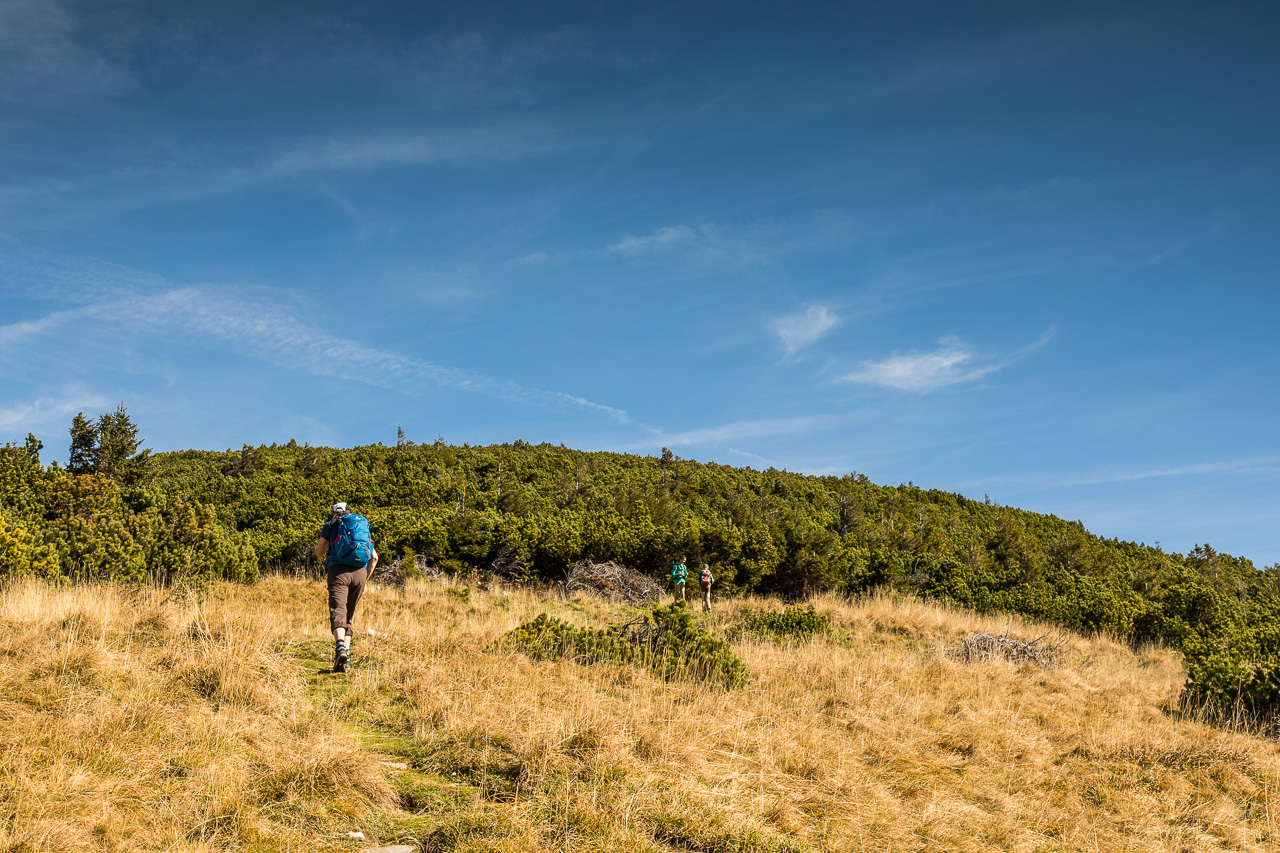 Und plötzlich kommt er: Ein Steinadler fliegt niedrig über uns hinweg! Was für ein majestätischer Anblick! Eskortiert wird er von einer Schar Alpendohlen, die krächzend ihren Unmut über dessen Anwesenheit kundtun. Der Weg führt nun durch niederen Legföhrenwald, in den Ostalpen bekannt als Latschenkiefern. Dabei handelt es sich um Bergkiefern, die durch die Höhe in ihrem Höhenwachstum limitiert sind. Zwischendurch gibt es wieder Lücken, die den Blick freigeben. Kurz vor dem Gipfel gibt es gar keine Legföhren mehr, nur noch Gras. Gegen Süden fällt die Wand senkrecht ab, wir halten uns etwas vom Rand fern.