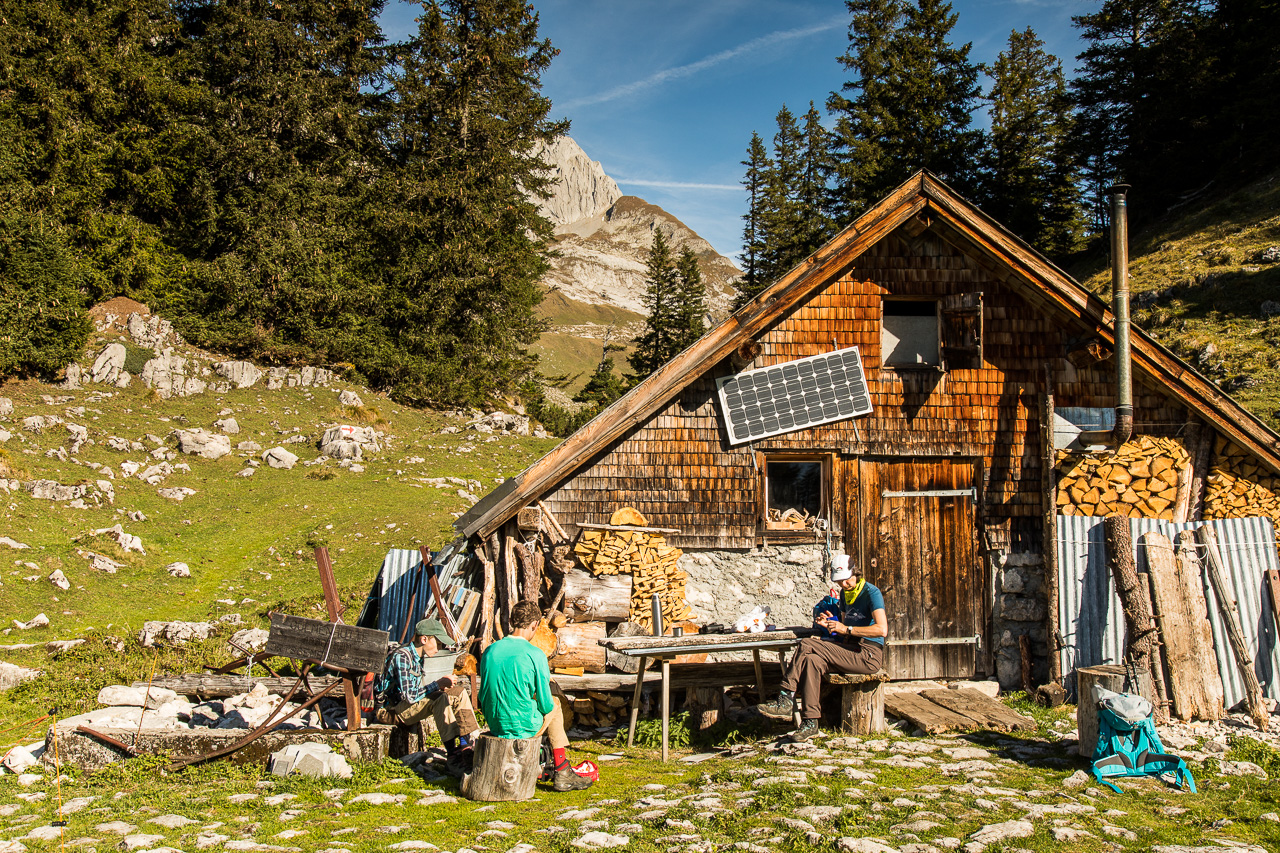 Wir erreichen auf einer Lichtung die Gulmenhütte, die um diese Jahreszeit bereits verlassen ist. Das hält uns aber nicht von einer ausgiebigen Pause ab. Nebenbei versuchen wir die Vögel zu identifizieren, die überall in den Bäumen zwitschern und herumturnen. Gar keine einfache Sache, so auf Distanz und bei dem Licht. Wir kommen aber zum Schluss, dass es sich um Fichtenkreuzschnäbel handeln muss.