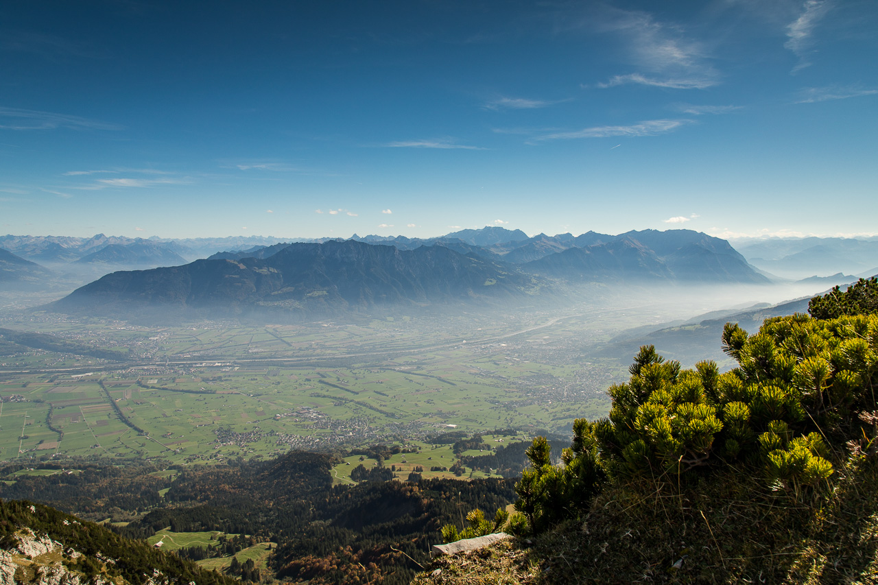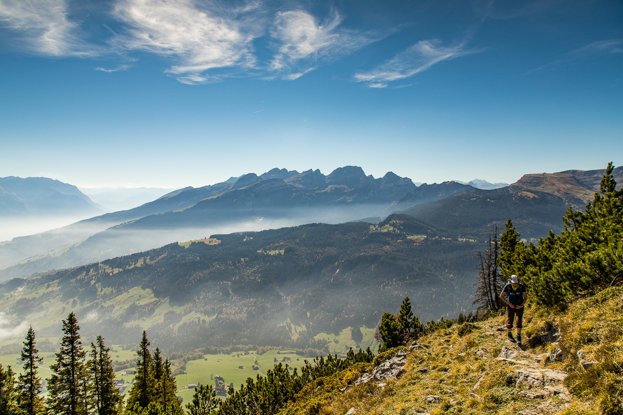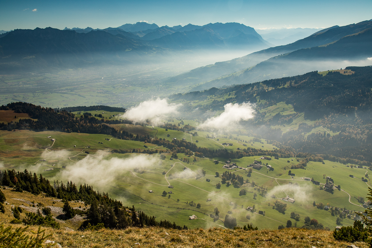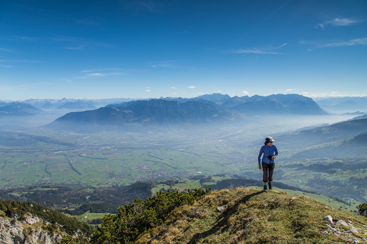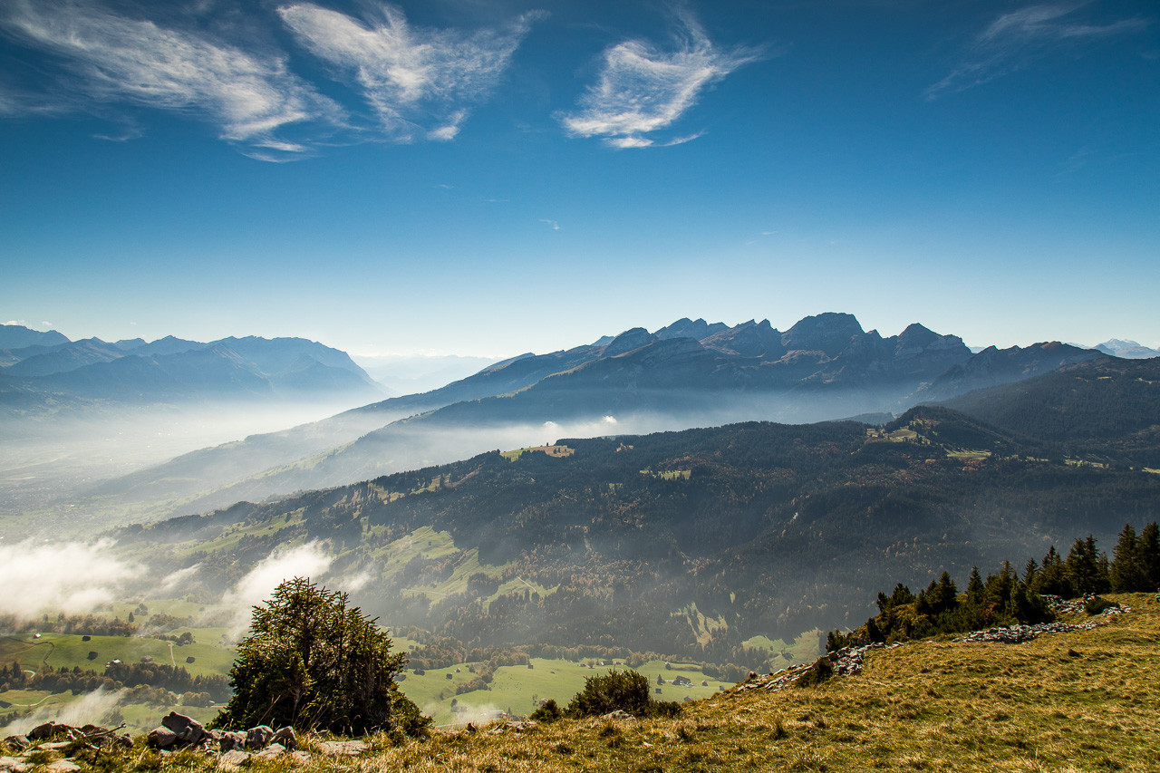 Nach der Pause erreichen wir bald die Waldgrenze, was uns den Blick in die Weite öffnet. Das Rheintal kommt ins Blickfeld, ebenso die Berge in Liechtenstein und Österreich. Unter uns ziehen kleine Wölkchen vorbei. Wir fühlen uns ein bisschen wie in einem Flugzeug.