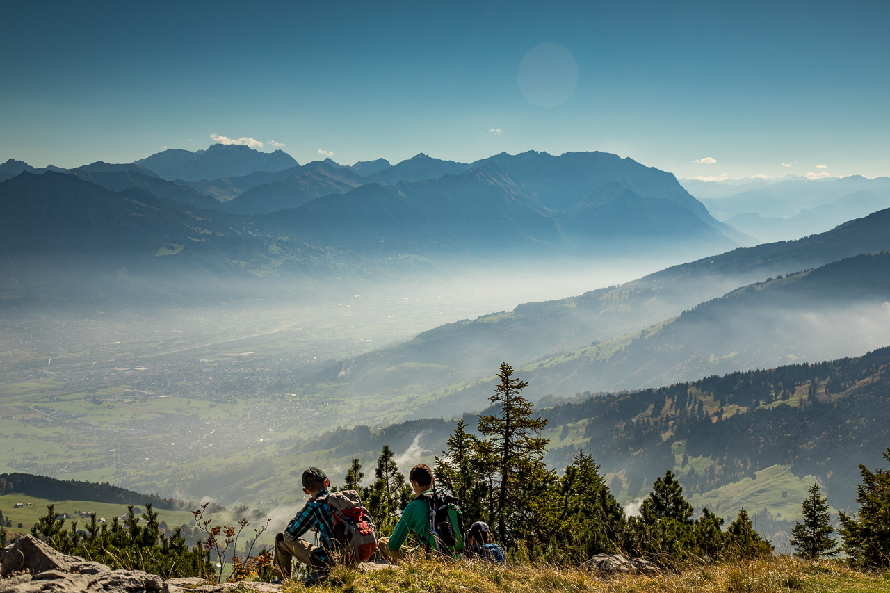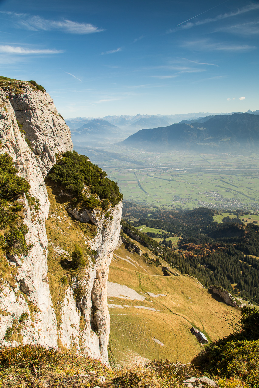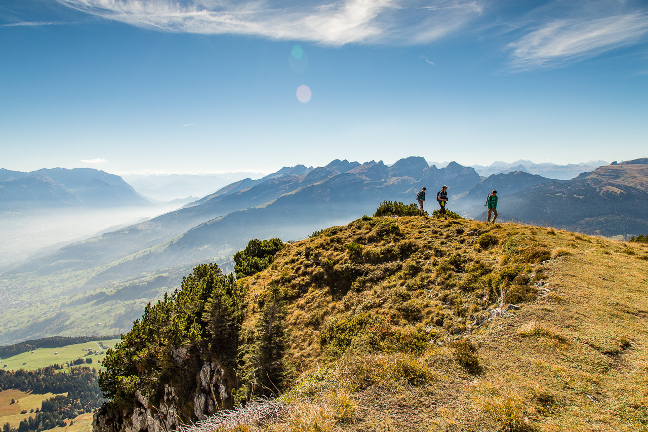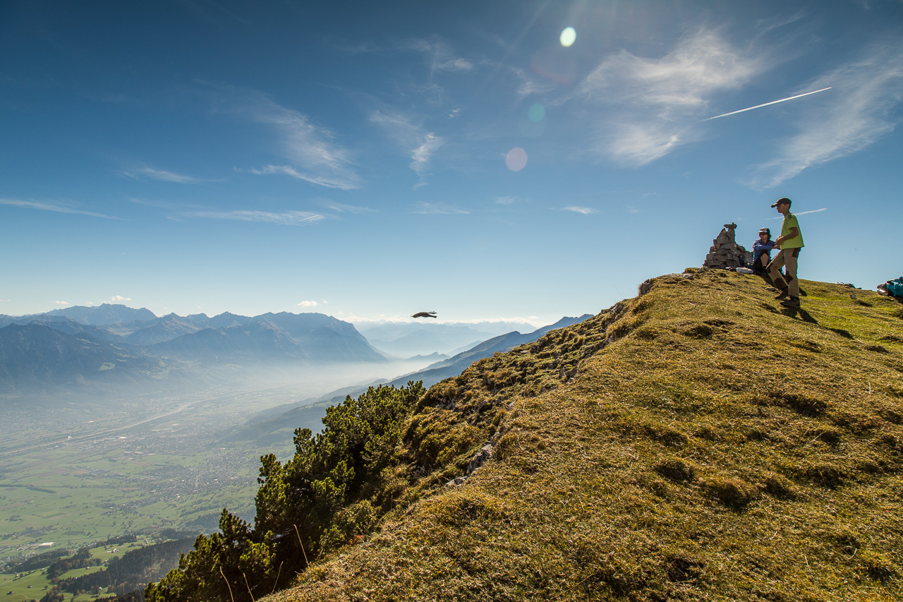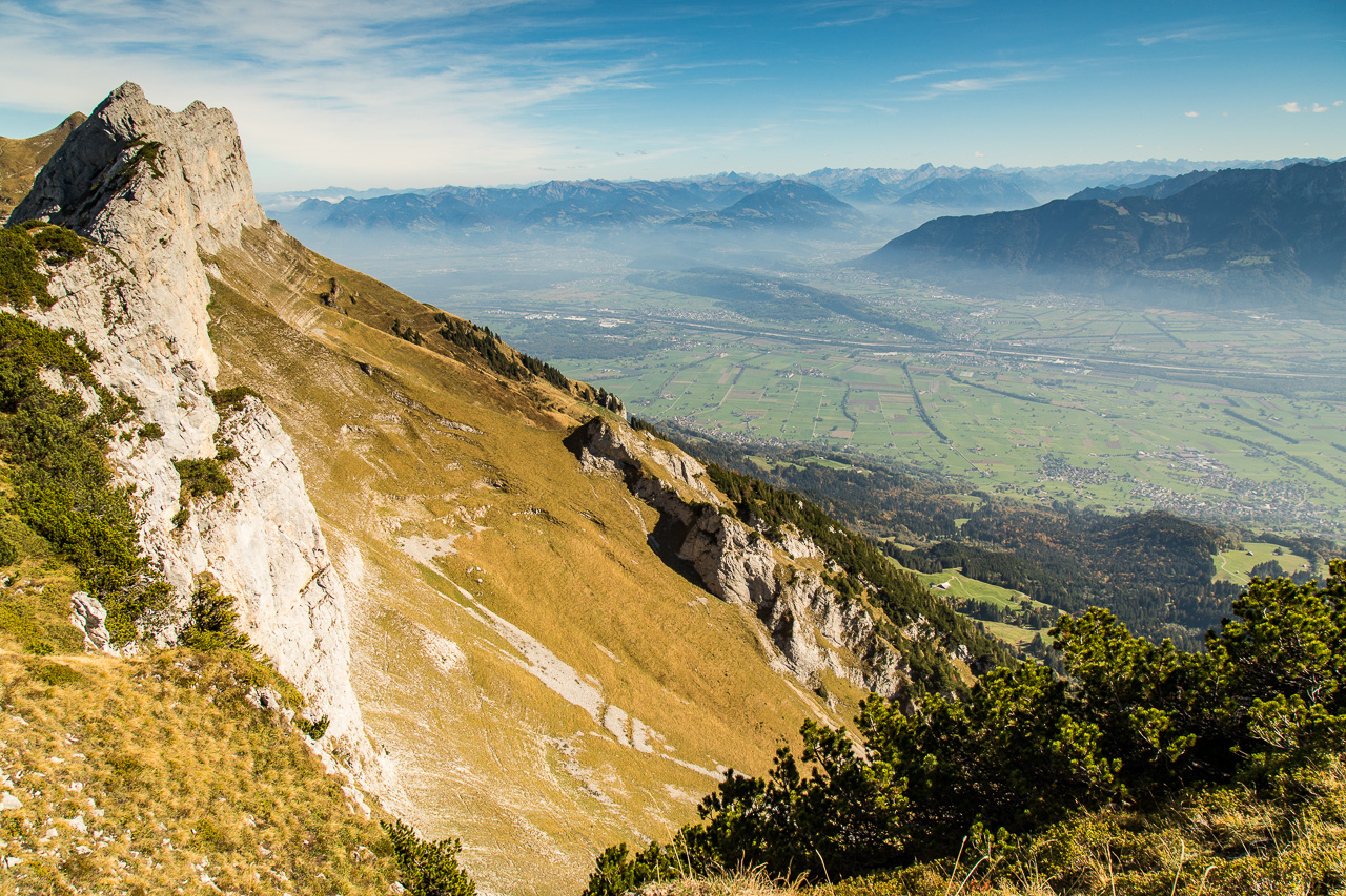 Nach der Pause erreichen wir bald die Waldgrenze, was uns den Blick in die Weite öffnet. Das Rheintal kommt ins Blickfeld, ebenso die Berge in Liechtenstein und Österreich. Unter uns ziehen kleine Wölkchen vorbei. Wir fühlen uns ein bisschen wie in einem Flugzeug.