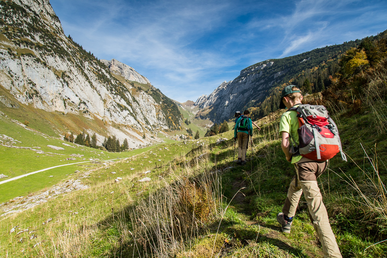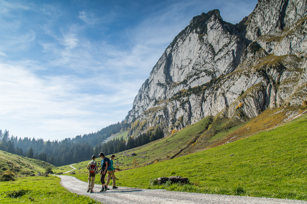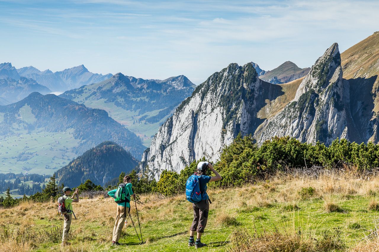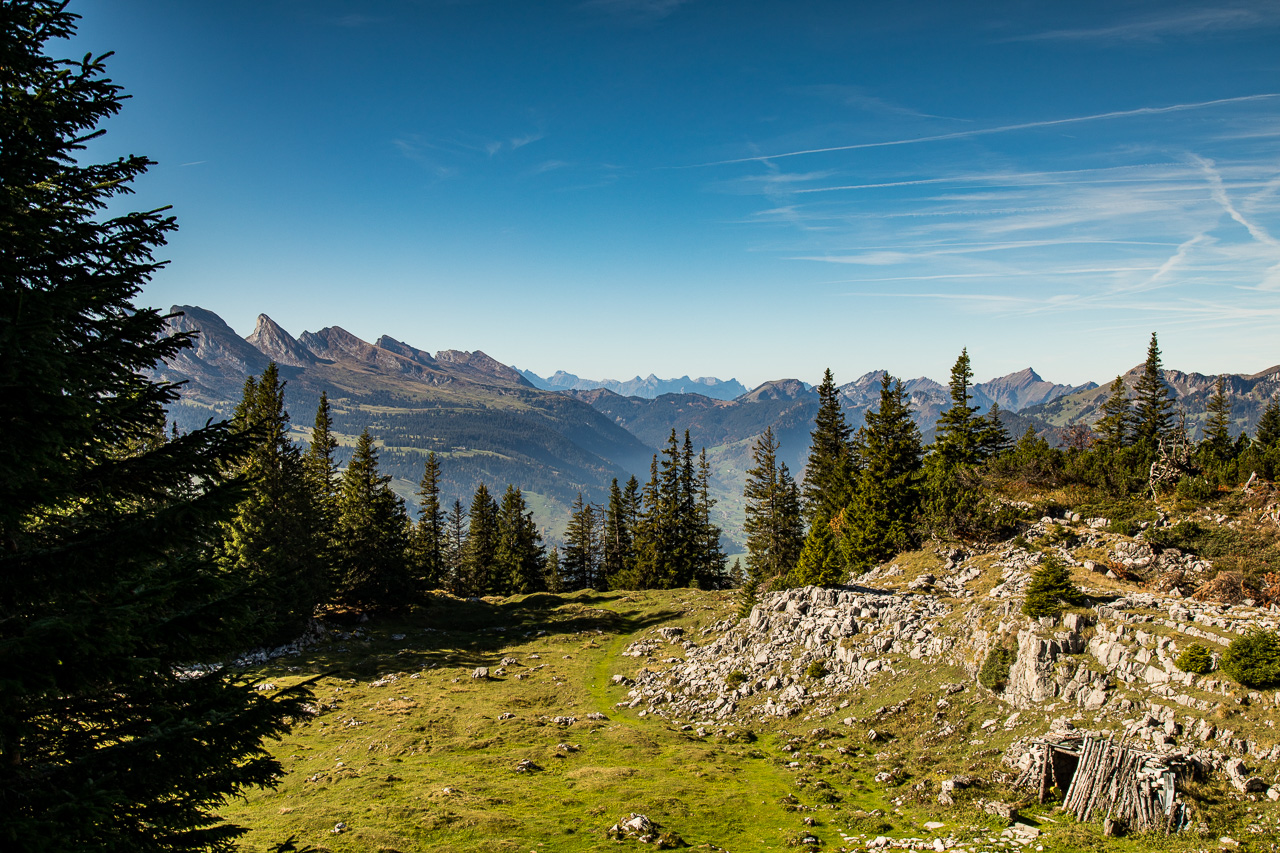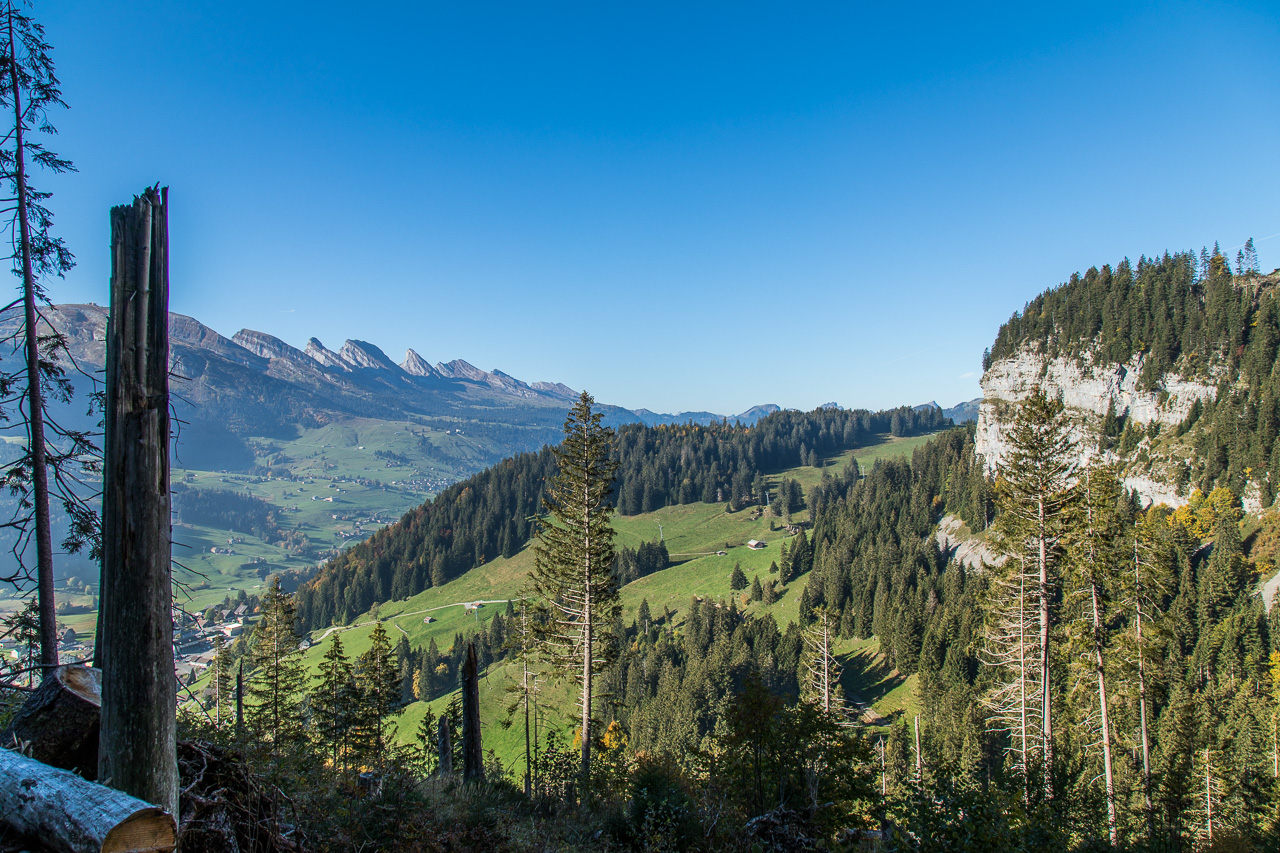 Nach der Pause erreichen wir bald die Waldgrenze, was uns den Blick in die Weite öffnet. Das Rheintal kommt ins Blickfeld, ebenso die Berge in Liechtenstein und Österreich. Unter uns ziehen kleine Wölkchen vorbei. Wir fühlen uns ein bisschen wie in einem Flugzeug.