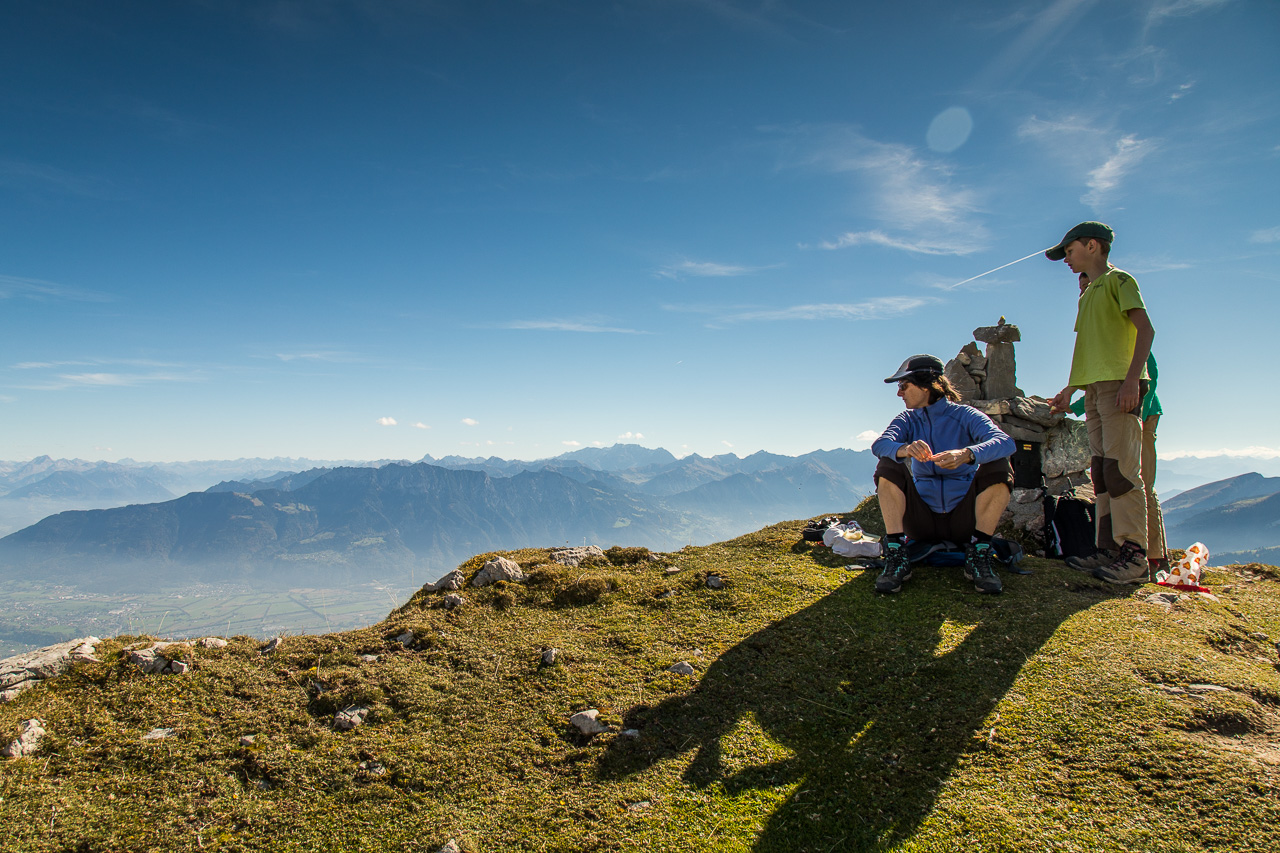 Nur noch wenige Meter, dann sind wir auf dem Gipfel. Wenn ich die Hand hebe, ist sie auf 2000 Meter, denn der Gipfel ist knapp darunter, 1998 Meter über dem Meeresspiegel liegt er. Wir geniessen die Aussicht und die Ruhe, wir sind ganz alleine, wie schon während der ganzen Wanderung.
