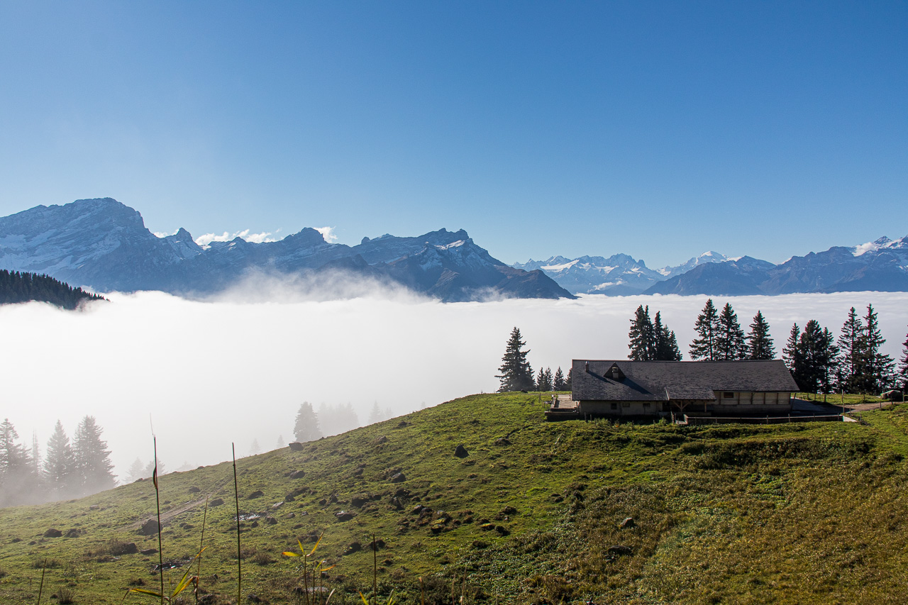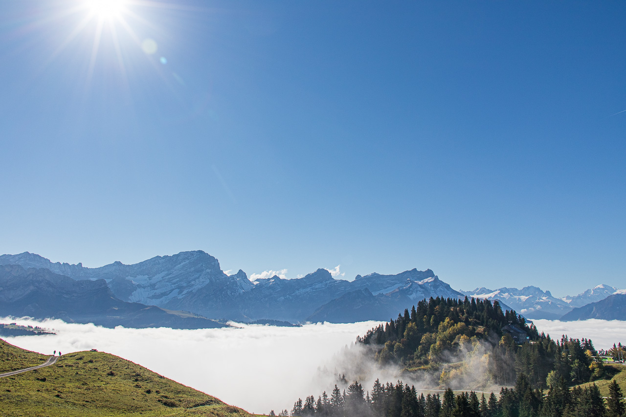 Fabian war schon ein paar Mal auf dem Bike in diesen Ferien in Villars-sur-Ollon. Zeit, dass auch die Frau und ich unsere Karbonrösser satteln. Über den Col de Bretaye, den wir auf unterschiedlichen Wegen erreichten, fuhren wir zum Col de la Croix und nach Taveyanne. Das Nebelmeer gab der Biketour einen ganz besonderen Reiz – solange wir darüber waren.