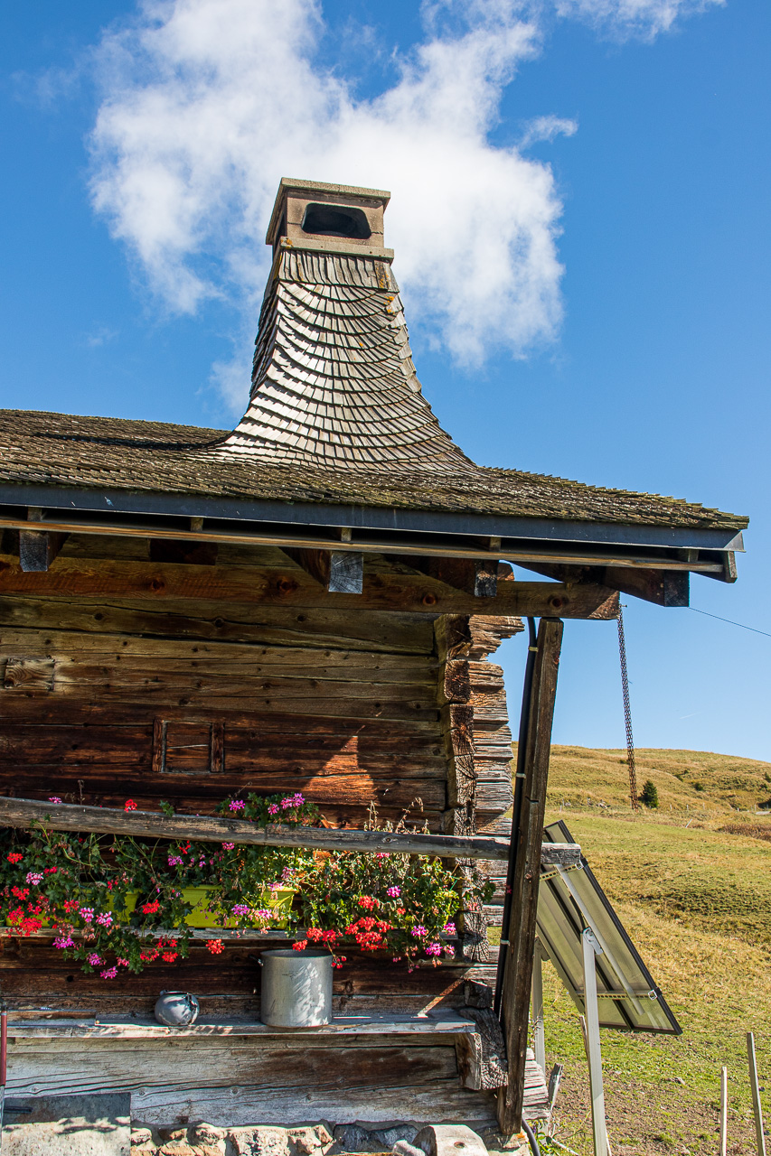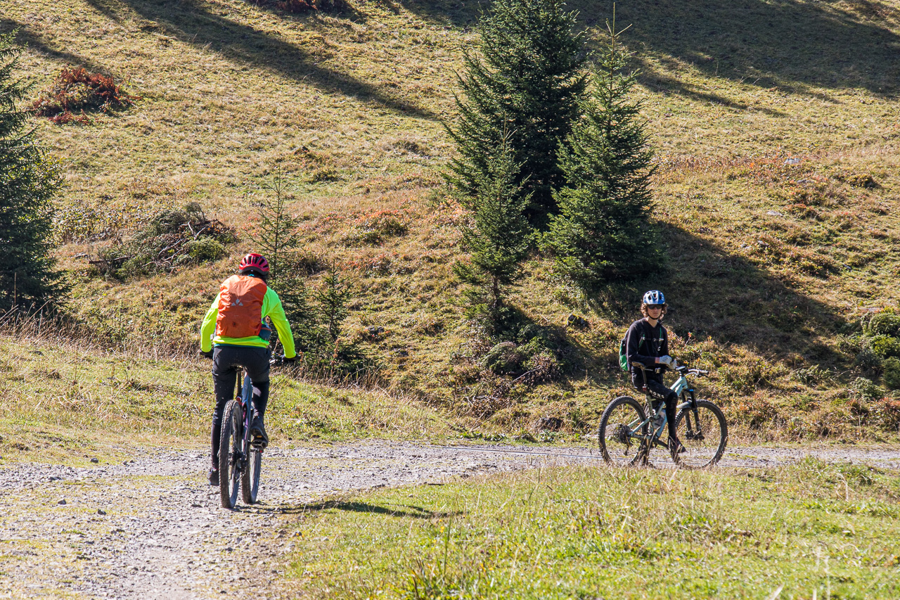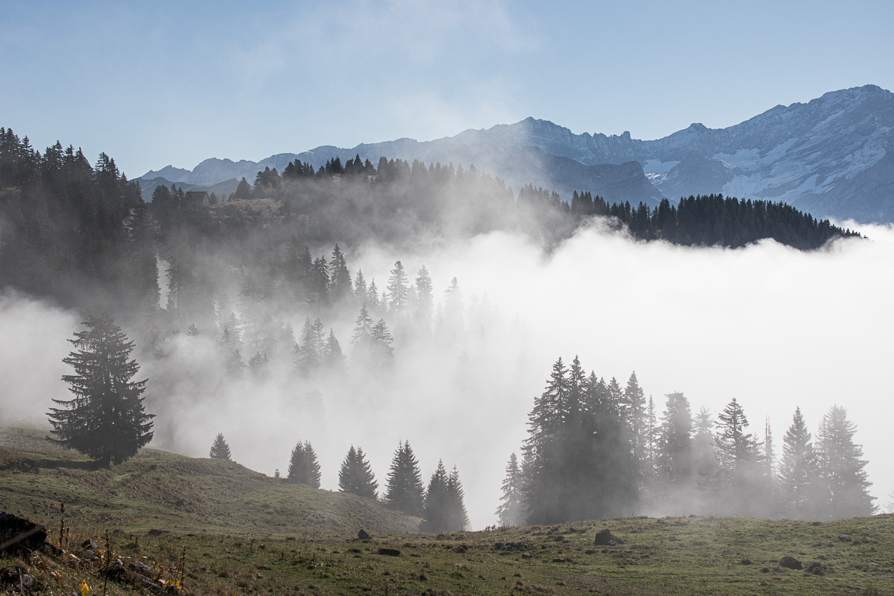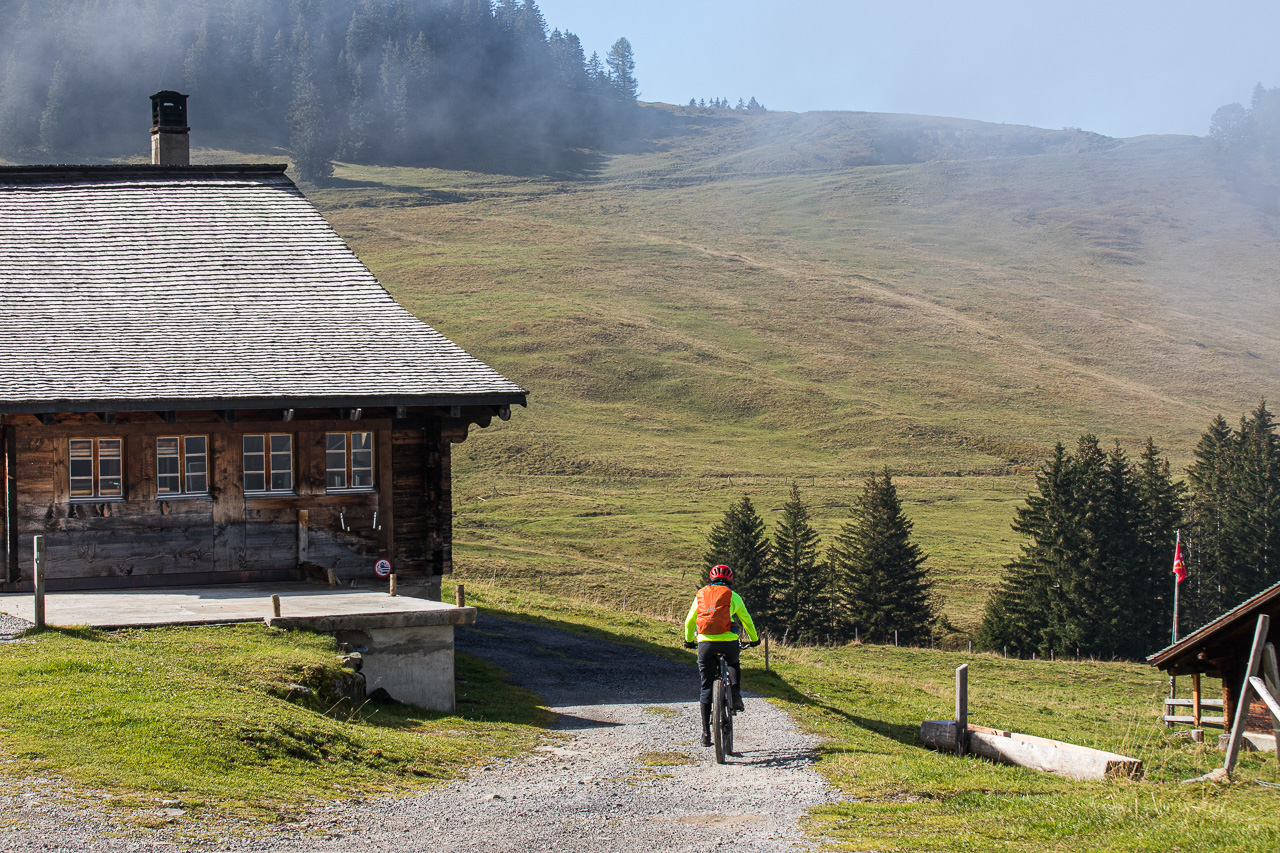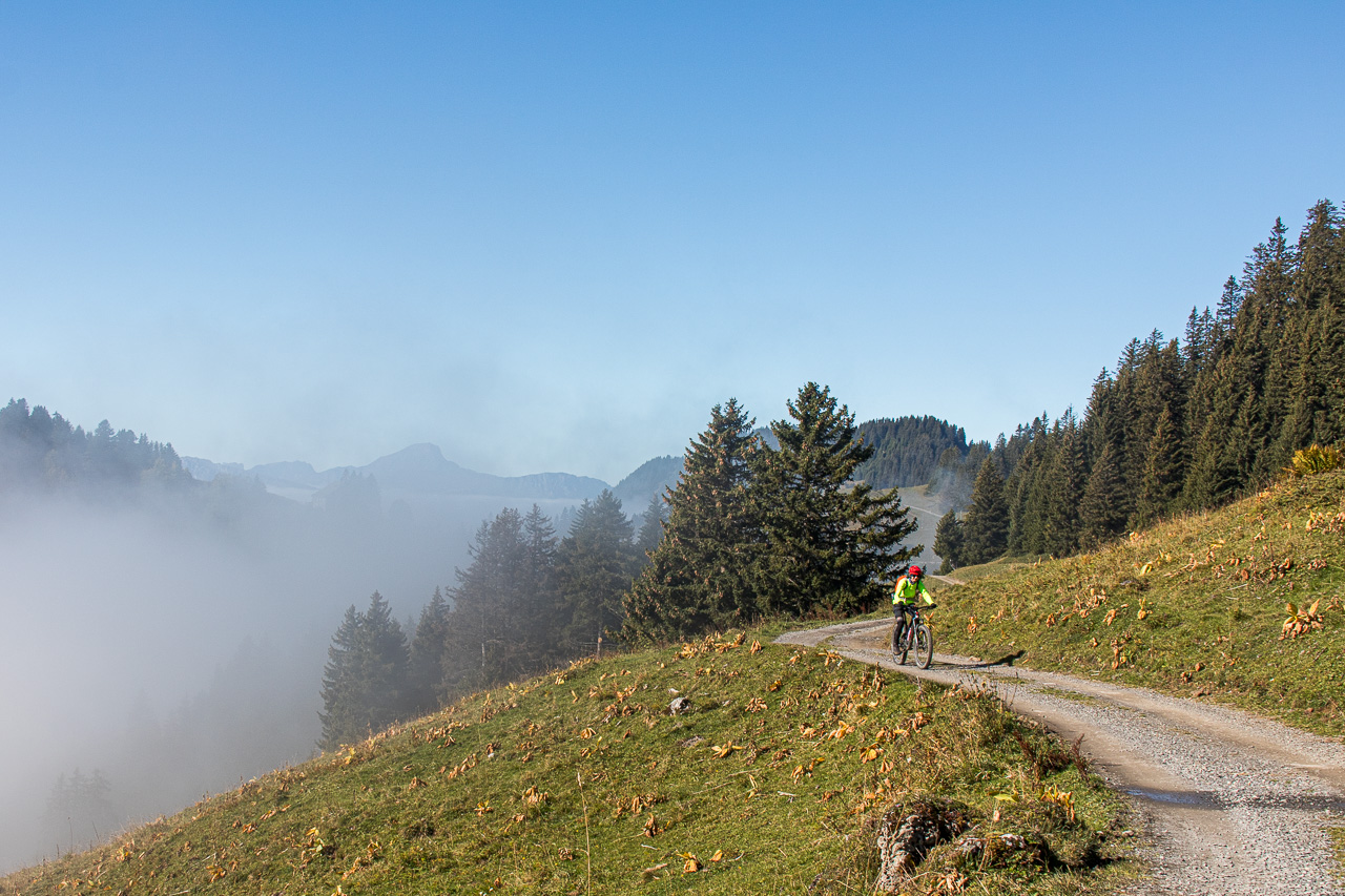 Gemütlich fahren wir auf der Alpstrasse abwärts und zwischendurch auch ein wenig aufwärts. Bei Punkt 1780 trennen wir uns, Fabian fährt den Singletrail, die Frau und ich bleiben auf der Strasse. Dass Nebel alles andere als statisch ist, bekommen wir hier wieder zu spüren, wir sind immer so am Rand davon. Beim Weiler Ensex treffen wir uns wieder, ein idealer Ort für eine Rast. Wir geniessen die Sonne und die angenehmen Temperaturen.