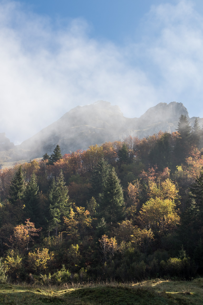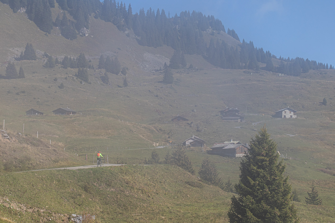 Wir fahren abwärts zum Col de la Croix. Es ist zwar eine Alpstrasse, macht aber fast so viel Spass wie ein Singletrail. Nach der Passstrasse rollen wir in den Talkessel von Gryonne, der noch halb im Schatten liegt, Nebelfetzen ziehen durch die Landschaft, dahinter erheben sich die mächtigen Vorbauten der Diablerets. Im Schatten fahren wir aufwärts nach Taveyanne.
