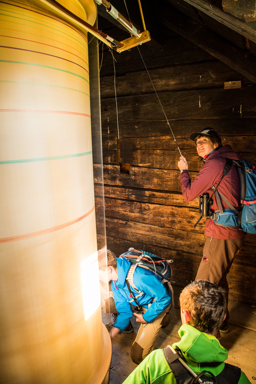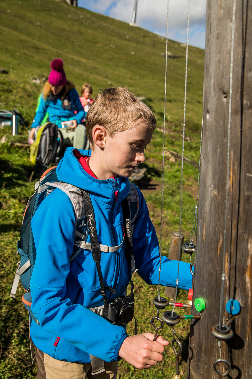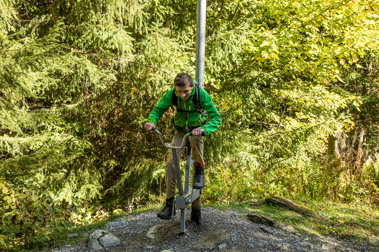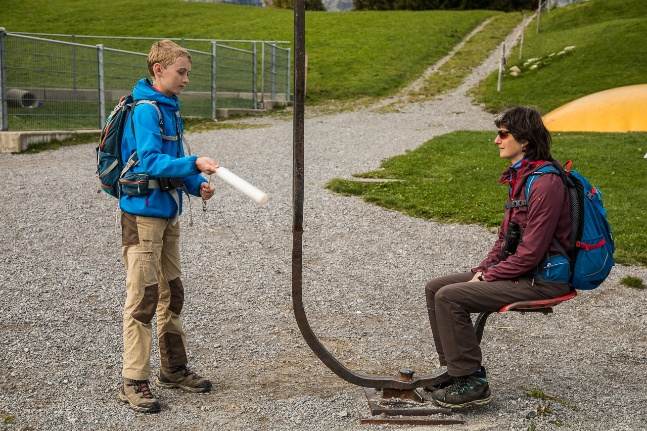 Nach diesem Abstecher besteigen wir in Unterwasser die alte Standseilbahn und lassen uns nach Iltios chauffieren. Mit fest geschnürten Wanderschuhen machen wir uns nun auf den Klangweg. Das erste Instrument ist so gross, dass es ein eigenes Häuschen hat: Die Klangmühle. Das turmhohe Instrument wird von zwei Personen bedient und gibt mystische Klänge von sich. Ein besonderer Spass für unsere Jungs ist das Heulvelo: Mit einem Fahrrad wird ein senkrechtes Gestänge angetrieben, das Luftschläuche in Bewegung setzt und je nach Geschwindigkeit verschiedene hohe Töne produziert. Das Prinzip kennt man vom Blasen an einer Flasche.