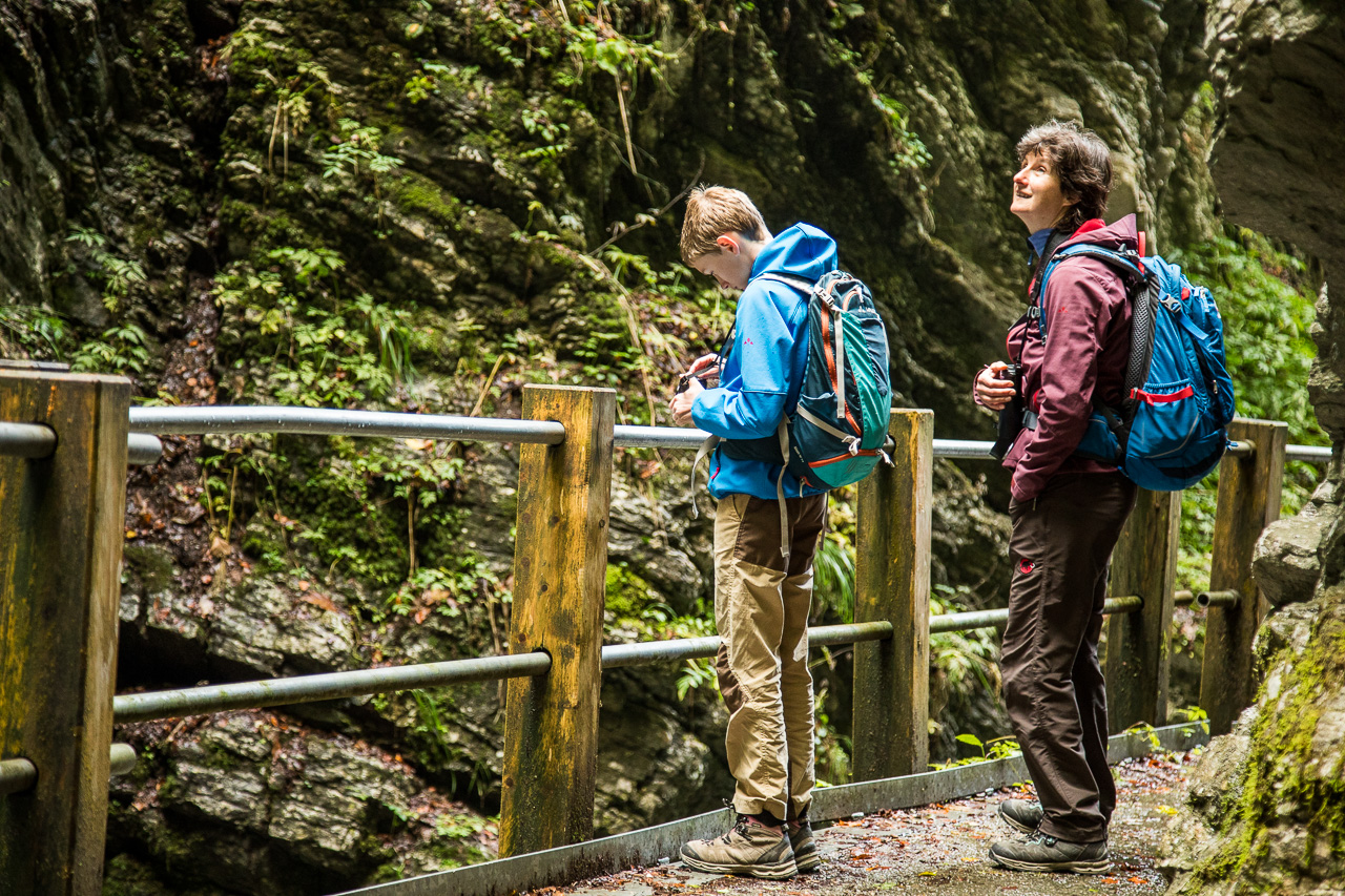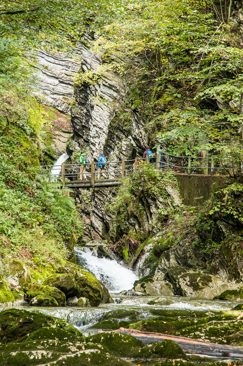 Zum Klangweg wählten wir einen kleinen Umweg von Wildhaus zu den Thurwasserfällen. In zwei Kaskaden stürzen sie sich insgesamt über 23 Meter die Felsen hinunter. Über eine Galerie kann man dieses Naturschauspiel bewundern. Sie wurde von Emil Waldburger im Jahre 1927 erbaut.