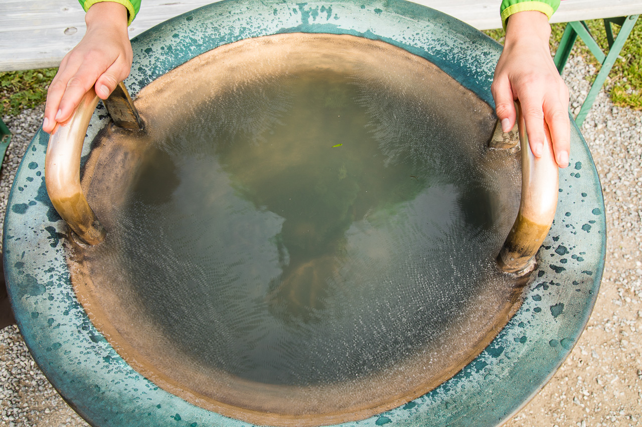 Nach den Klangpilzen trennt sich der Weg auf. Mit kleineren Kindern bleibt man auf der gleichen Höhe, wir machen eine Schlaufe zu den Schwendiseen. Das Hüpfwasser ist eine besondere Herausforderung: Wie bei einem Weinglas reibt man an zwei Griffen, bis das Wasser zu hüpfen beginnt in der Schale. Nicht jeder schaffte das.