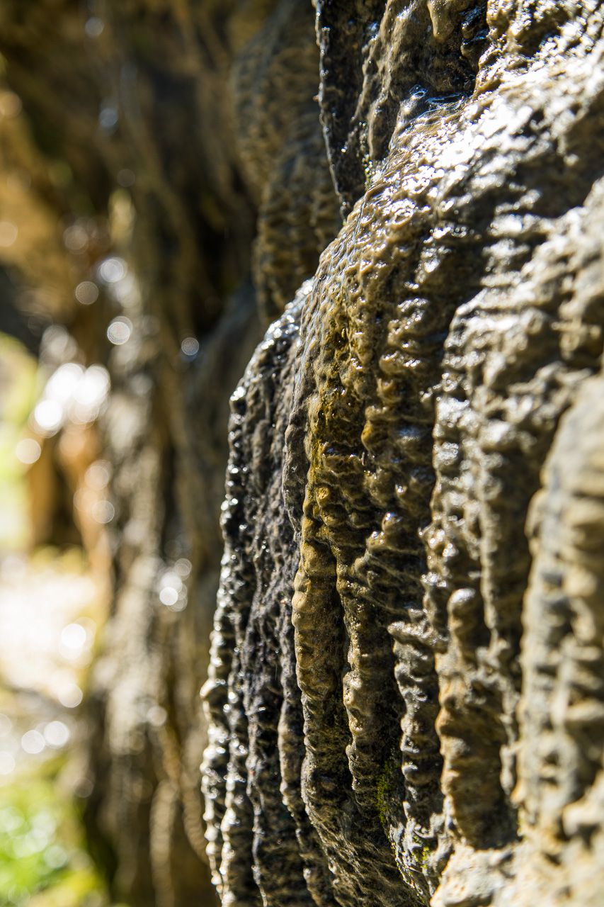 Die Route habe ich auf der Seite von Engadin Scuol Zernez gefunden. Sie wird mit 6.3 Kilometer angegeben und kehrt noch vor Sent, dem Nachbarsort von Scuol. Wir starten direkt vor der Haustür bei wunderbarem Herbstwetter. Wir wollen aber nicht einfach dem Pfeil auf dem Handy folgen, sondern zuerst in die Clozza-Schlucht mit der gleichnamigen Quelle. Die Gegend um Scuol ist reich an Mineralquellen und war früher berühmt für Trinkkuren. Schon im Aufstieg weisen Tuffablagerungen auf das mineralreiche Wasser hin. Die Quelle selber ist hinter einer Glasscheibe, unten rauscht das Wasser vorbei. Nicht besonders spektakulär. Dafür ist der weitere Weg hoch durch den Wald schön.